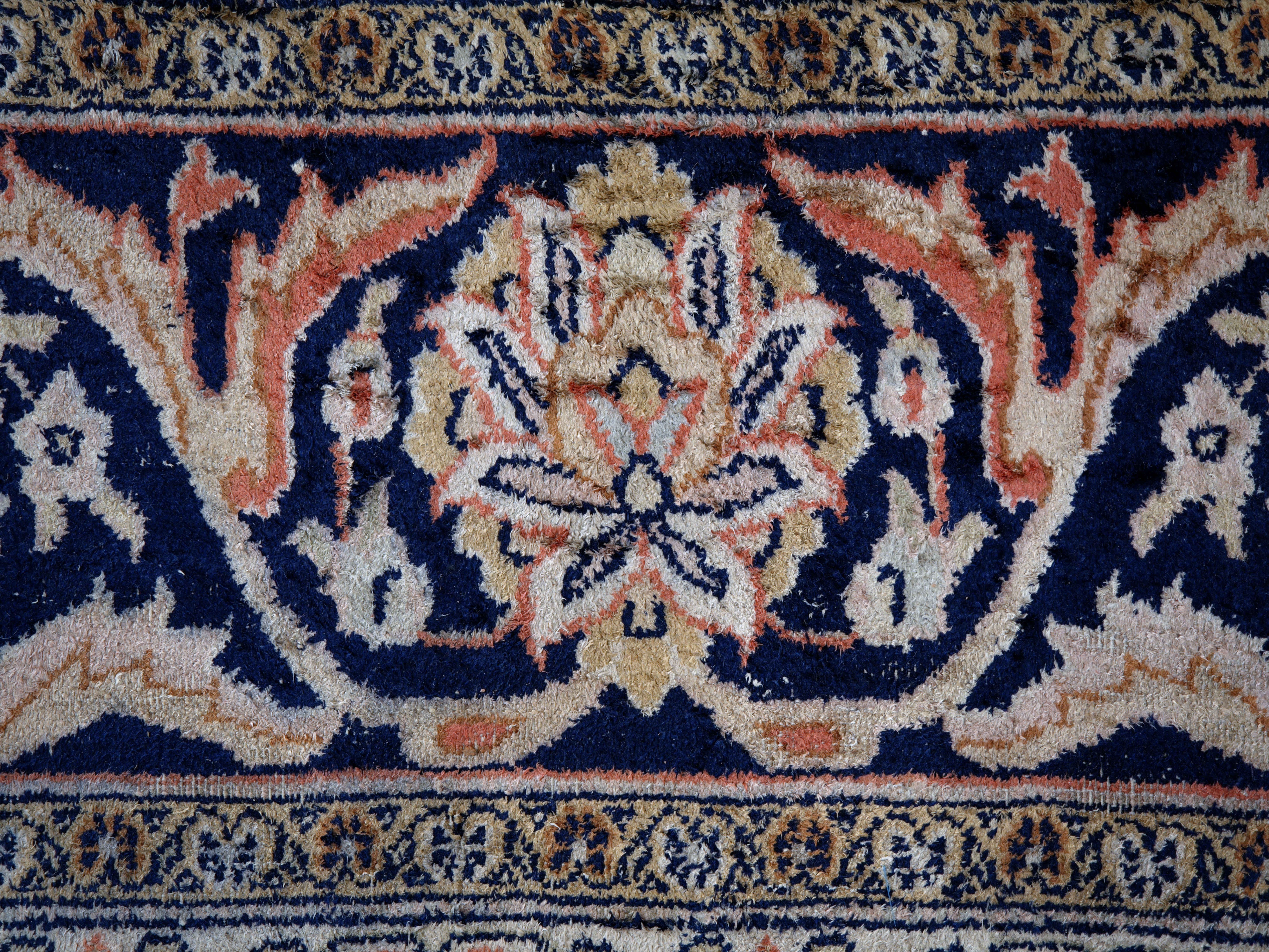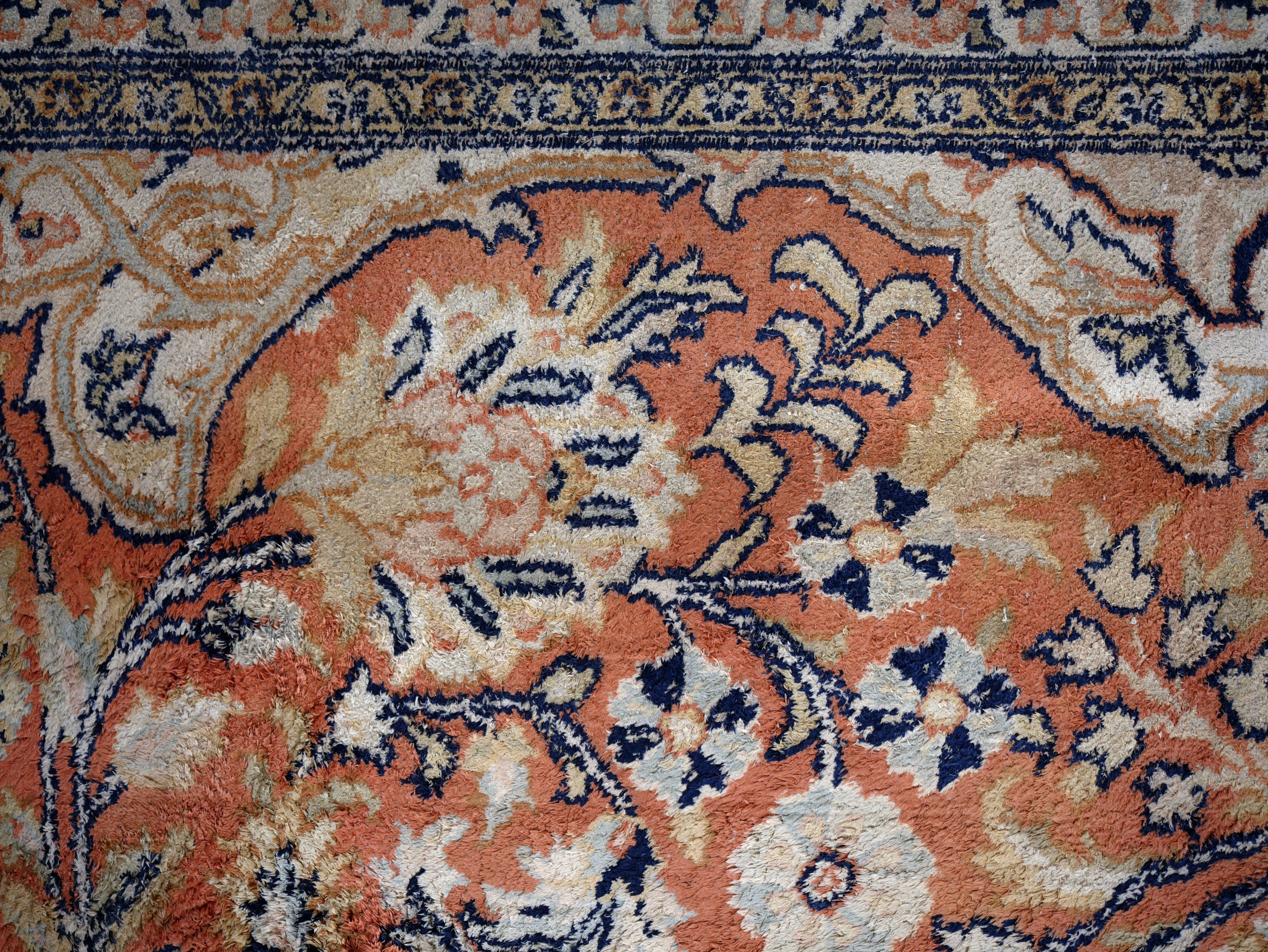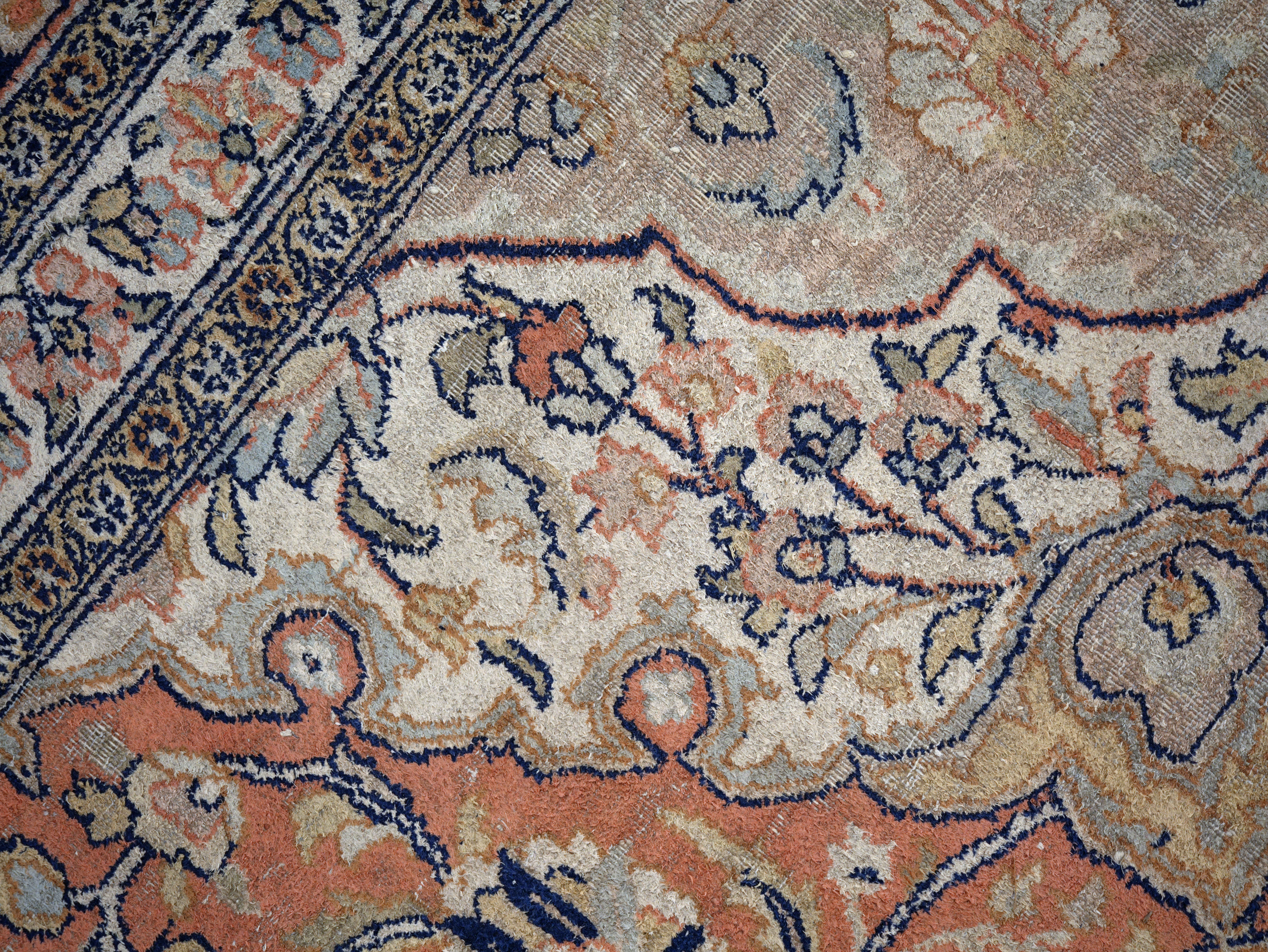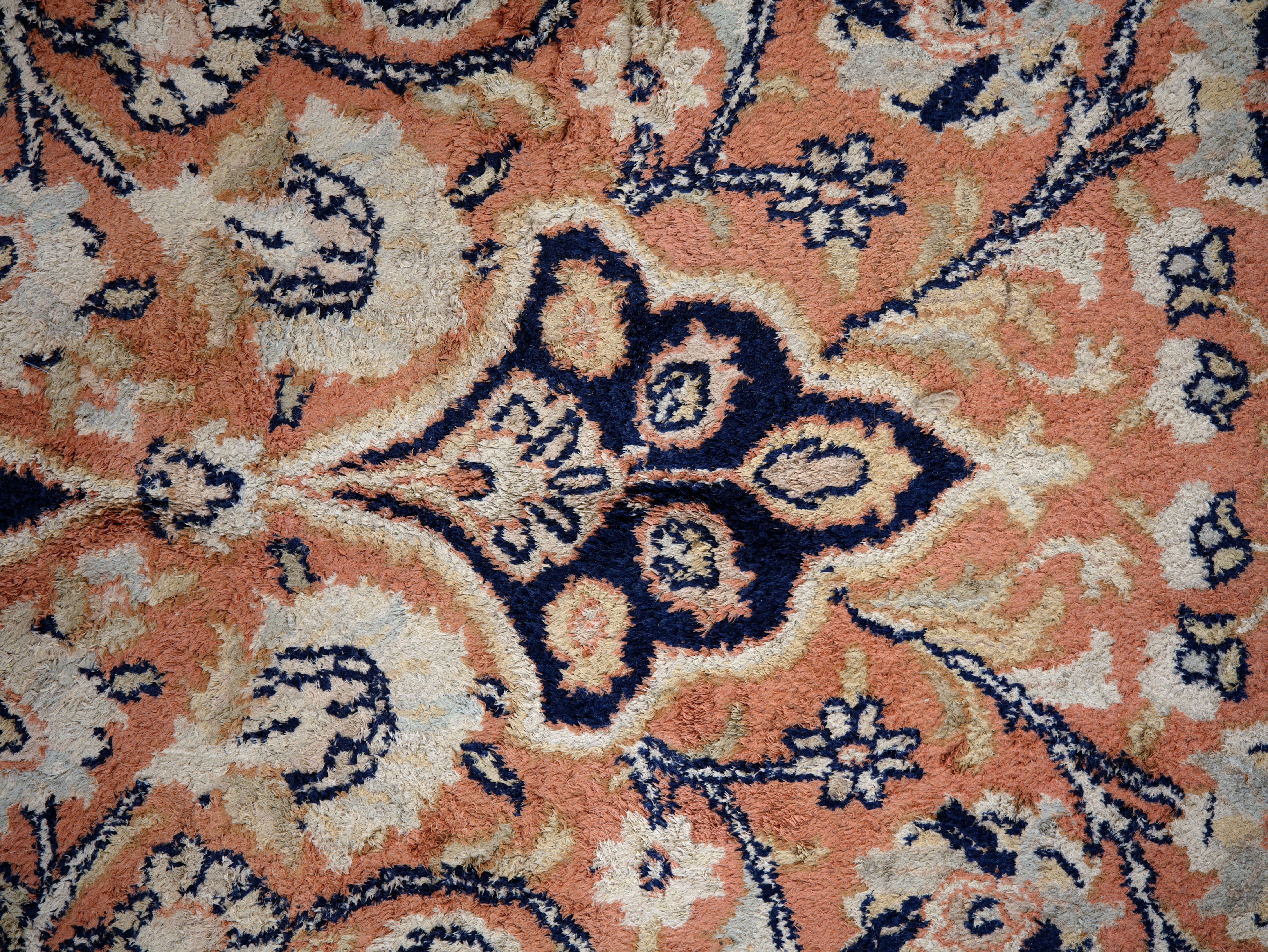 Stav je užívaný, místy patrné výraznější ochození a opotřebení vlasu, což je zohledněno v celkovém charakteru kusu. Přesto koberec působí stále velmi dekorativně a vhodně doplní interiér s důrazem na eleganci a autenticitu.