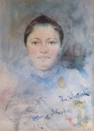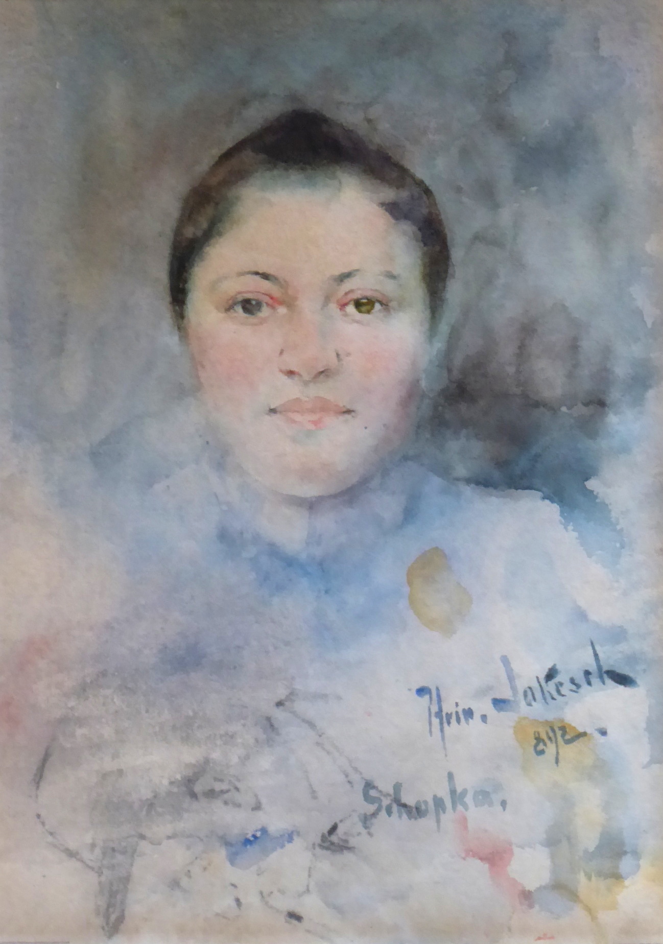 Akvarel na papíru 19 cm x 13 cm. Signováno vpravo v dolní části s názvem a datací 1892. Portrét mladé ženy s přezdívkou či jménem Schopka v pastelové barevnosti. V jednoduchém hnědém rámu se zlacenou vnitřní lištou, nově paspartováno a zaskleno. Německo, Mnichov, rok 1892. Celkový rozměr s rámem 38 cm x 32 cm.