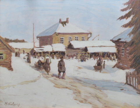 Olej na kartonu 44 cm x 58 cm. Signováno vlevo dole. Autor: Hilar Václavek (1884-1951) český malíř, krajinář, ilustrátor a grafik bojující za první světové války v legiích. Jeho pobyt na Sibiři v Tobolské gubernii ho inspiroval k vytvoření obrazu. Zasněžená vesnice s dřevěnými staveními a pouličním životem s typickými saněmi taženými koněm. Originální černý leštěný rám se zlatou tenkou vnitřní lištou. Sibiř 1915 – 1918. Celkový rozměr s rámem 55,5 cm x 69,5 cm.