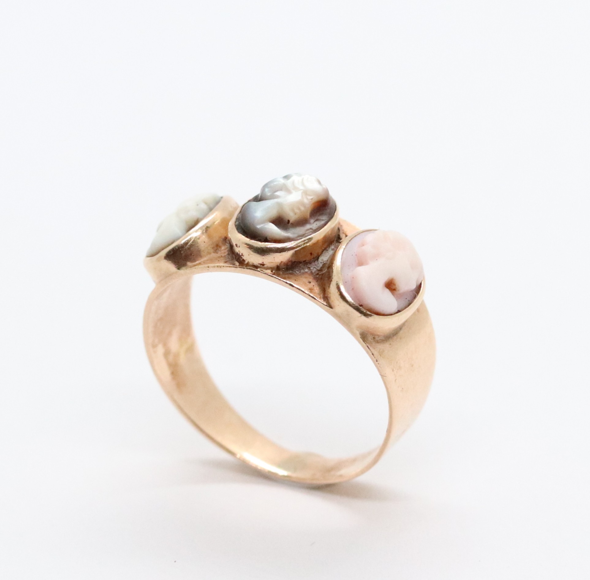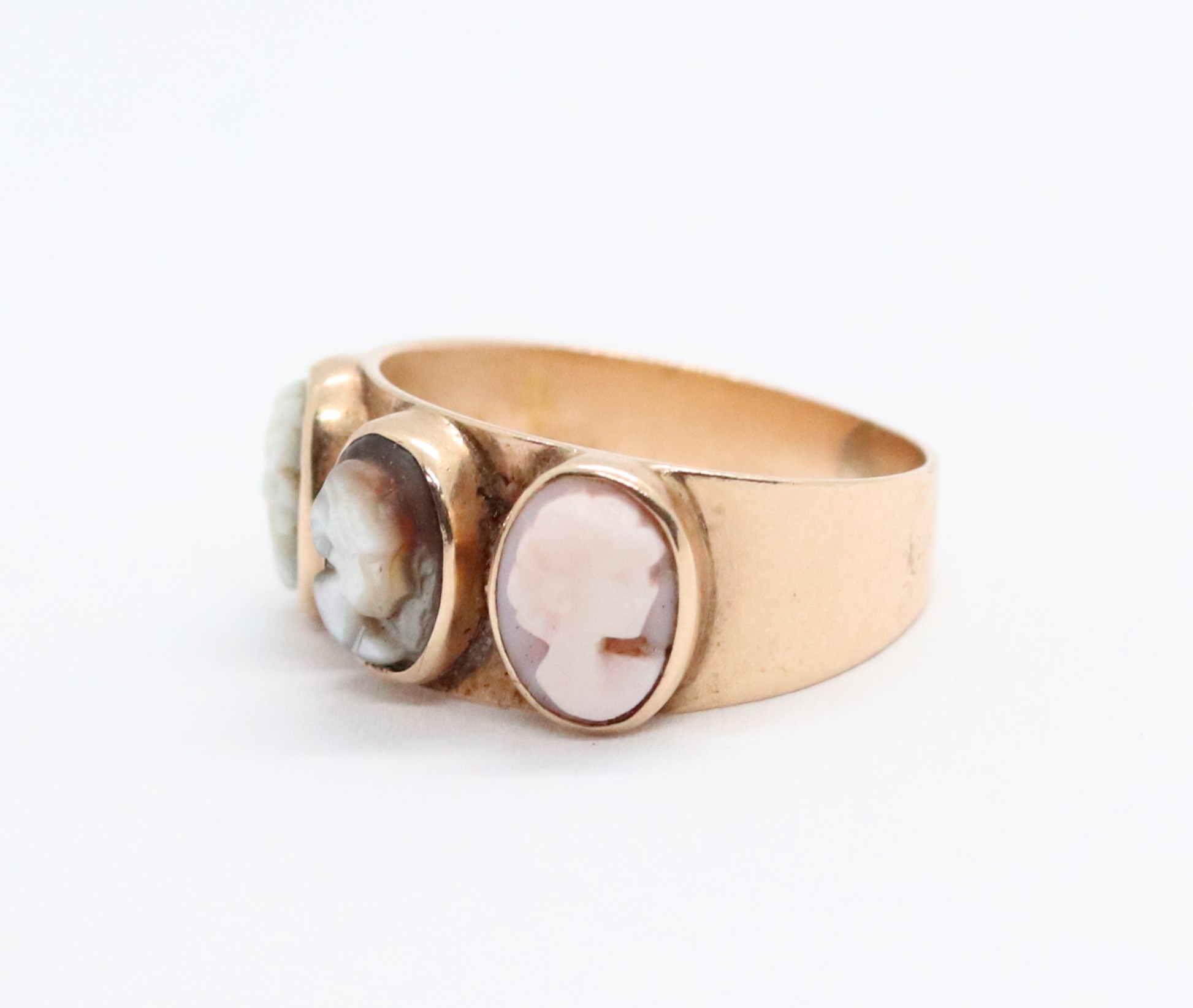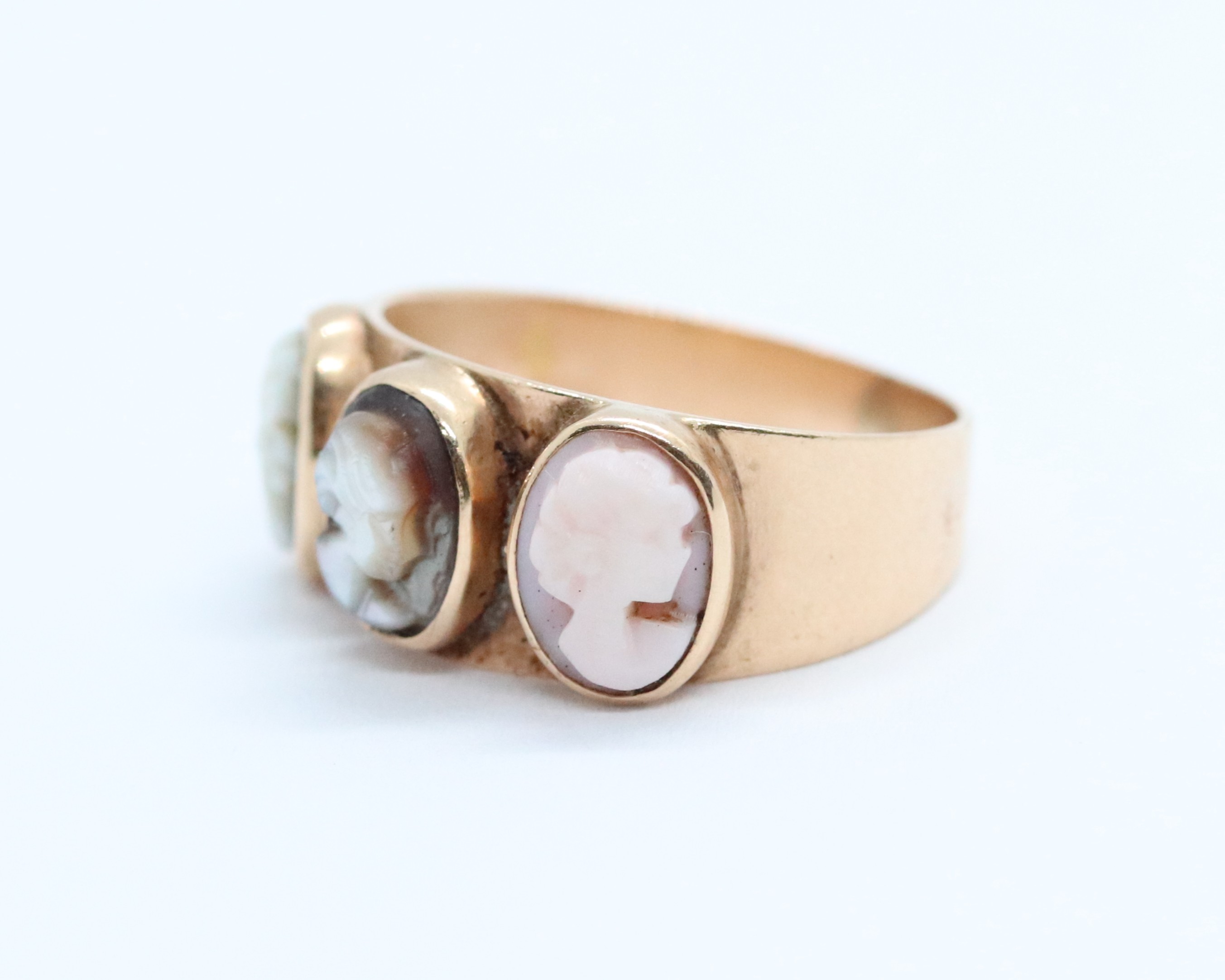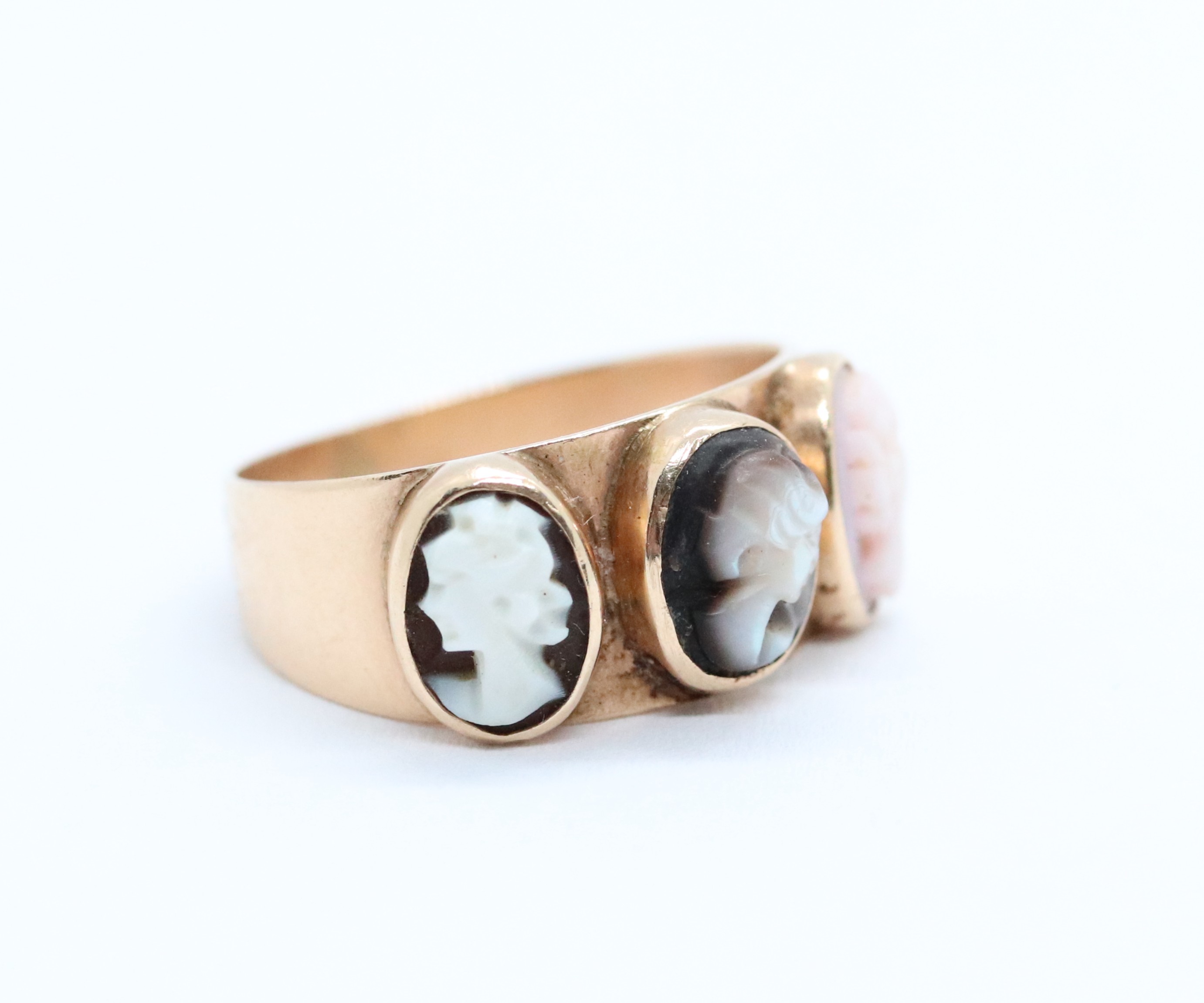 Zlatý historizující prsten se třemi kamejemi dámských profilů, Au btto 3,38g/480/1000, západní Evropa, kolem roku 1880, atest puncovního úřadu; velikost prstenu 52, šířka hlavy 0,9 cm