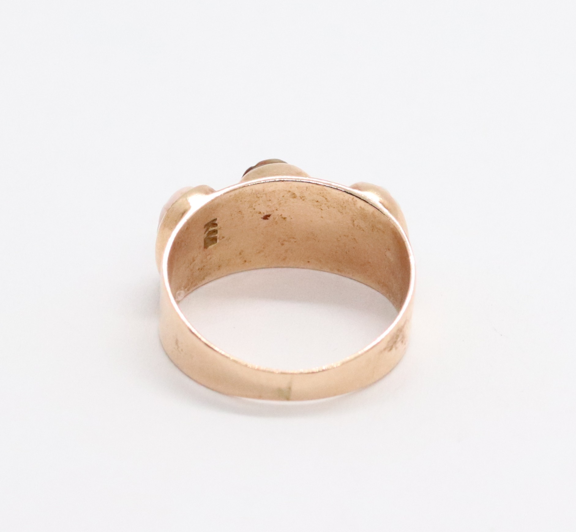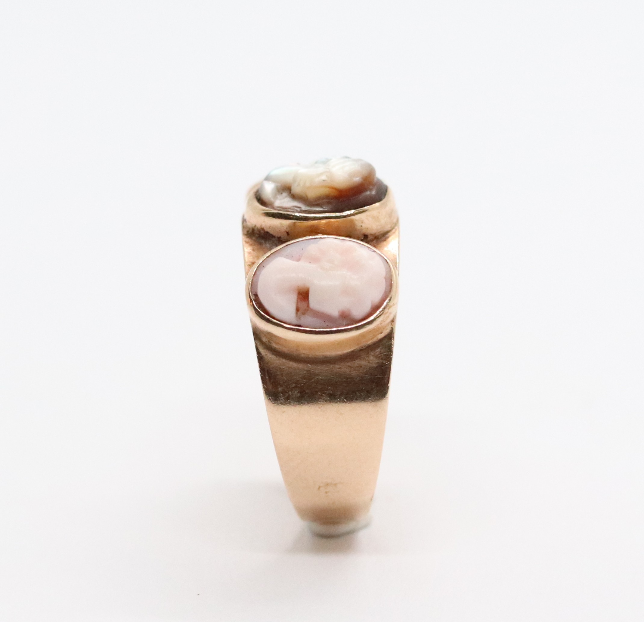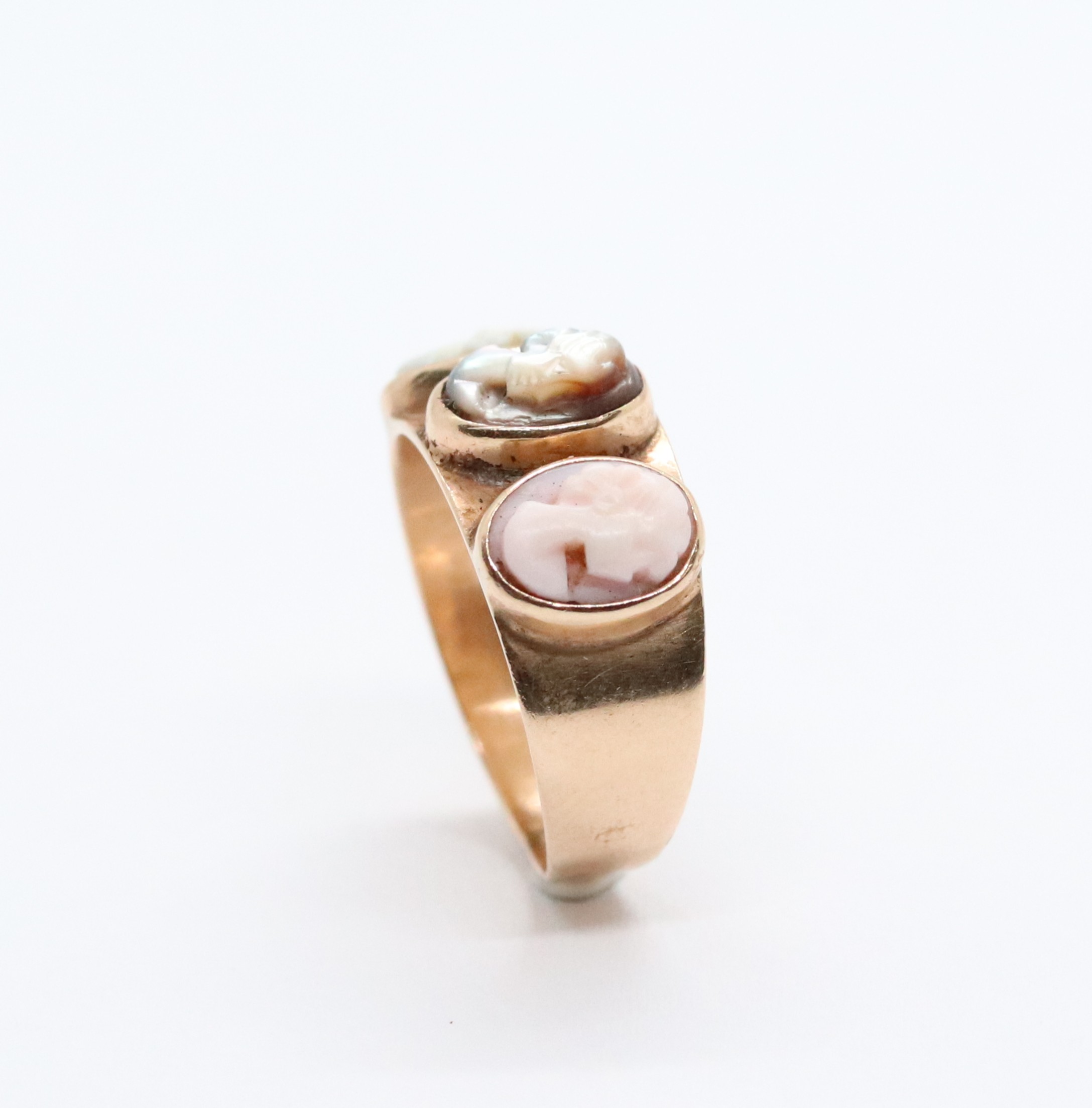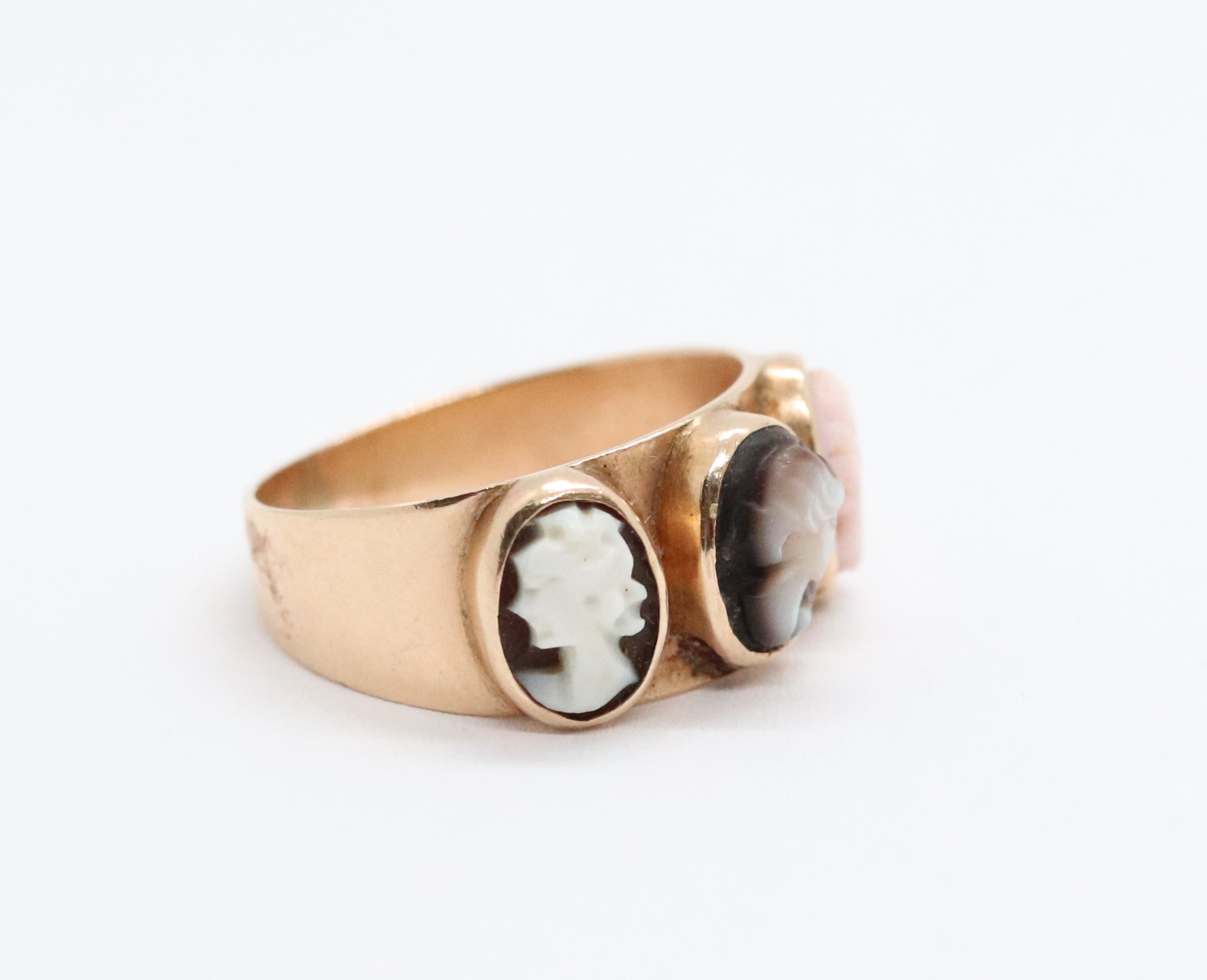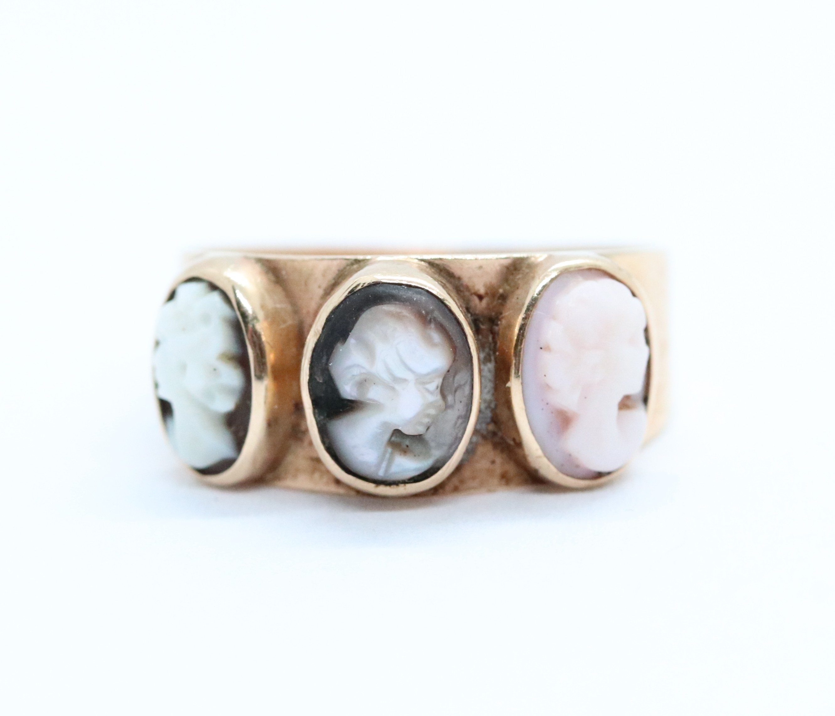 Zlatý historizující prsten se třemi kamejemi dámských profilů, Au btto 3,38g/480/1000, západní Evropa, kolem roku 1880, atest puncovního úřadu; velikost prstenu 52, šířka hlavy 0,9 cm