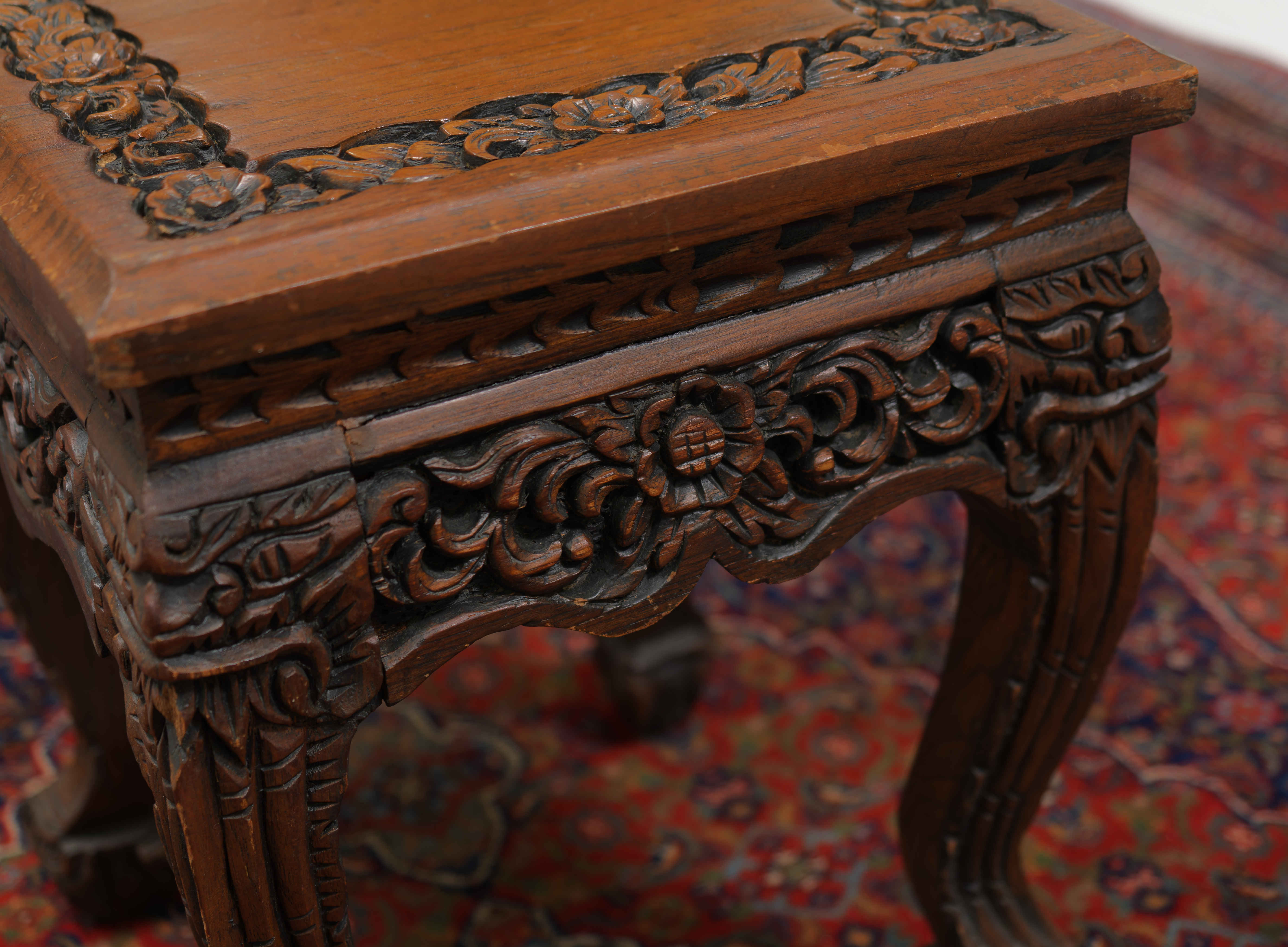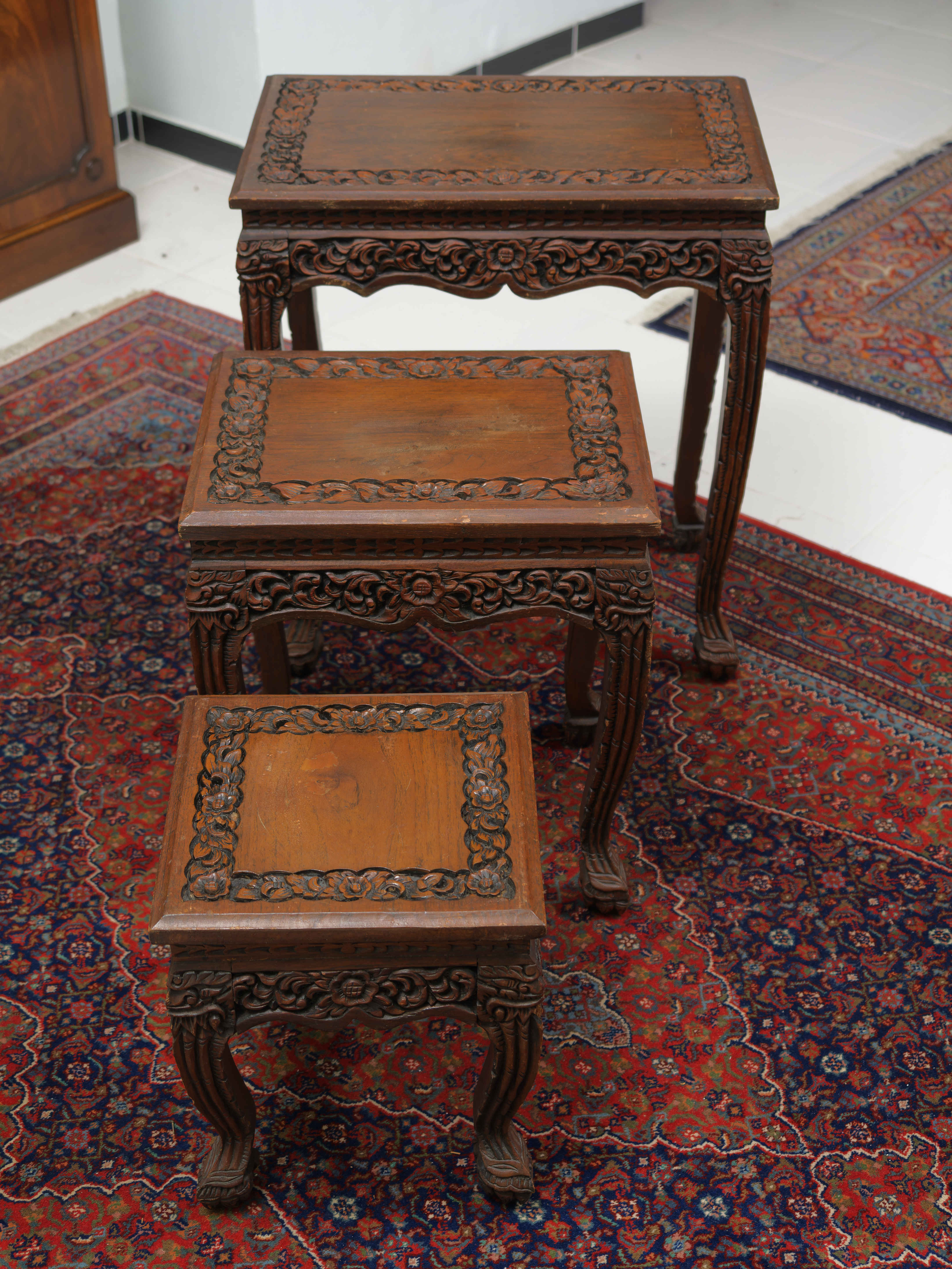 Hnízdové stolky v orientálním stylu z období kolem roku 1980 představují elegantní a dekorativní doplněk interiéru. Sada se skládá ze tří stolků různých velikostí, které lze zasunout do sebe a prakticky tak šetřit prostor. Jsou vyrobeny z masivního dřeva a bohatě zdobené ručním řezbářským dekorem s rostlinnými a květinovými motivy, typickými pro orientální a koloniální nábytek.