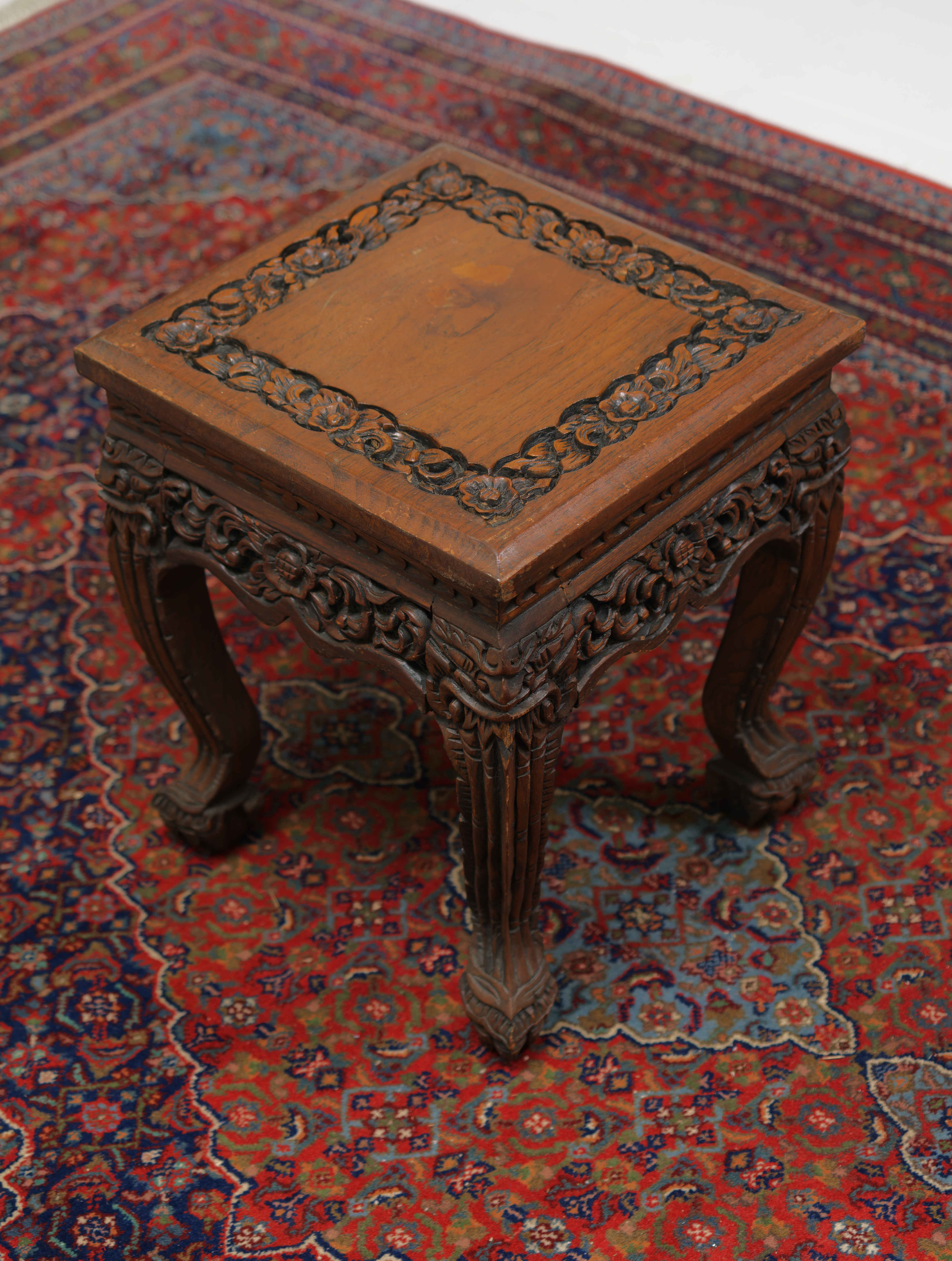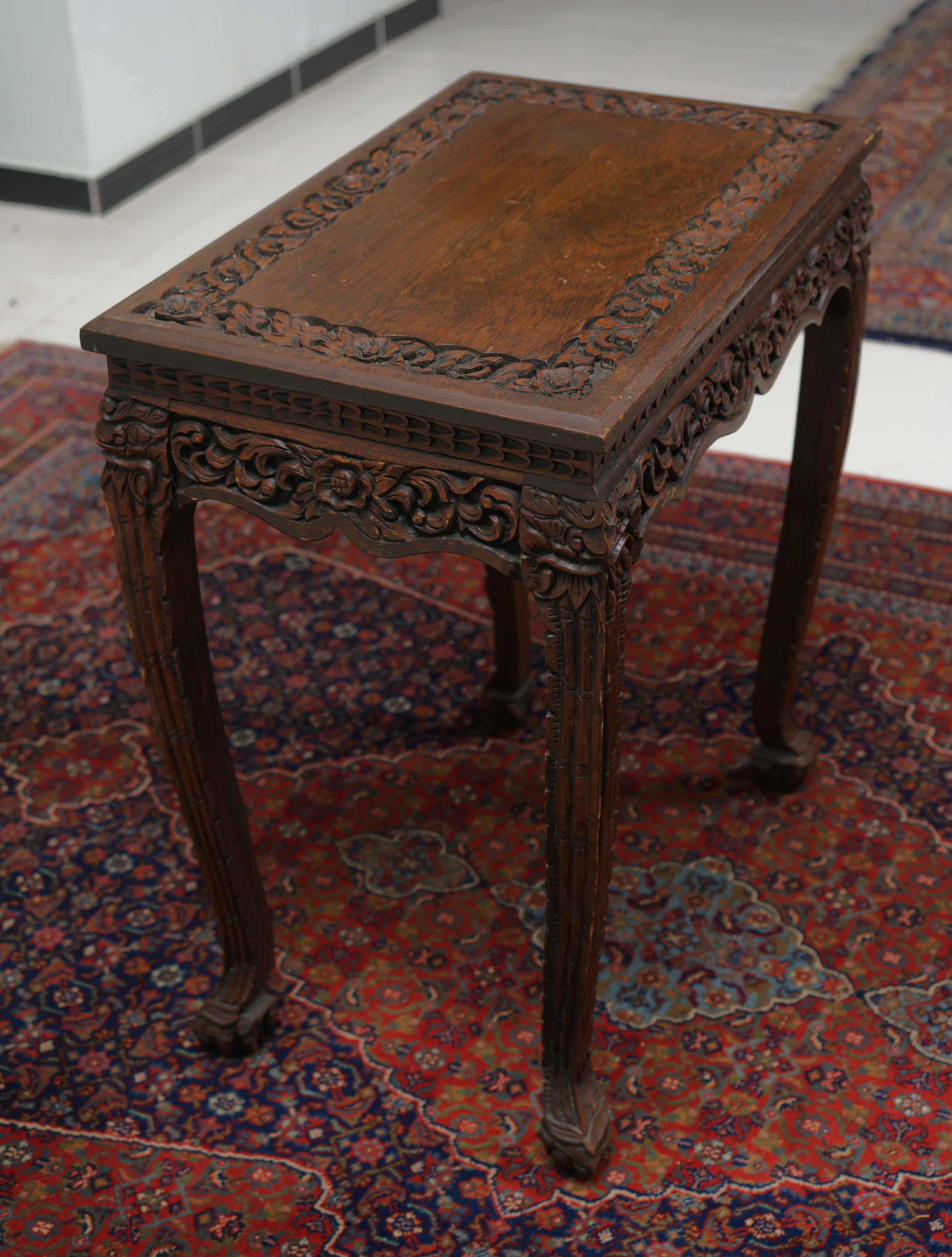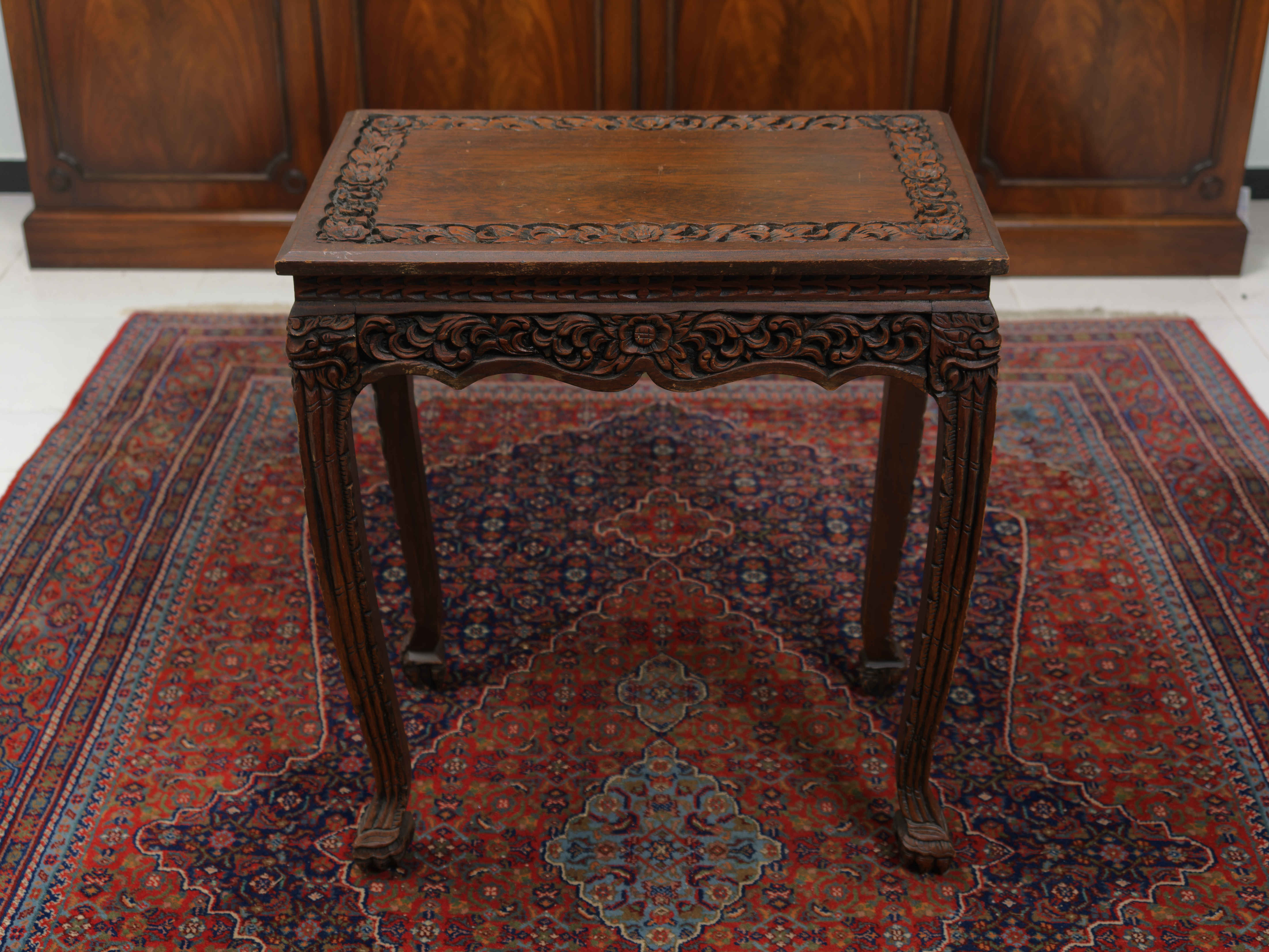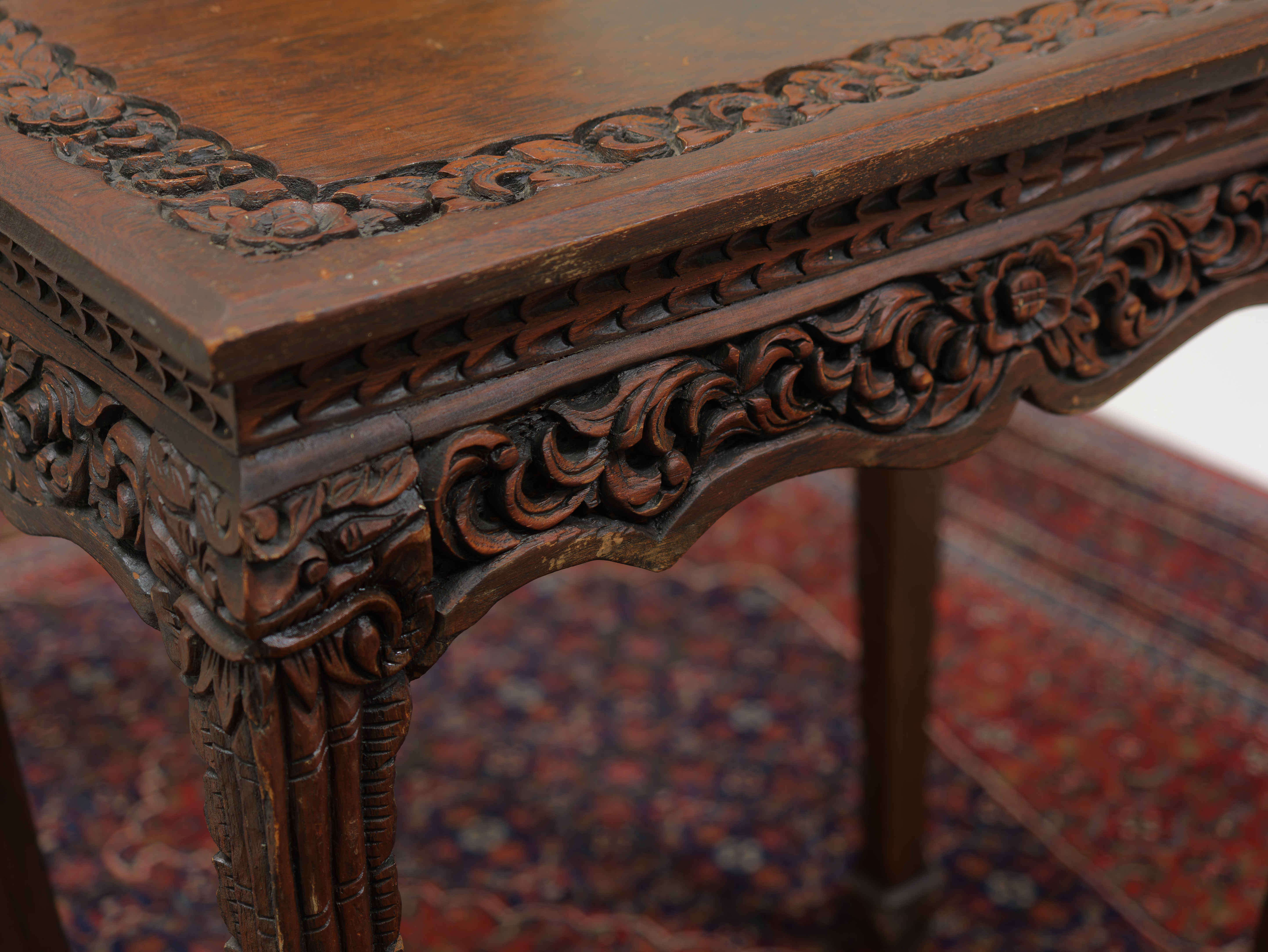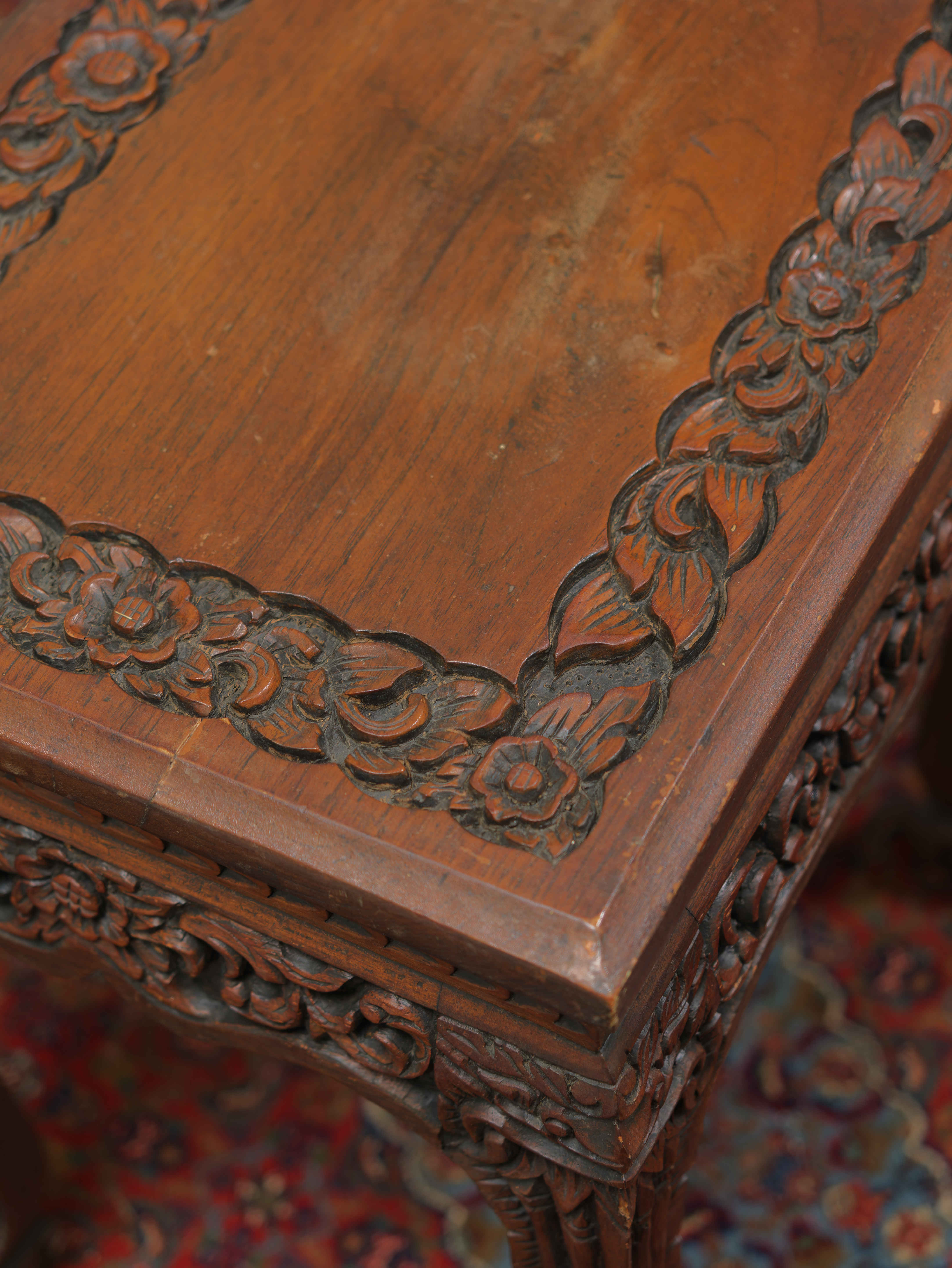 Horní desky jsou orámovány plastickým řezaným dekorem, který plynule navazuje na zdobení lubů i elegantně tvarované nohy zakončené stylizovanými tlapkami. Precizní řezba je provedena s důrazem na detail a dodává stolům výrazný dekorativní charakter. Povrch nese přirozenou patinu, která podtrhuje autentický vzhled nábytku, aniž by narušovala jeho celkovou estetiku.