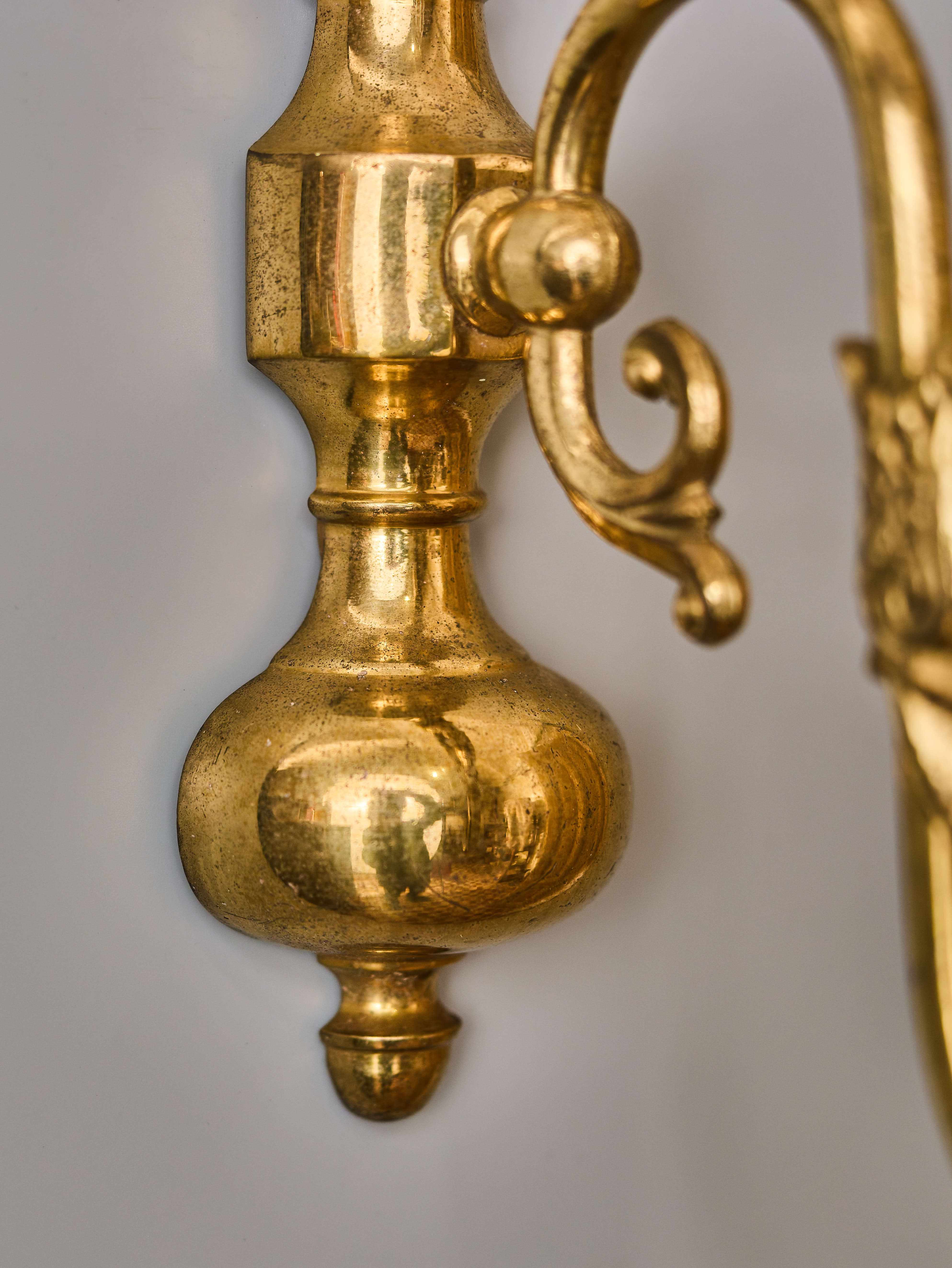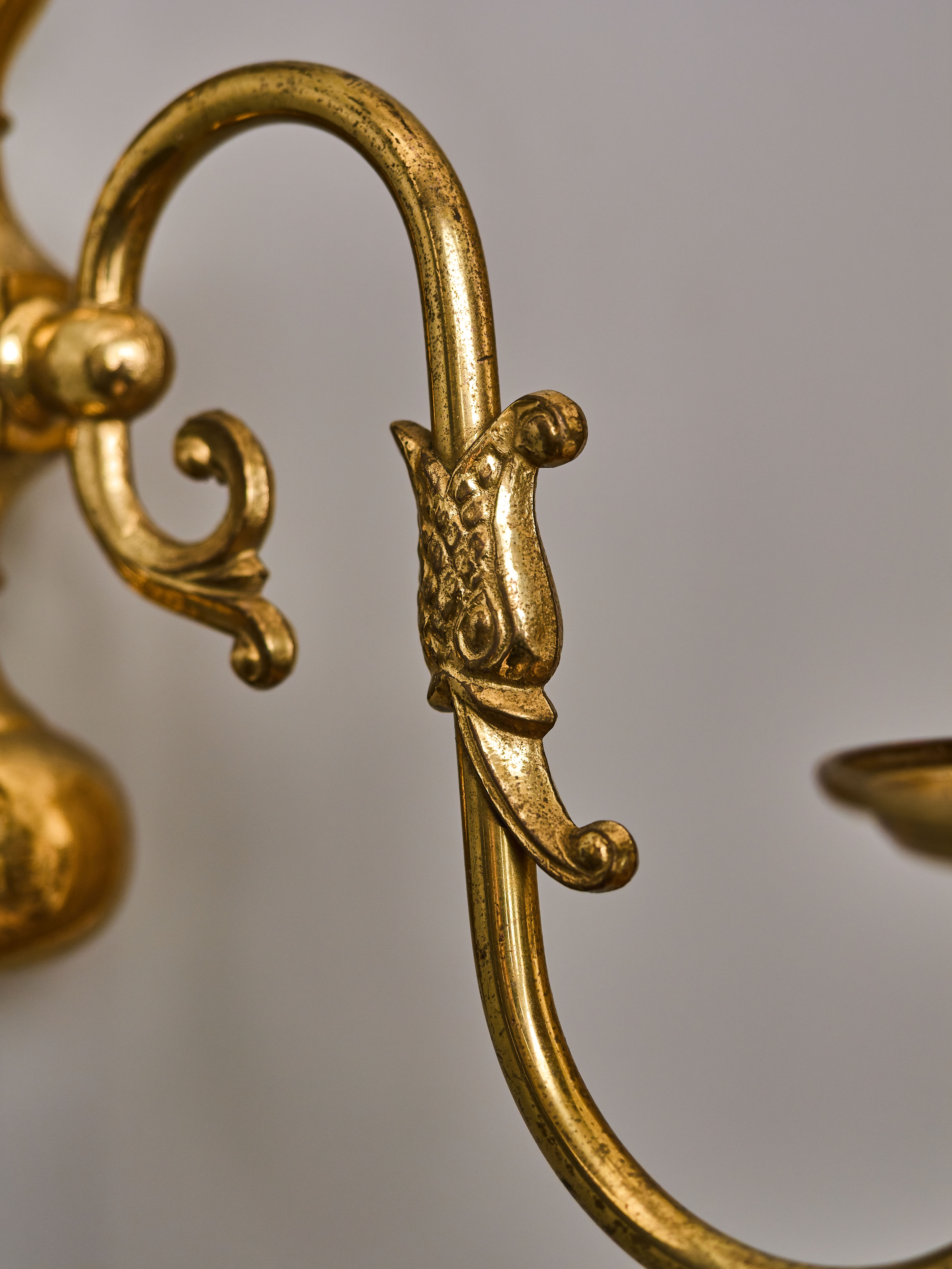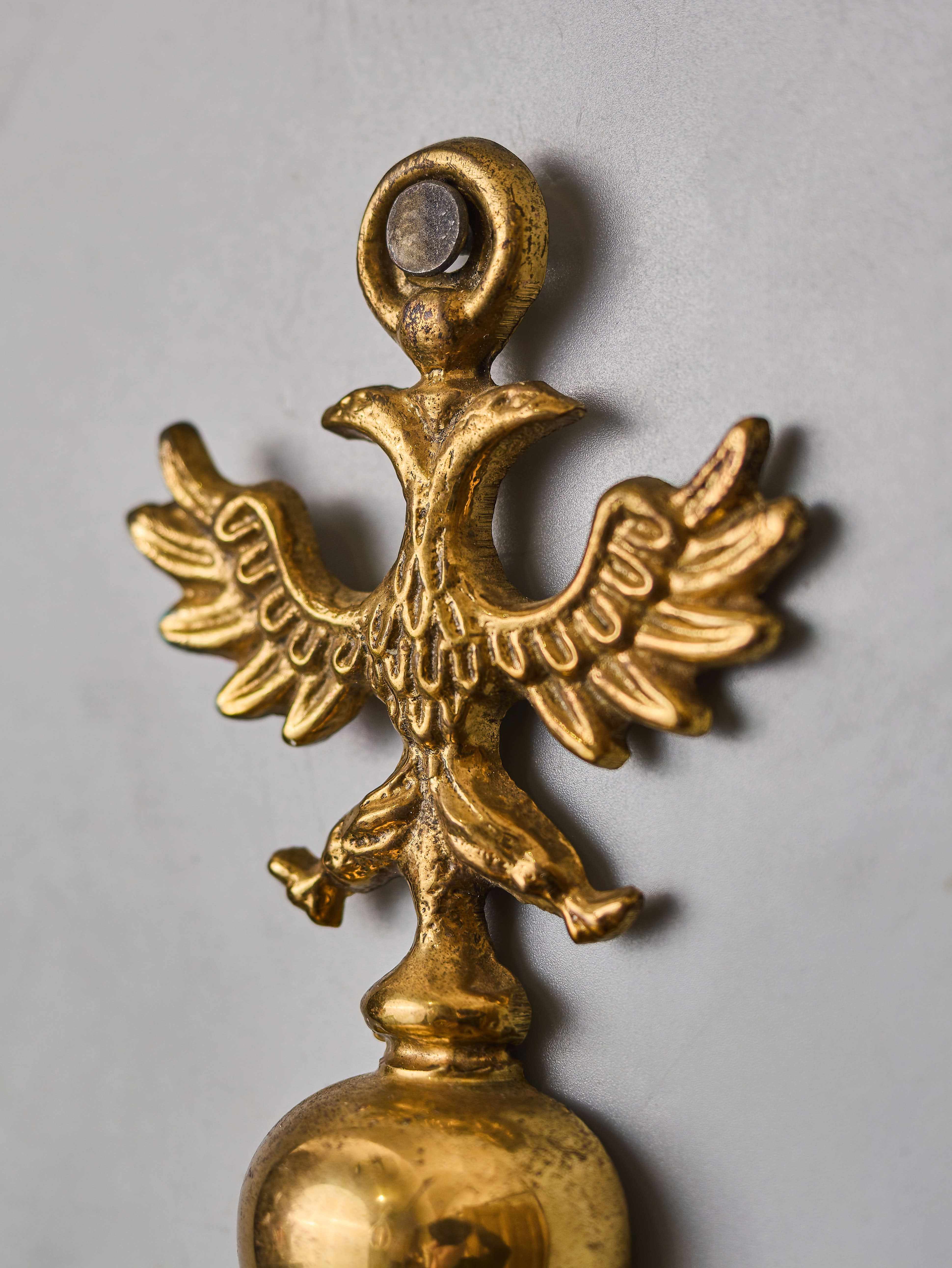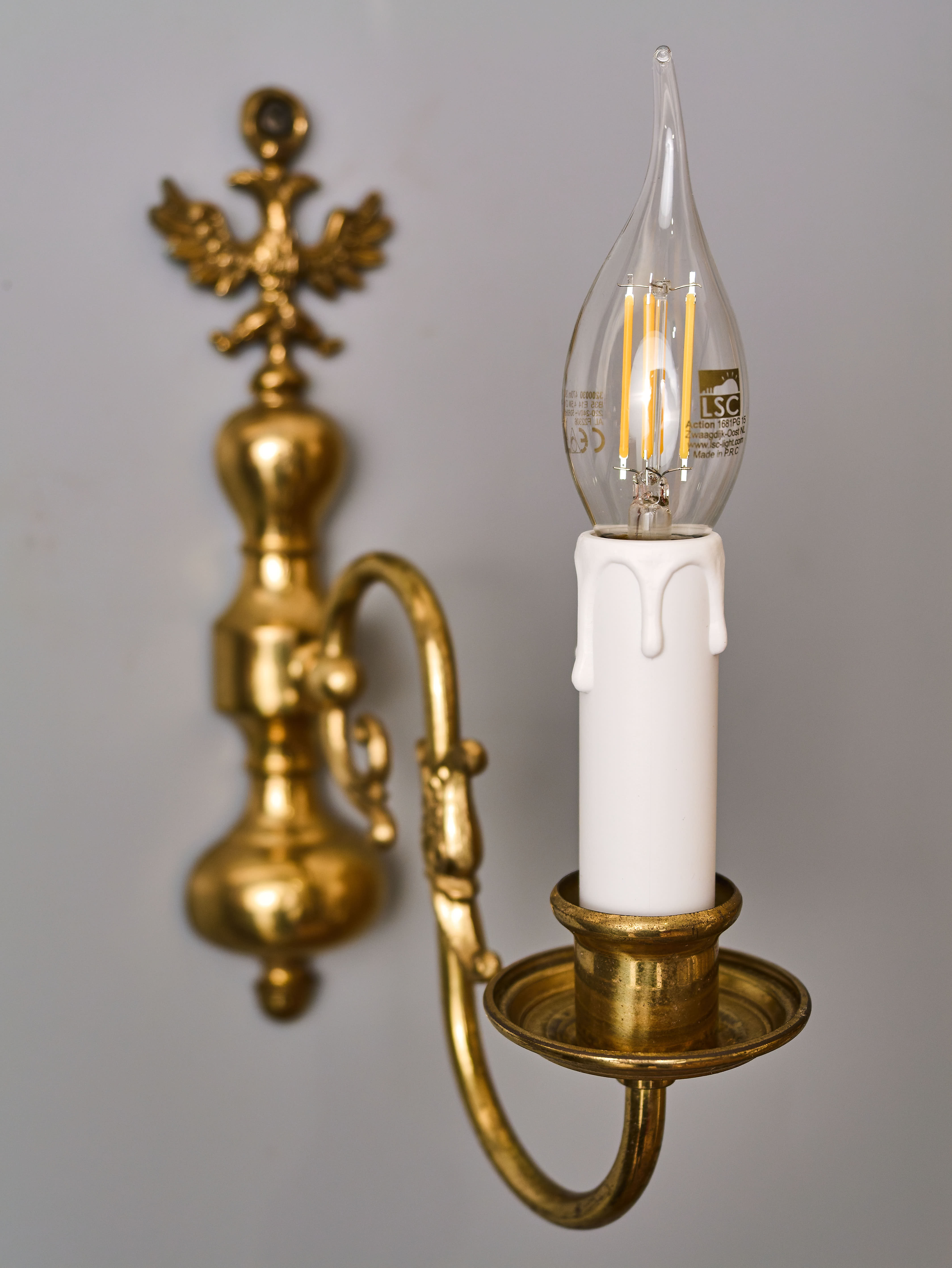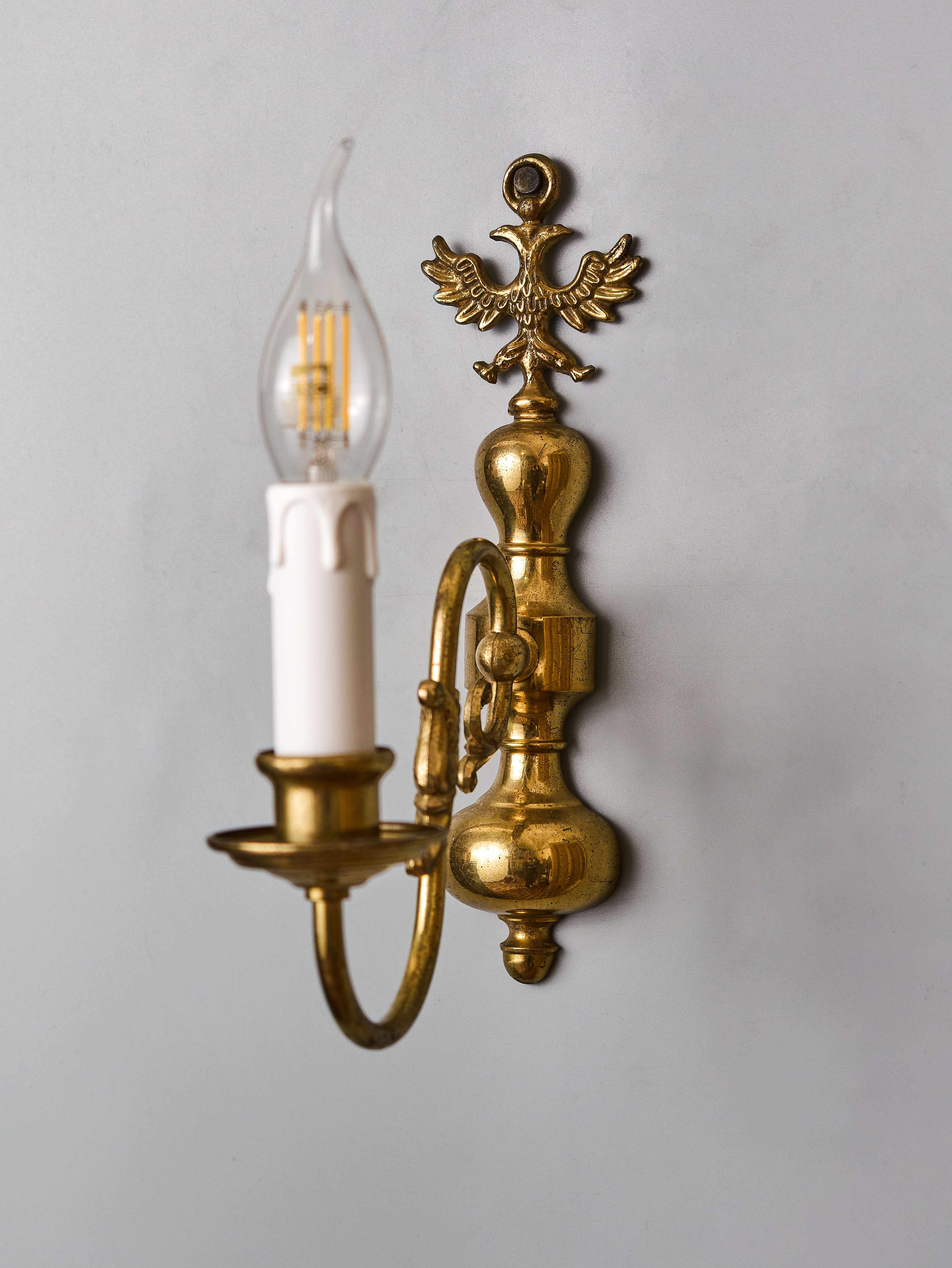 Nástěnná lampa z lité mosazi zdobená vrchní orlicí a rybou. Lampa byla vyrobená v polovině 20. století. Nyní je po renovaci elektroinstalace – v mědi, nová objímka a nová šešule (kryt objímky). Lampa je na jednu klasickou svíčkovou žárovku s paticí E14 do 40W – vhodné jsou normální, halogenové i led žárovky. Stav: restaurovaný – plně funkční. Provenience: Nizozemí.
