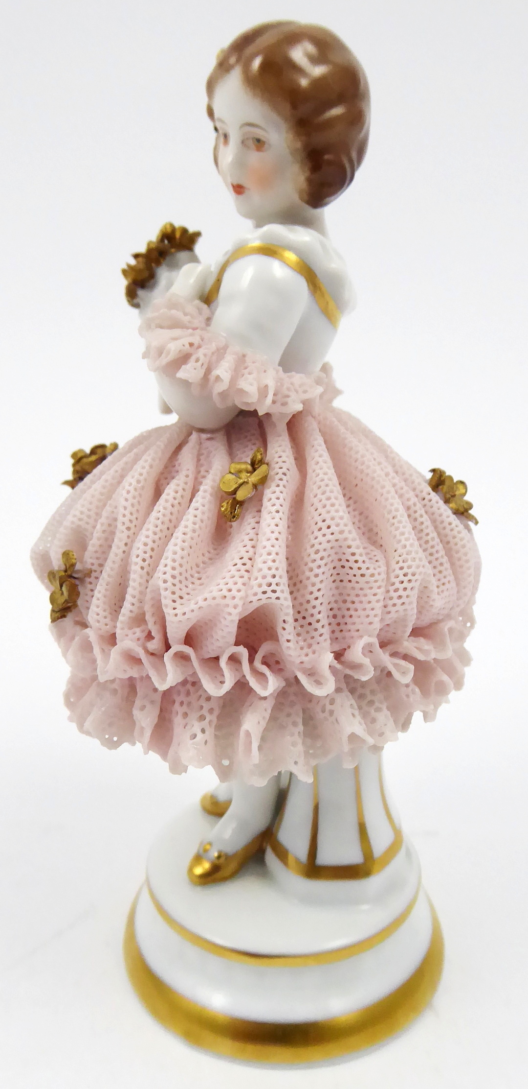 Bílý, barevně ručně malovaný a zlacený porcelán. Luxusporzellanfabrik Müller & Co., Volkstedt, Rudolstadt, založená roku 1907. Porcelánová figurka holčičky se zlatou kyticí v ruce, zlacenou mašlí ve vlasech a v růžové krajkové sukýnce zdobené zlaceným kvítím. Ručně malovaný obličej a ručně zlacené květy, střevíce. Na malém kulatém odstupňovaném podstavci zdobeném zlacením. Značeno zespodu: tištěná modrá značka firmy a značka malíře. Německo, Volkstedt, Rudolstadt, od roku 1907. Výška 12 cm.