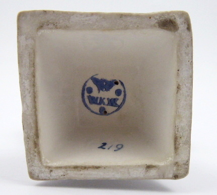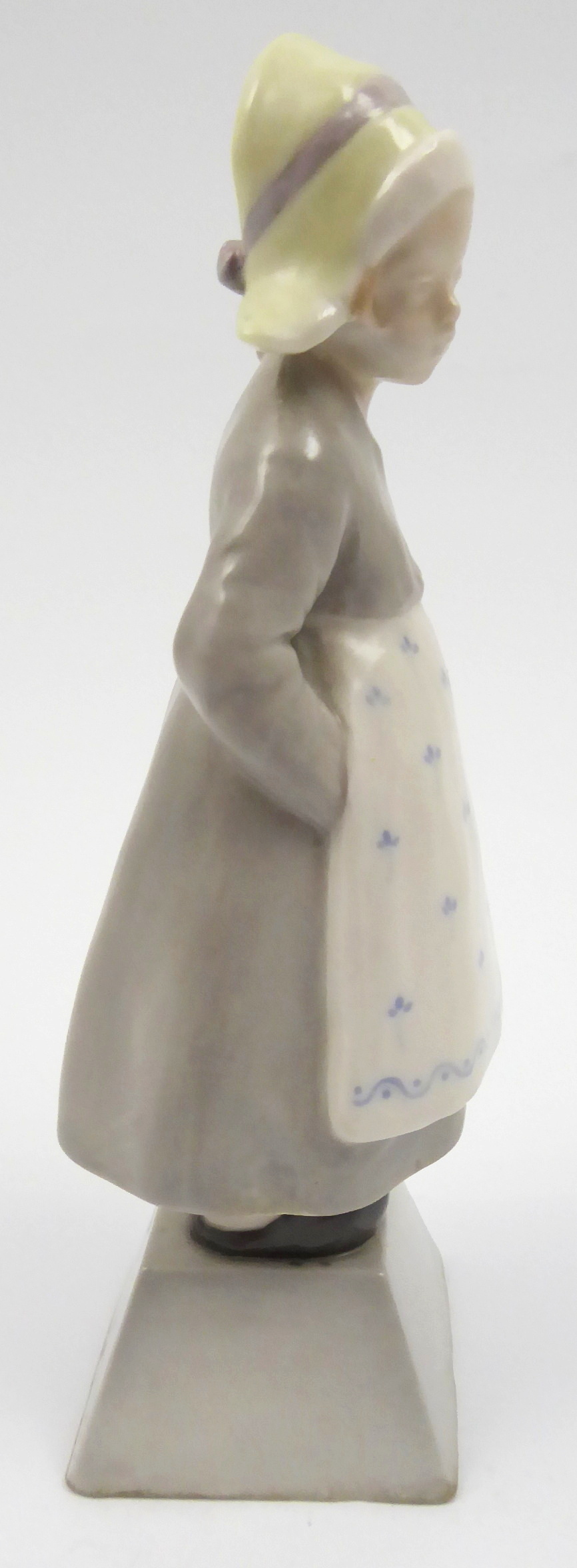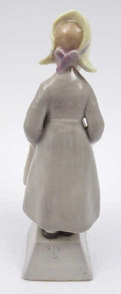 Bílý a ručně barevně malovaný porcelán. Období a styl: secese. Vídeňskou firmu Förster & Co. založil roku 1899 Alexander Förster pod názvem A. Förster, roku 1908 bylo její pojmenování změněno na Kunstkeramische Fabrik A. Förster & Co. Krásná porcelánová figura malé holčičky s plachetkou na hlavě oblečené v šatech se zástěrou a dřevácích ve stylu tehdejší módy v Holandsku či v severním Německu. Dívenka s něžně zamyšleným výrazem ve tváři má ruce zastrčené do kapes. Zástěra ručně malovaná modrými lístečky s úponky dozdobená vlnovkami a punktováním. Značeno zespodu: firemní značka platná pro výše uvedené období. Rakousko, Vídeň 1908 – 1930. Výška 16 cm.