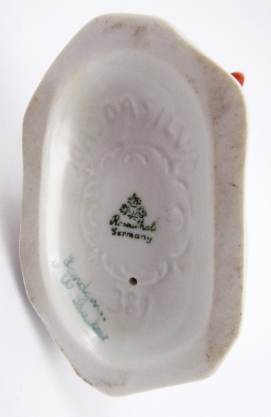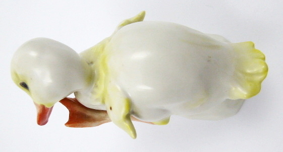 Bílý, ručně barevně malovaný porcelán. Autor modelu: Joao Da Silva (1880-1960) pro Rosenthal. Číslo modelu: 381. Porcelánová žertovná figura ručně malovaného housete drbajícího se nohou pod krkem. Na nízkém podstavci mírně oválného tvaru. Značeno zespodu: vtlačené jméno autora návrhu JOAO DA SILVA, firemní značka platná pro výše uvedené období a rukou psaná signatura malíře (handgem. W. Schutzer). Německo, Selb 1943 – 1952. Výška 8 cm.