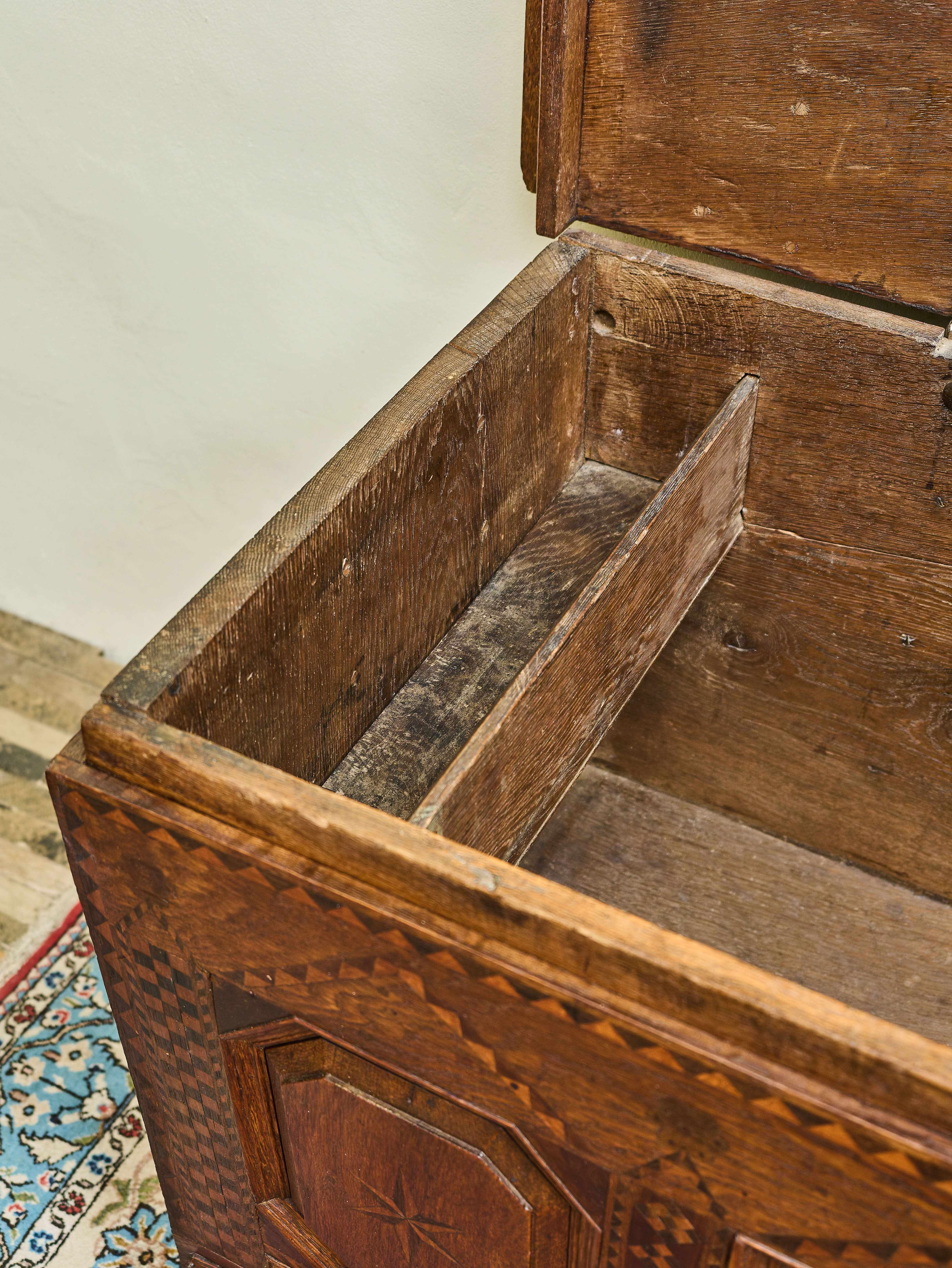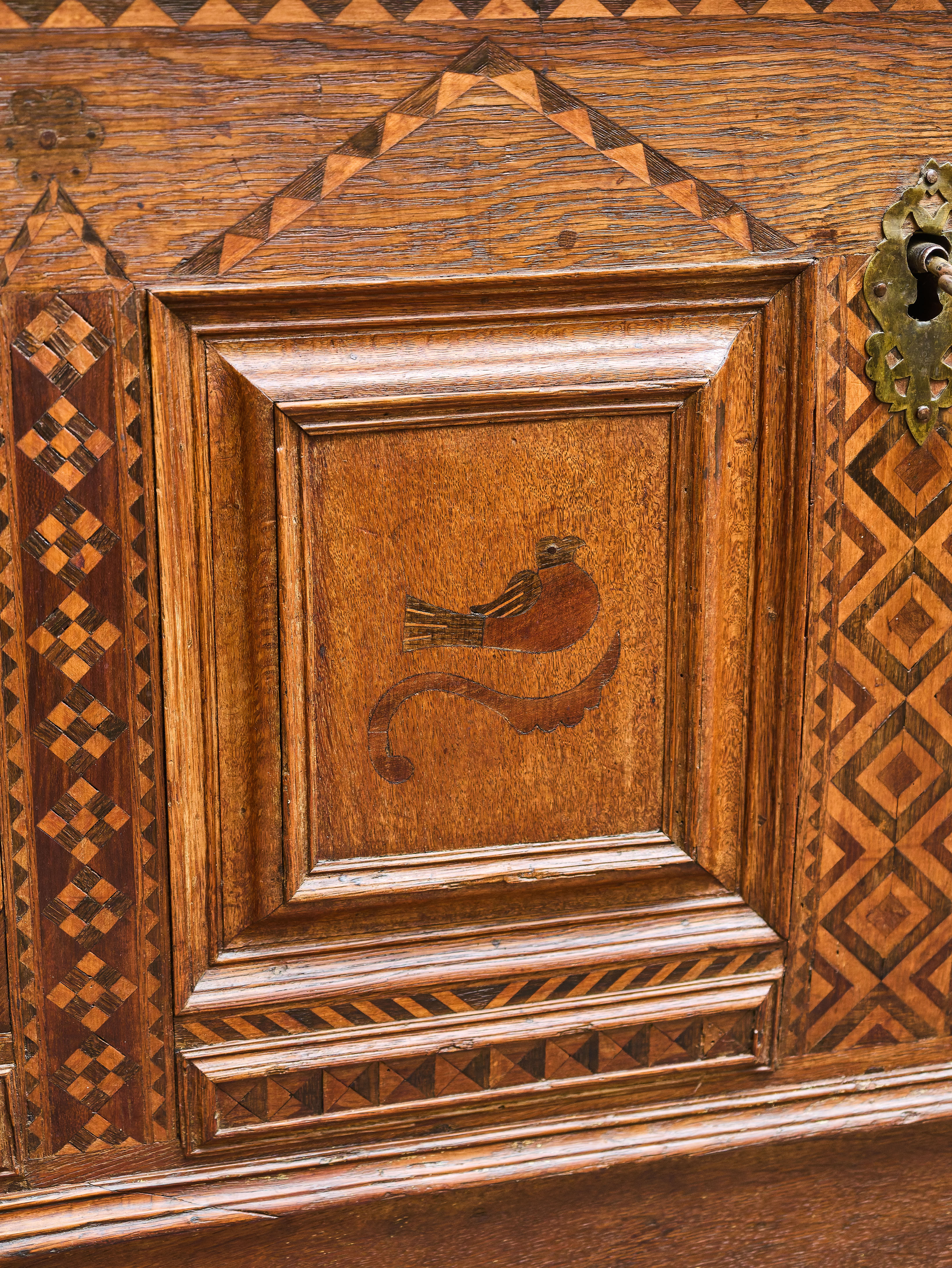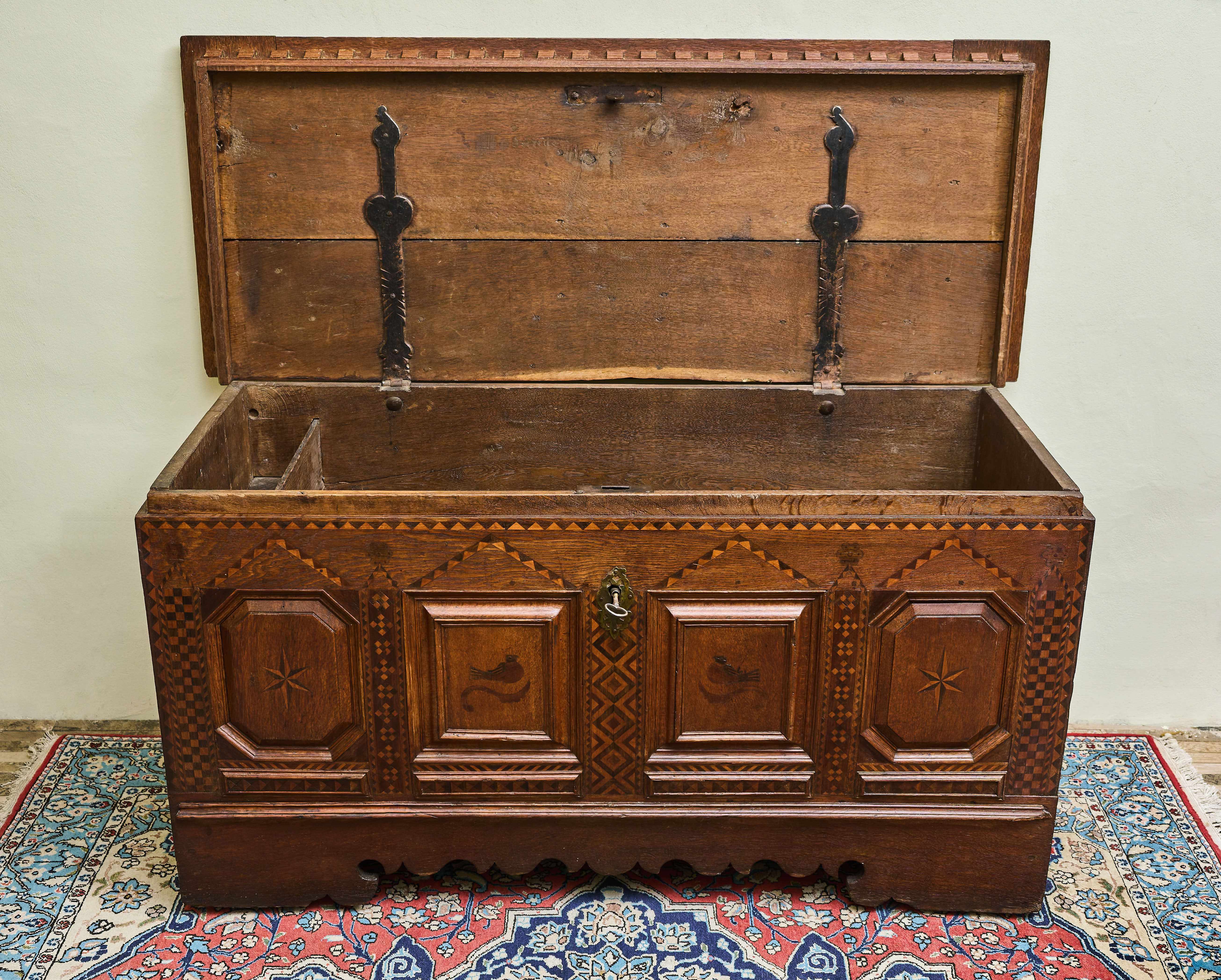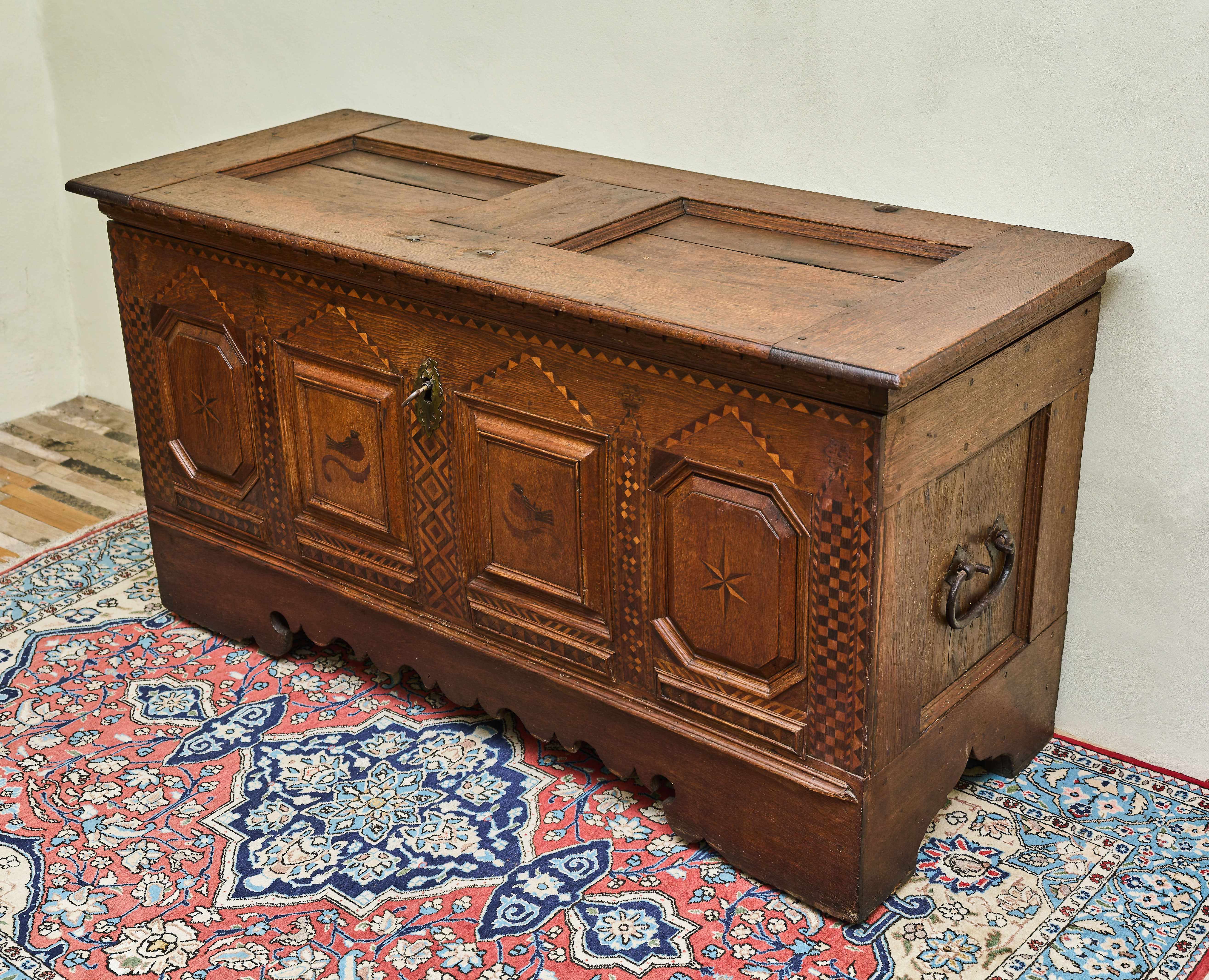 Unikátní intarzovaná truhla z 18. století, která představuje vynikající příklad řemeslného umění své doby. Truhla je vyrobena z masivního dubu. Výzdoba je ukázkou precizního řemeslného umění a smyslu pro detail tehdejší doby. Čelní deska je zdobena bohatou geometrickou intarzií z různých druhů dřev, která vytváří výrazné diamantové a šachovnicové vzory. V jednotlivých kazetách čela se střídají motivy hvězd a stylizovaných ptáků, které symbolizují ochranu a blahobyt. Horní část truhly je lemována dekorativním zubatým pásem, jenž celý kus elegantně rámuje. Celek doplňuje původní ručně kované kování a ozdobné kované závěsy víka, které umocňují autentický historický charakter tohoto výjimečného kusu nábytku. Originální kování, ručně kované hřeby a funkční rozvorový zámek s původním opraveným klíčem zůstaly zachovány v plně použitelném stavu. Díky prostornému vnitřnímu úložnému prostoru a autentickému vzhledu se jedná o vzácný kus vhodný do historických interiérů, stylových rezidencí či jako hodnotný sběratelský artefakt. Stav nábytku je velmi dobrý, bez výskytu červotoče.