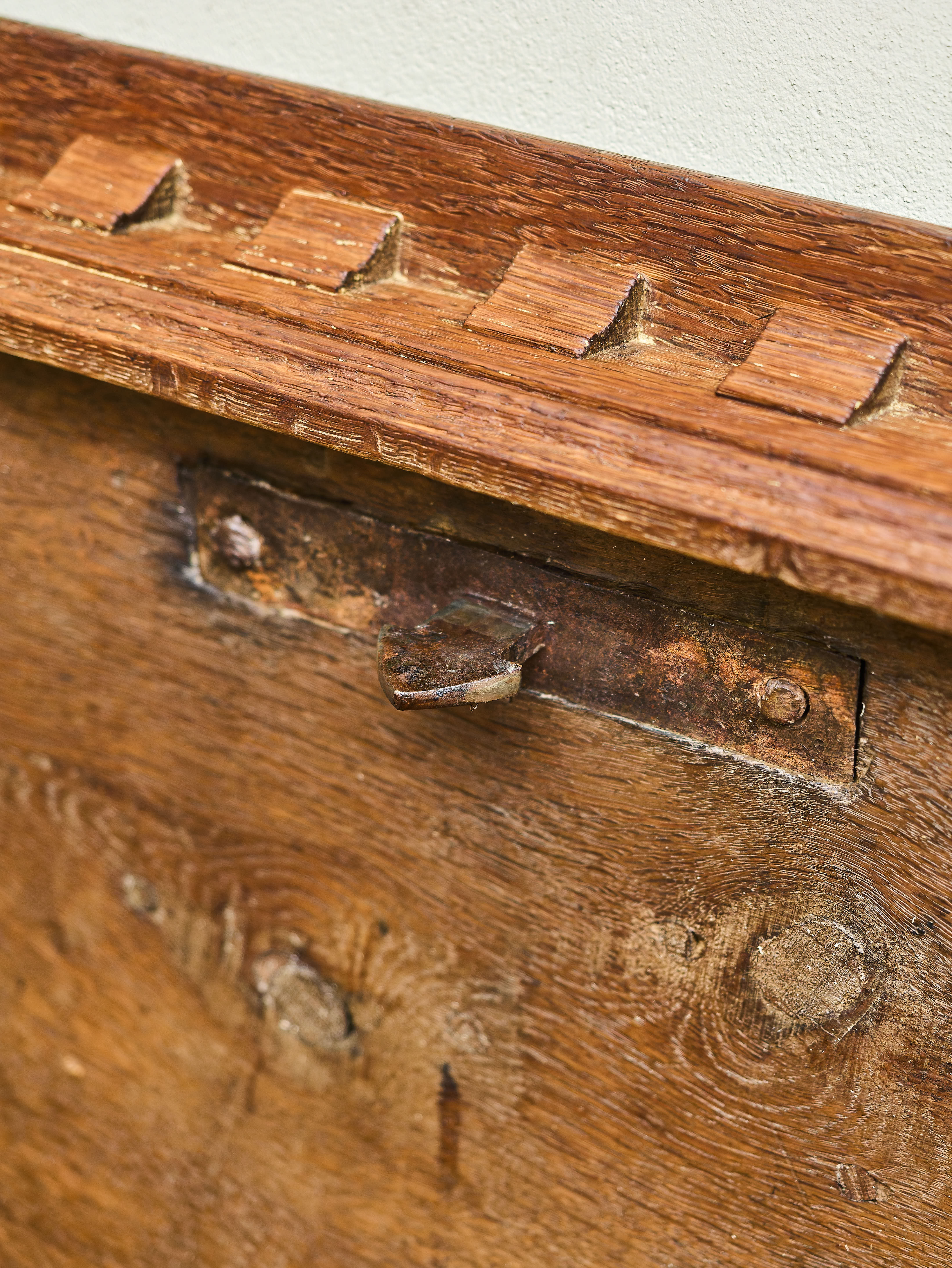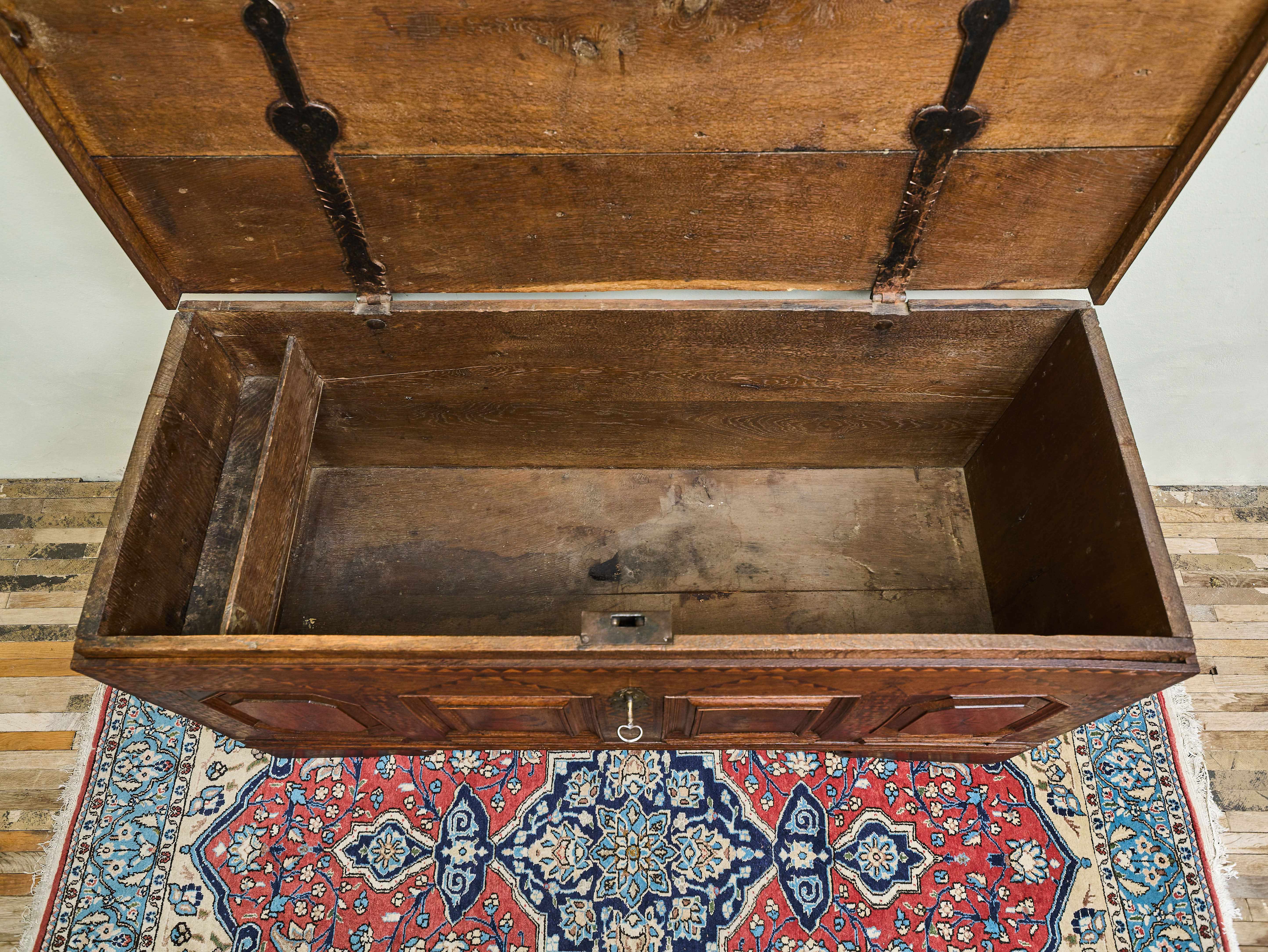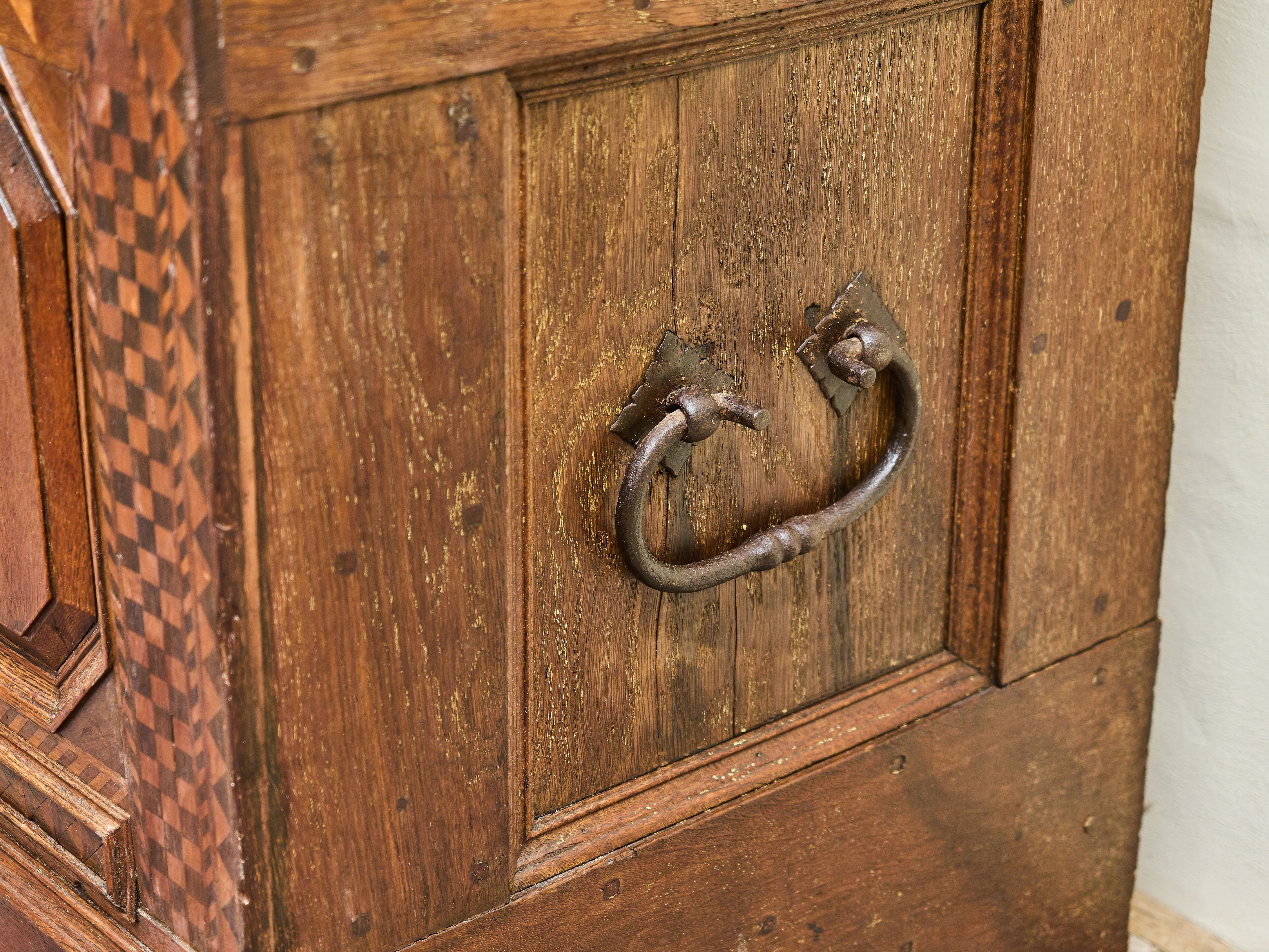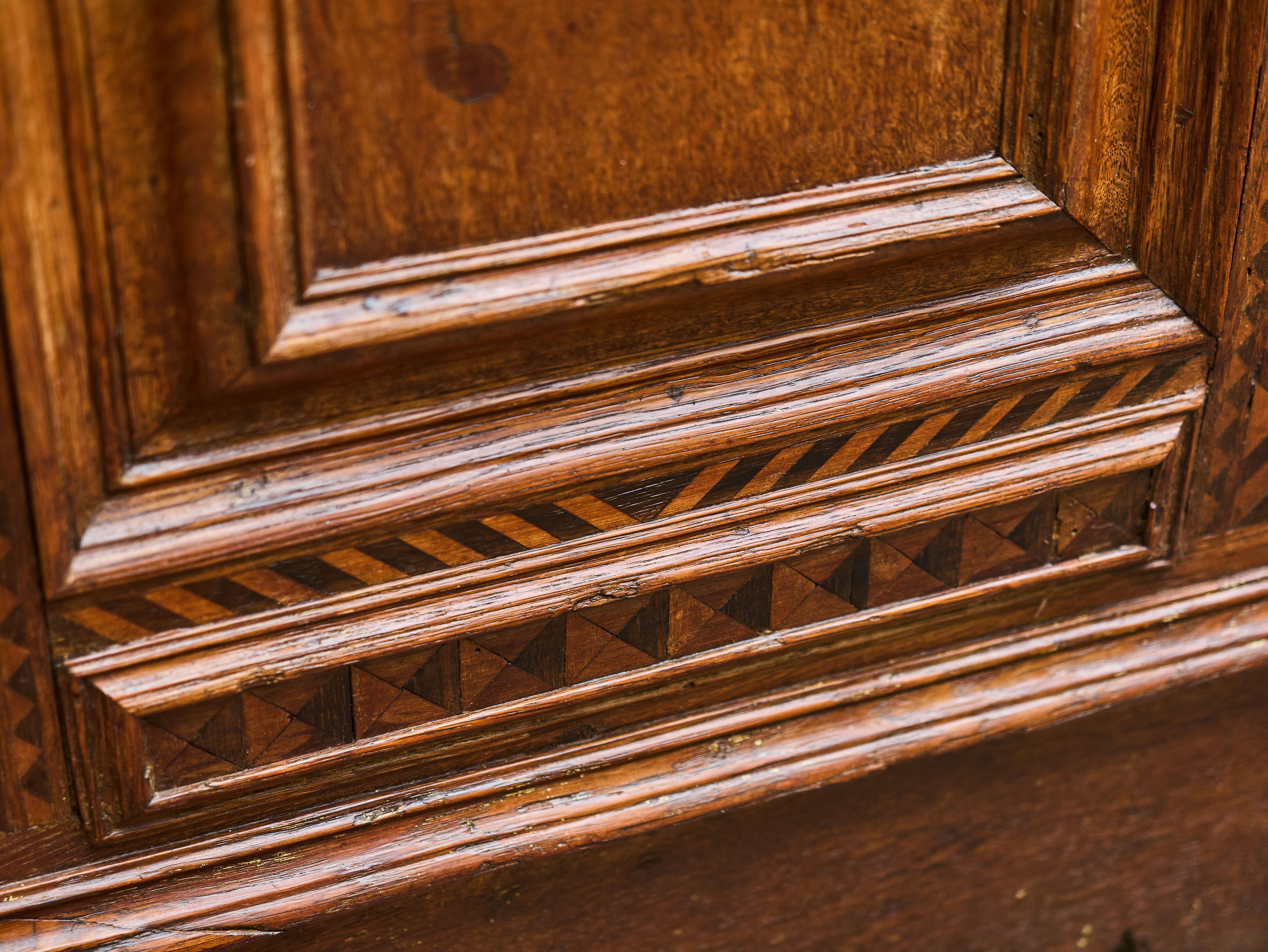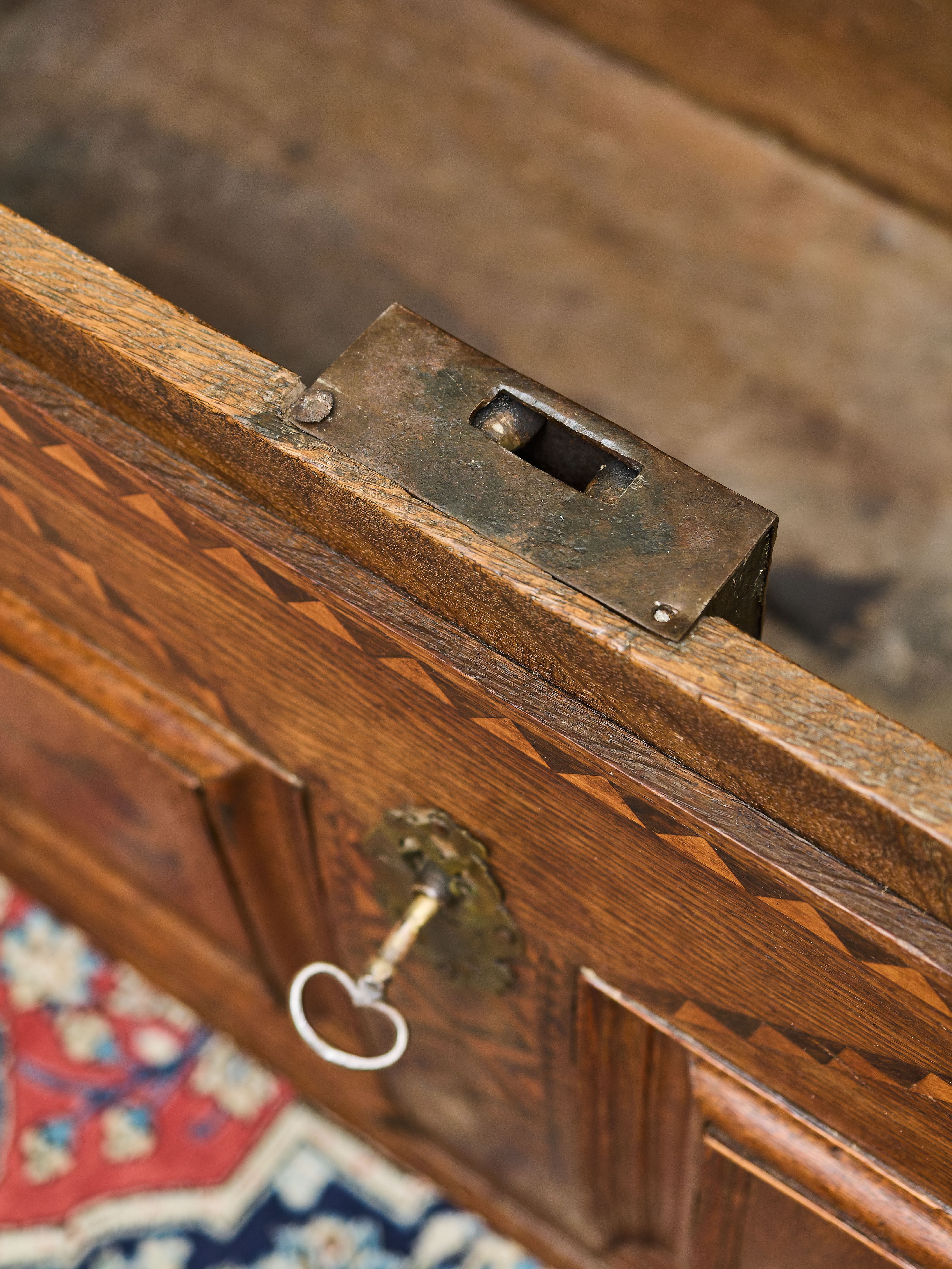 Unikátní intarzovaná truhla z 18. století, která představuje vynikající příklad řemeslného umění své doby. Truhla je vyrobena z masivního dubu. Výzdoba je ukázkou precizního řemeslného umění a smyslu pro detail tehdejší doby. Čelní deska je zdobena bohatou geometrickou intarzií z různých druhů dřev, která vytváří výrazné diamantové a šachovnicové vzory. V jednotlivých kazetách čela se střídají motivy hvězd a stylizovaných ptáků, které symbolizují ochranu a blahobyt. Horní část truhly je lemována dekorativním zubatým pásem, jenž celý kus elegantně rámuje. Celek doplňuje původní ručně kované kování a ozdobné kované závěsy víka, které umocňují autentický historický charakter tohoto výjimečného kusu nábytku. Originální kování, ručně kované hřeby a funkční rozvorový zámek s původním opraveným klíčem zůstaly zachovány v plně použitelném stavu. Díky prostornému vnitřnímu úložnému prostoru a autentickému vzhledu se jedná o vzácný kus vhodný do historických interiérů, stylových rezidencí či jako hodnotný sběratelský artefakt. Stav nábytku je velmi dobrý, bez výskytu červotoče.