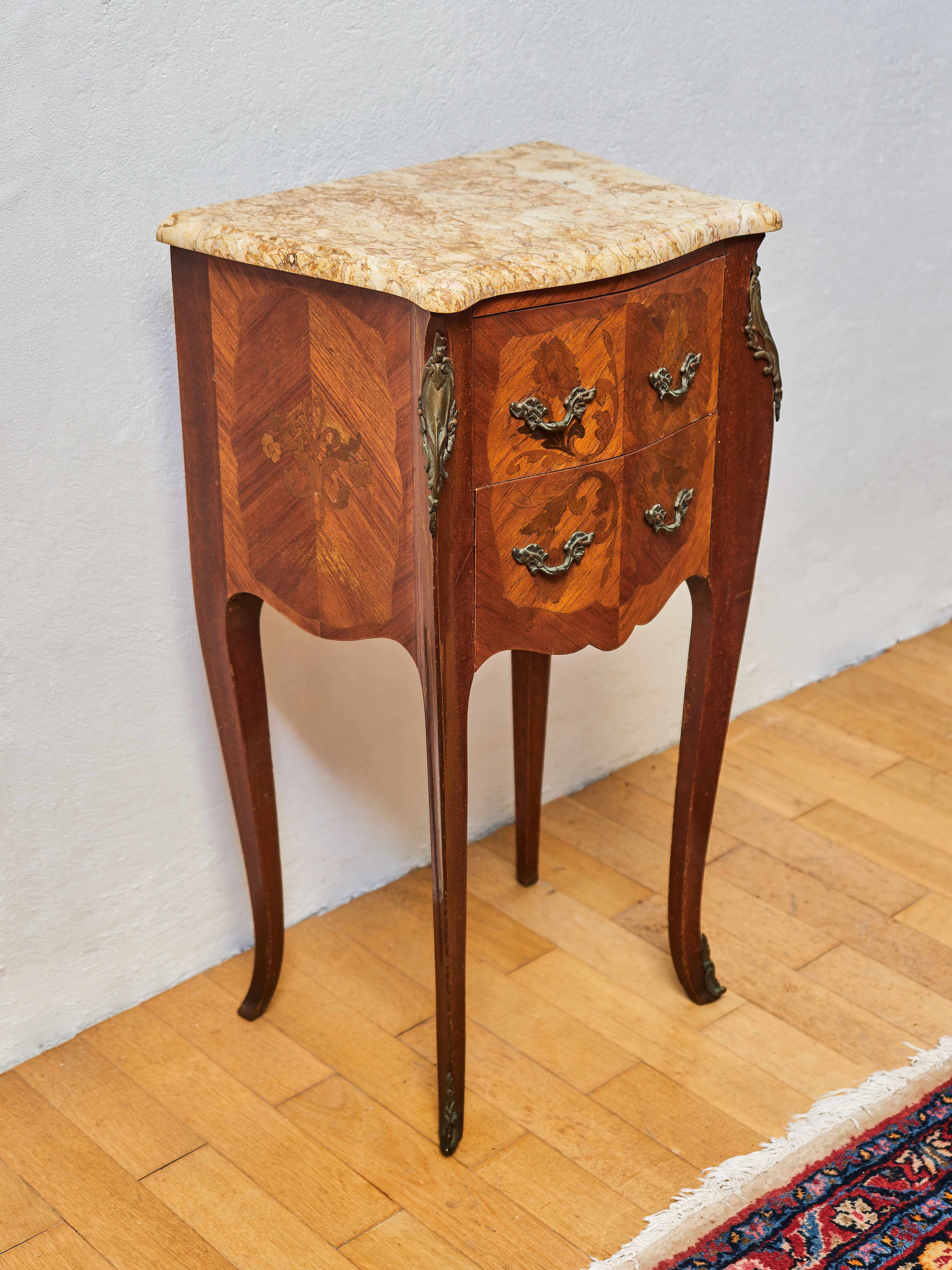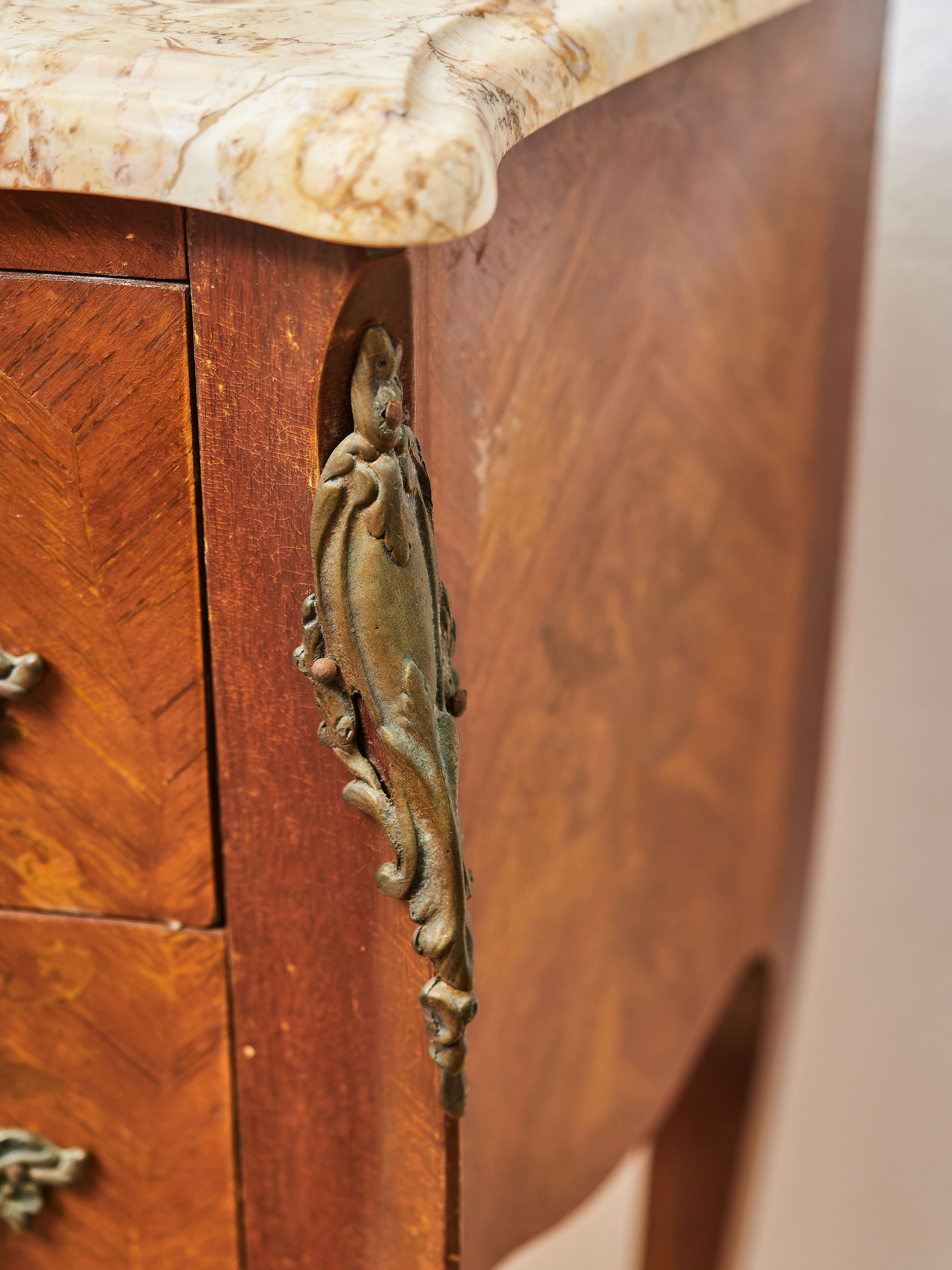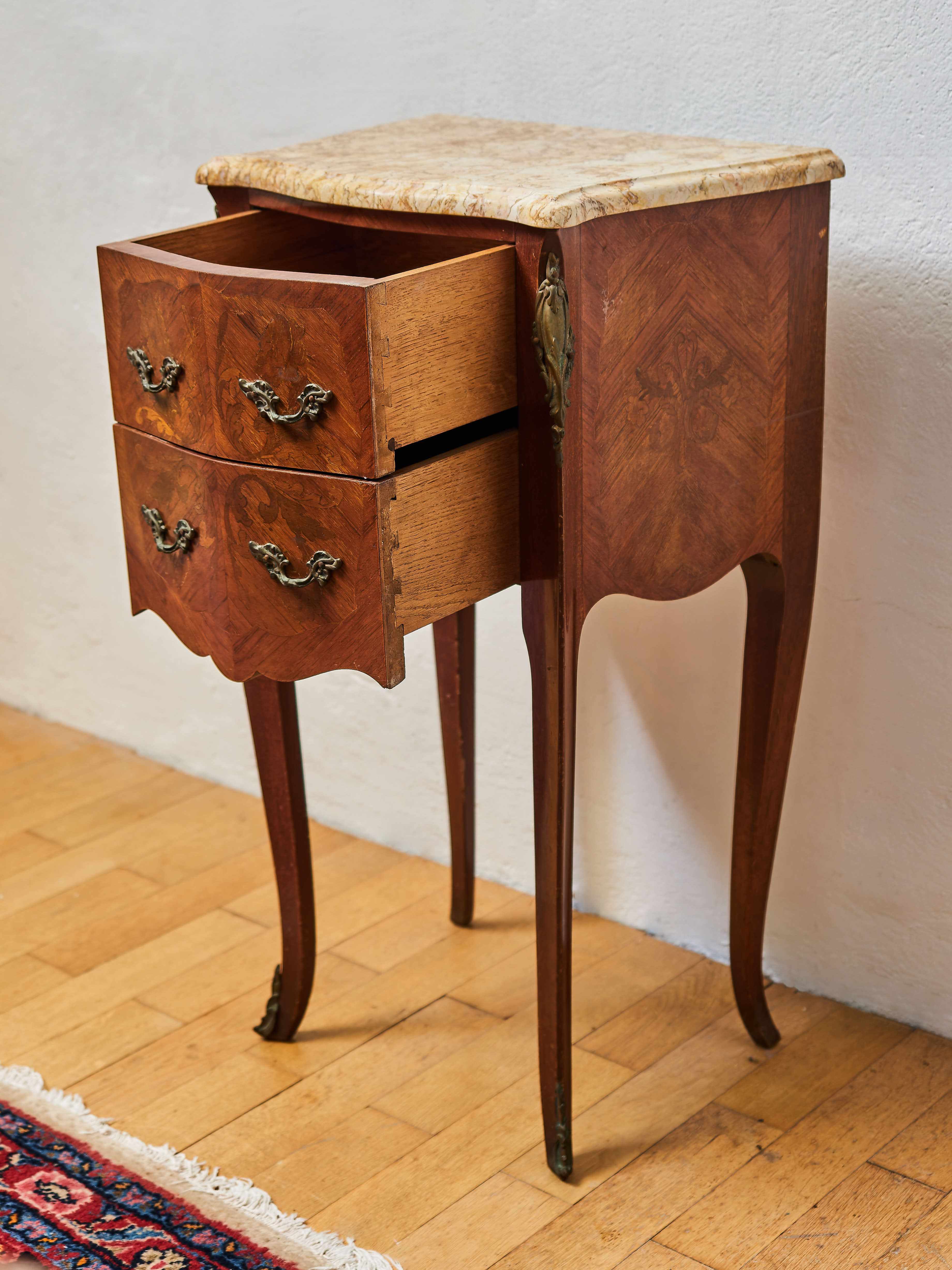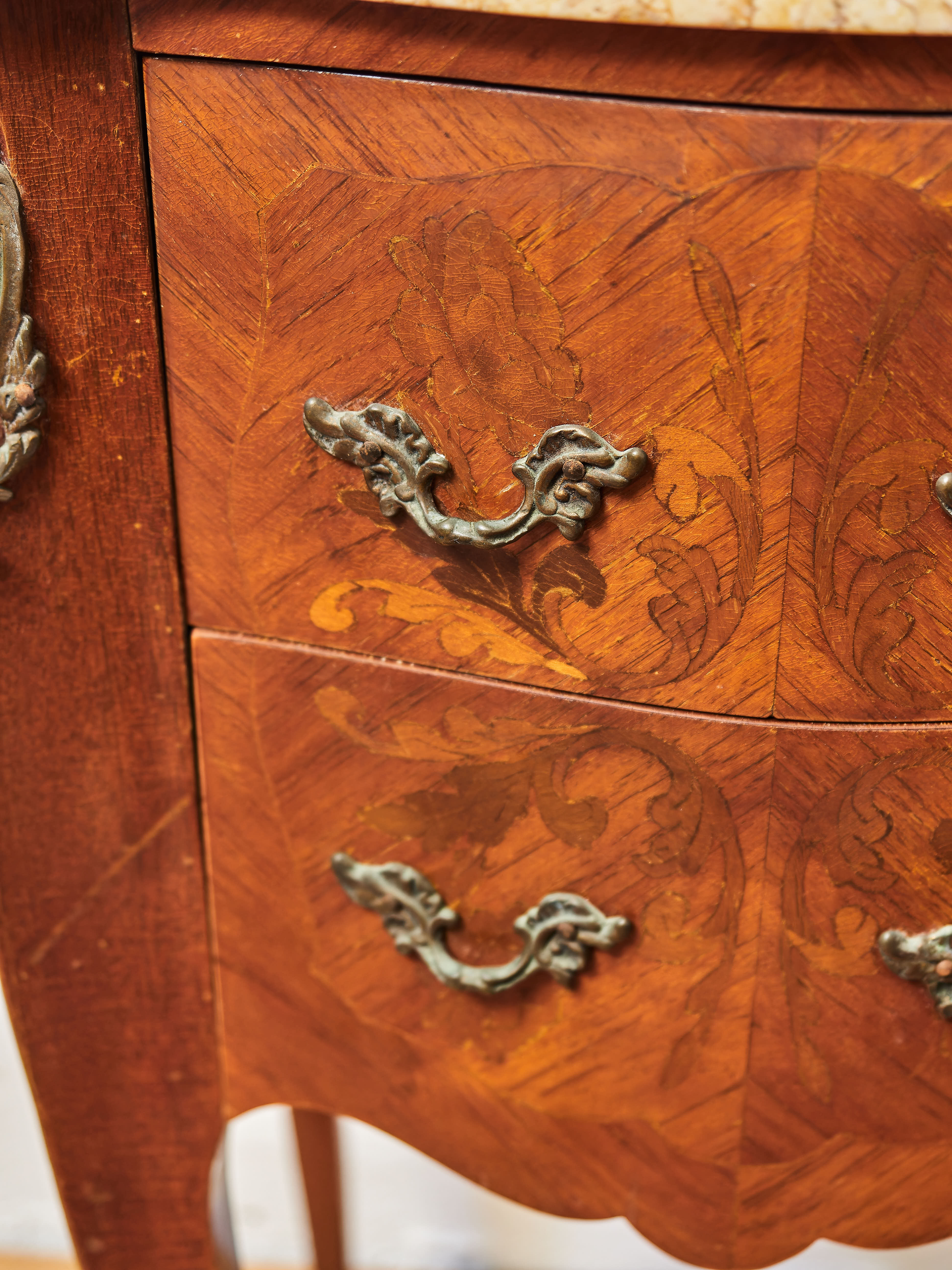 Krásná komodka / stolek se dvěma šuplíky. Komodka je zdobená rostlinou intarzií, litými bronzovými aplikacemi a bohatě profilovanou vrchní mramorovou deskou s fasetou. Šuplíčky mají cinkované spoje. Komodka je vhodná jak do vstupní haly, obývacího pokoje tak i jako noční stolek do ložnice.