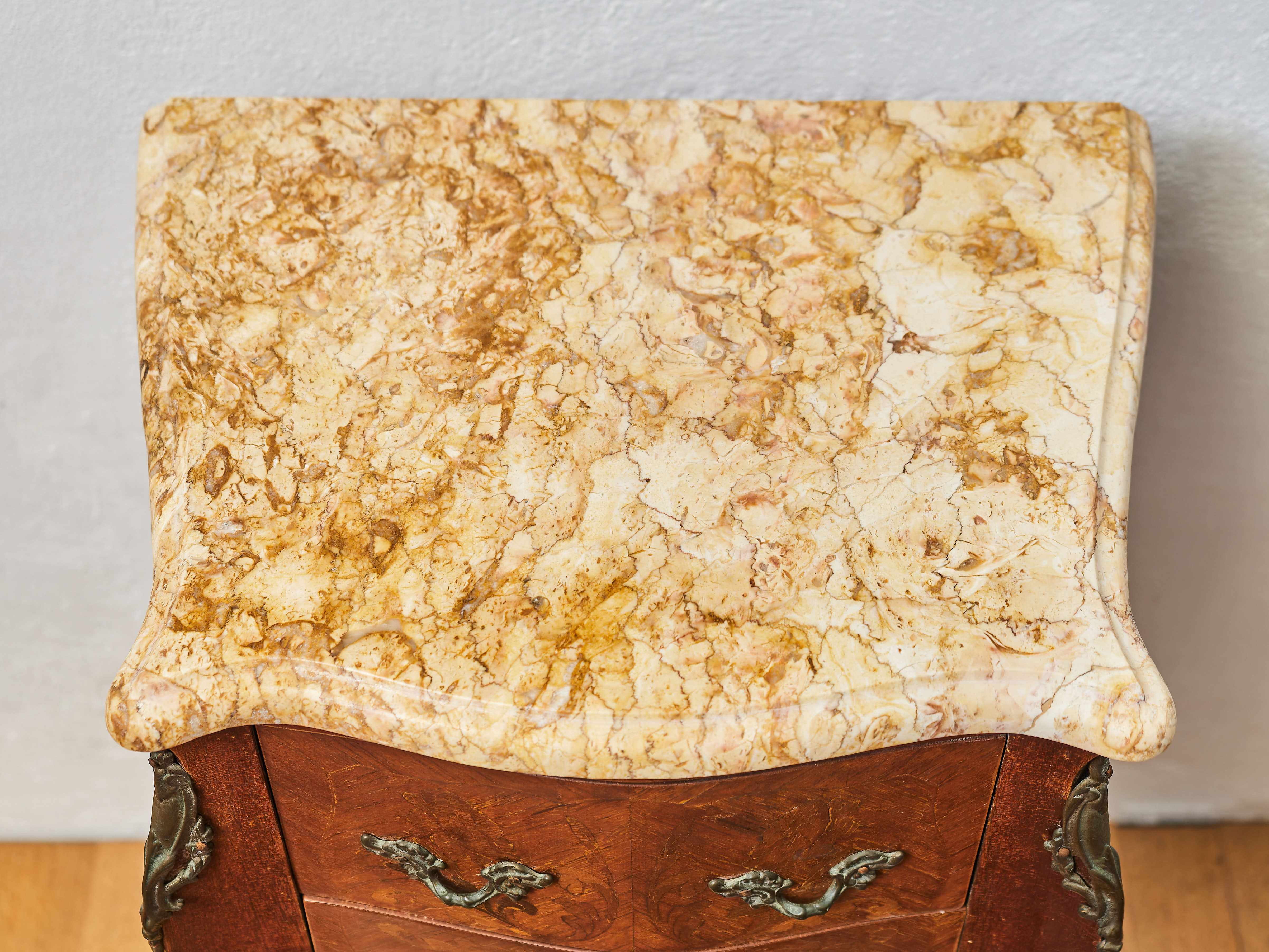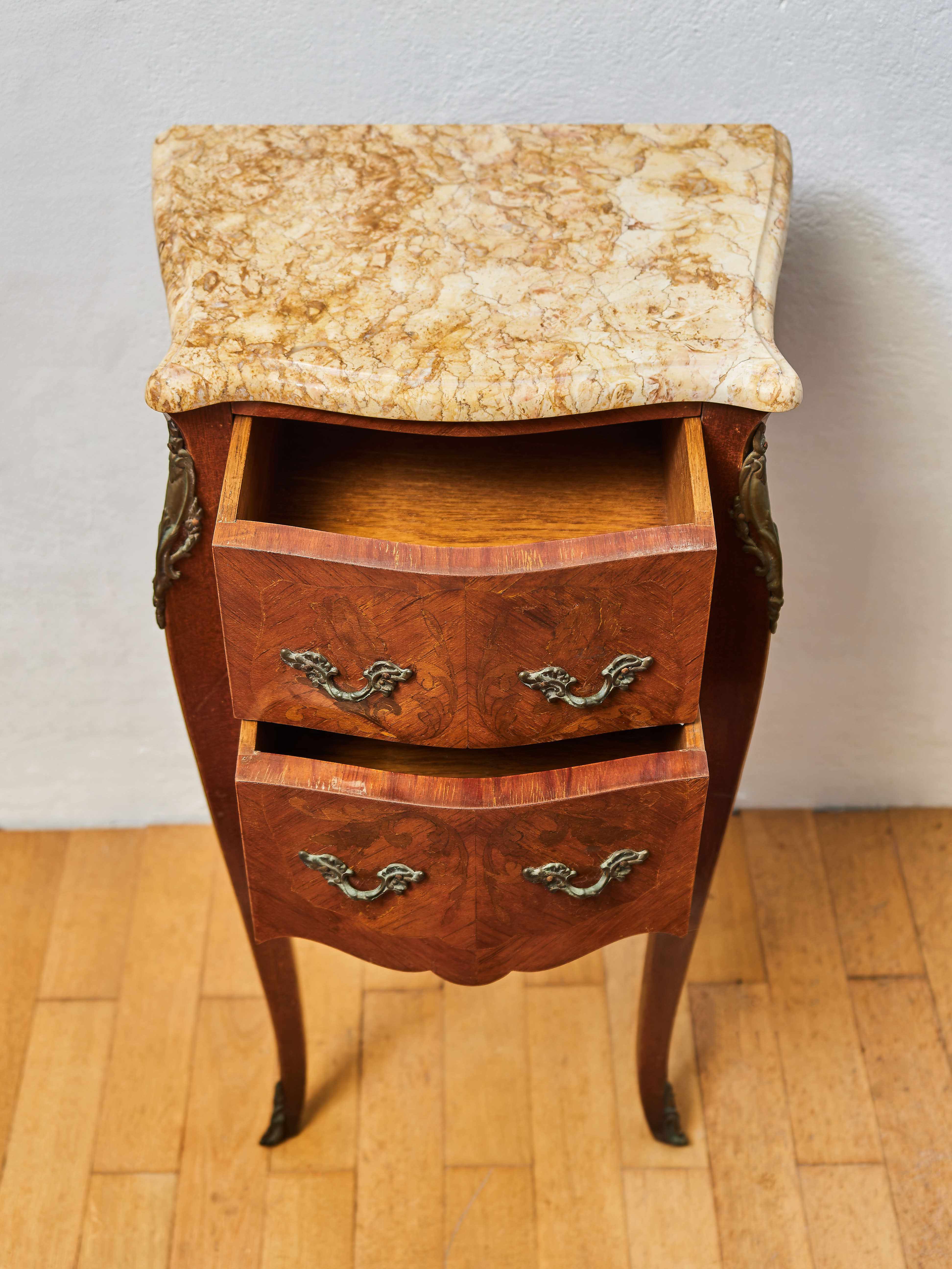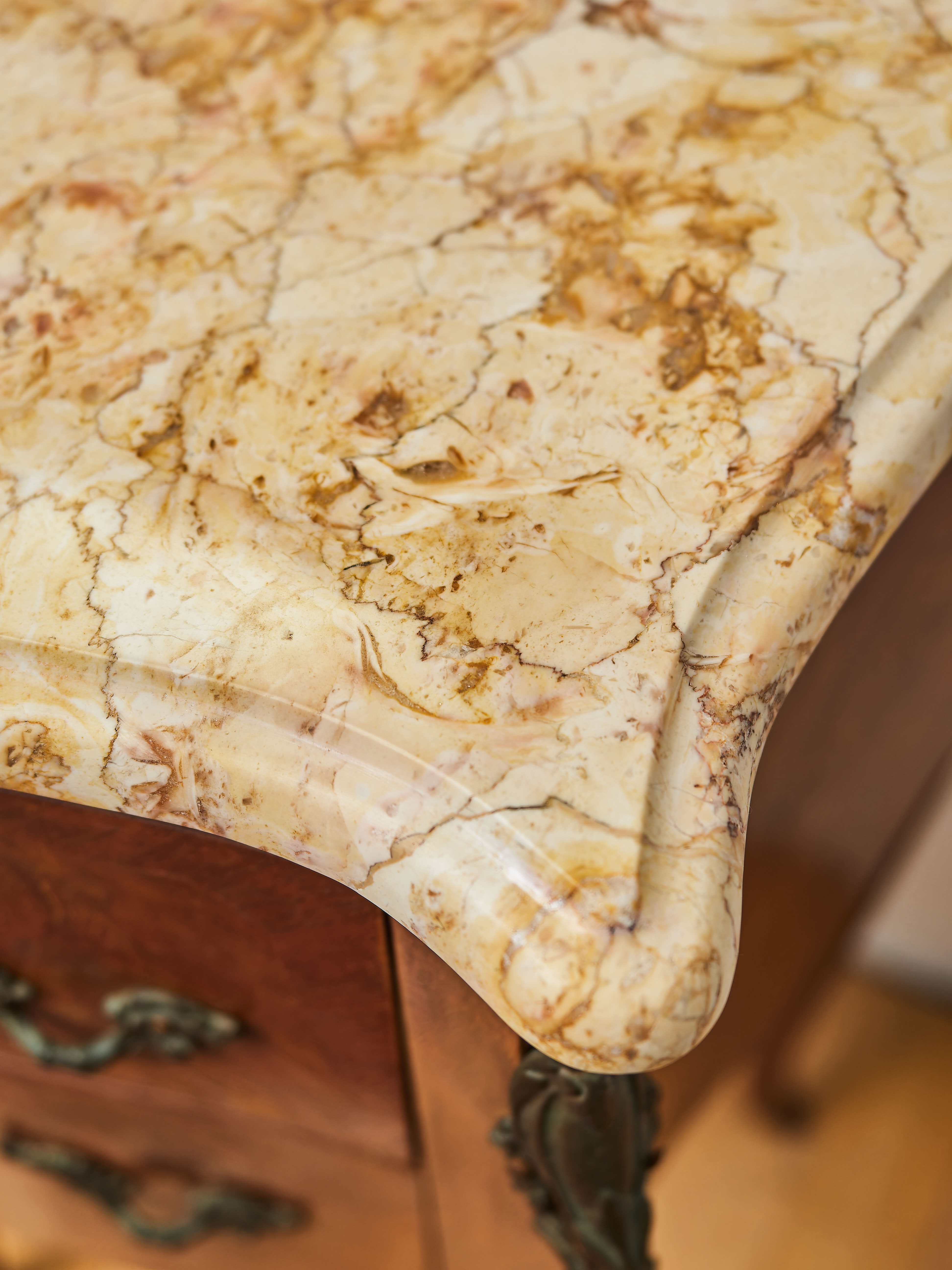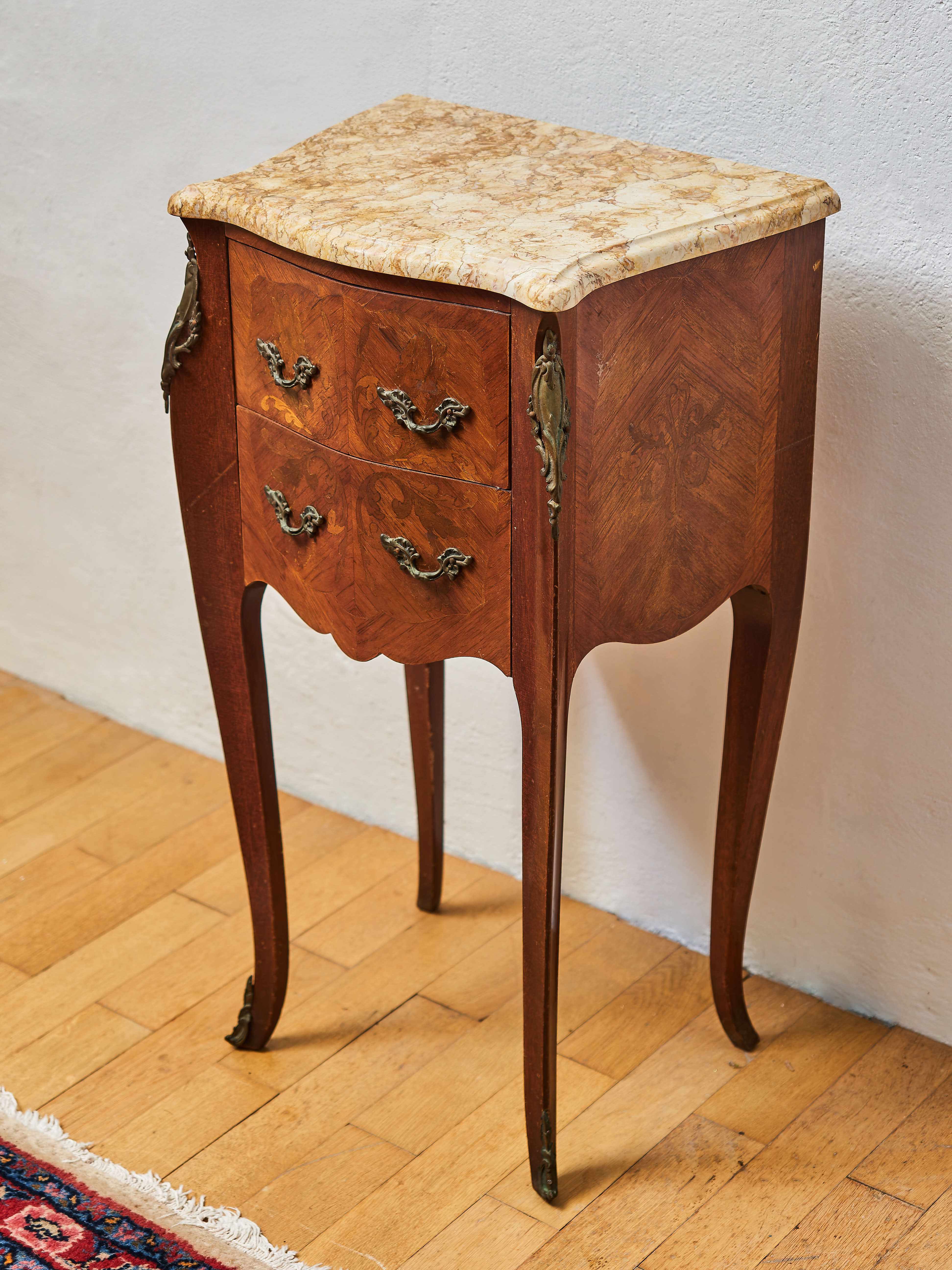 Krásná komodka / stolek se dvěma šuplíky. Komodka je zdobená rostlinou intarzií, litými bronzovými aplikacemi a bohatě profilovanou vrchní mramorovou deskou s fasetou. Šuplíčky mají cinkované spoje. Komodka je vhodná jak do vstupní haly, obývacího pokoje tak i jako noční stolek do ložnice.
