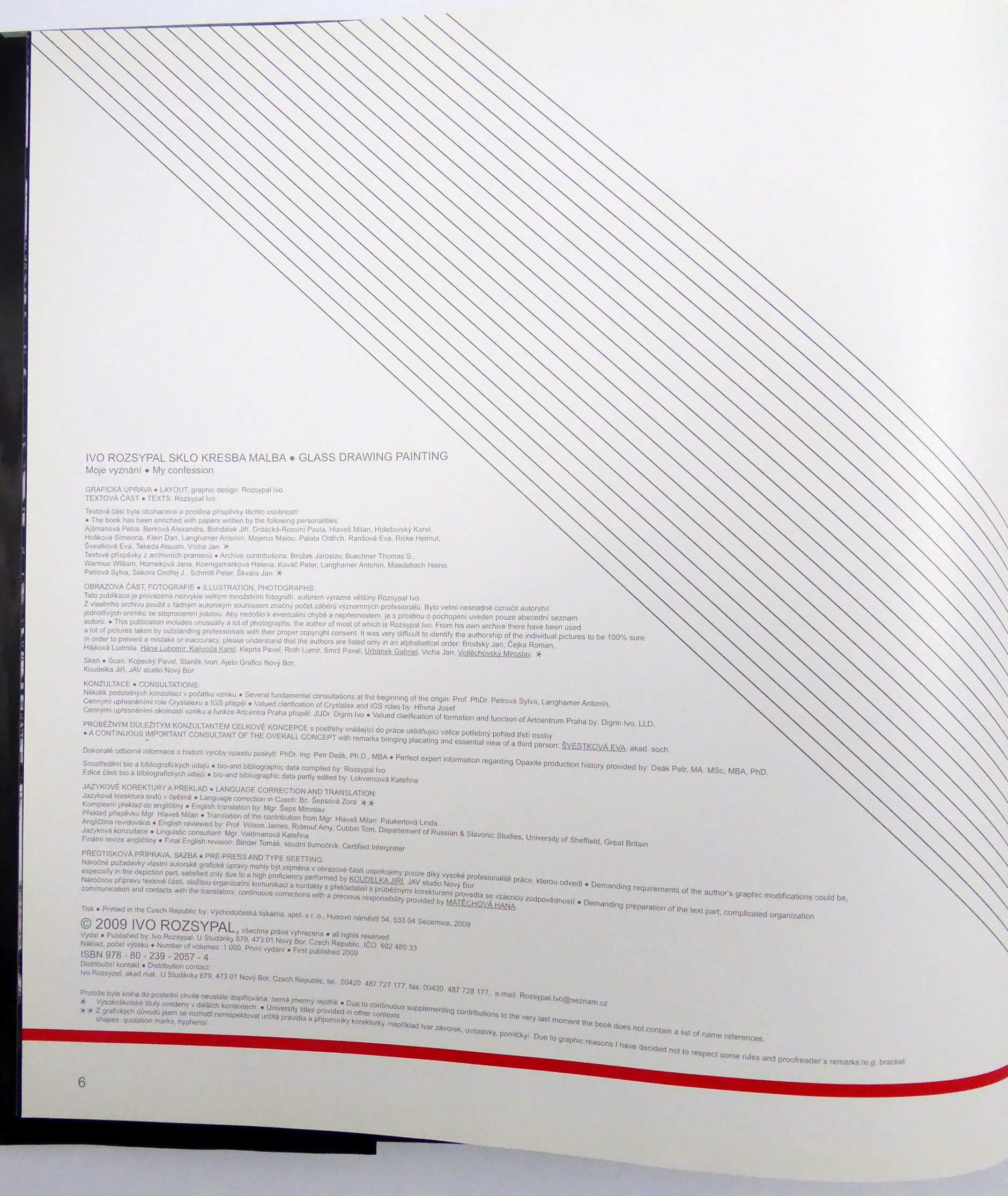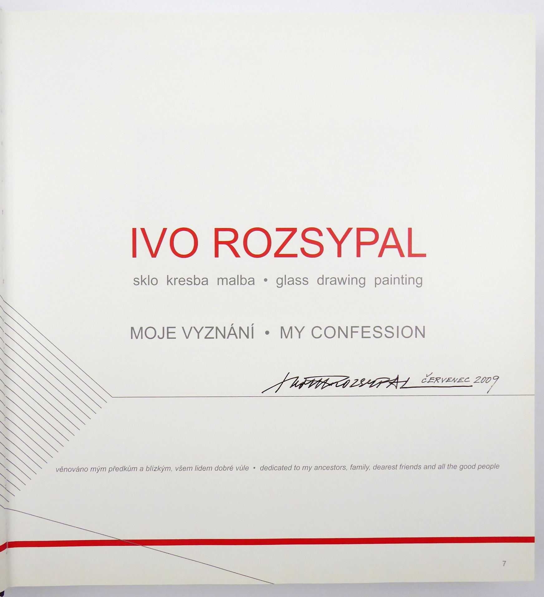 Rozsáhlá výpravná monografie s vlastnoručním podpisem autora s datací červenec 2009. Publikace vydaná v roce 2009 akademickým malířem Ivo Romanem Vojtěchem Rozsypalem v Novém Boru pod názvem: sklo kresba malba – glass drawing painting s podtitulem \\\“Mé vyznání\\\“. Komplexně autorské dílo včetně textů, fotografií i grafické úpravy. Ivo Rozsypal (1942-2021). Česká republika, Nový Bor, rok 2009. Rozměr: 33 cm x 30,5 cm.