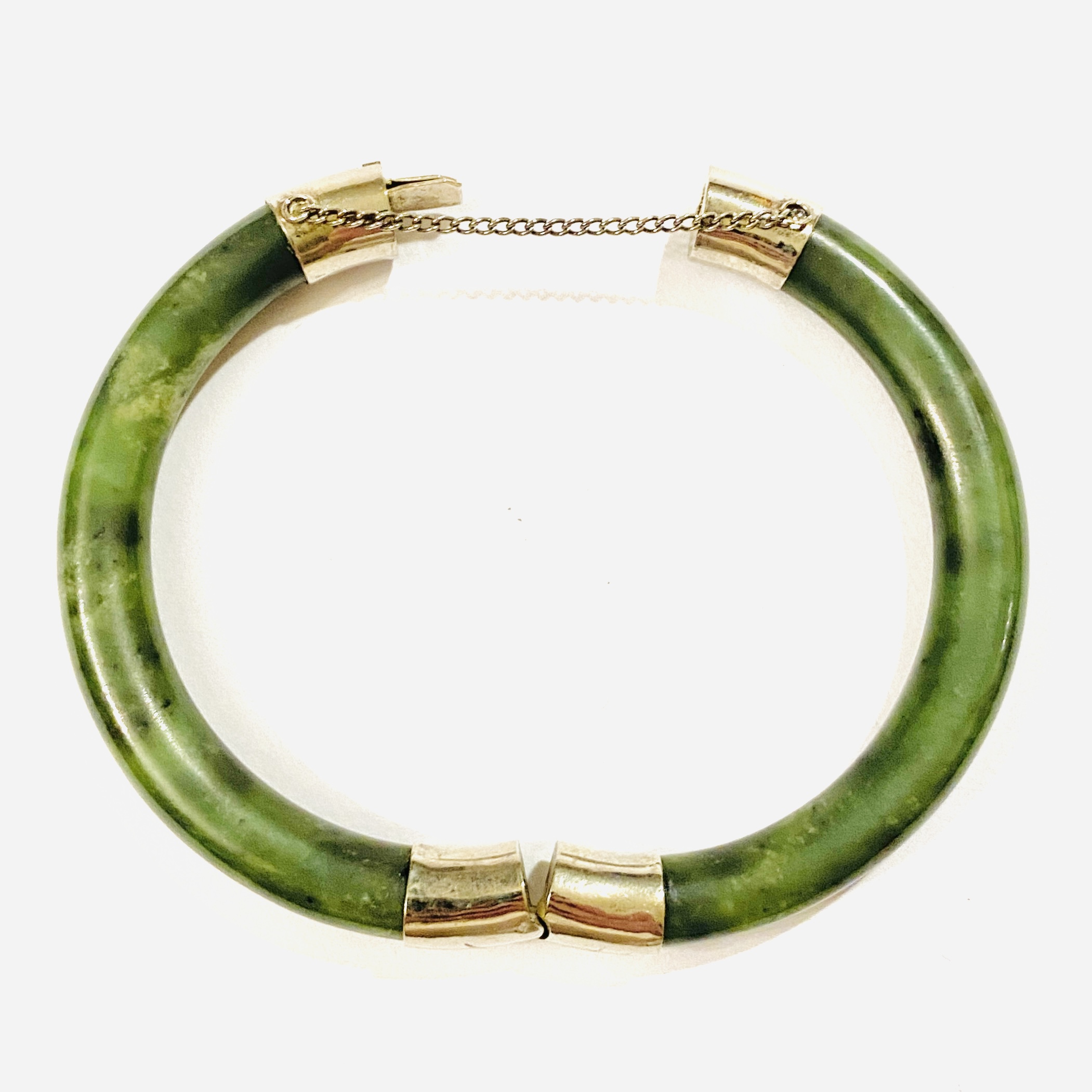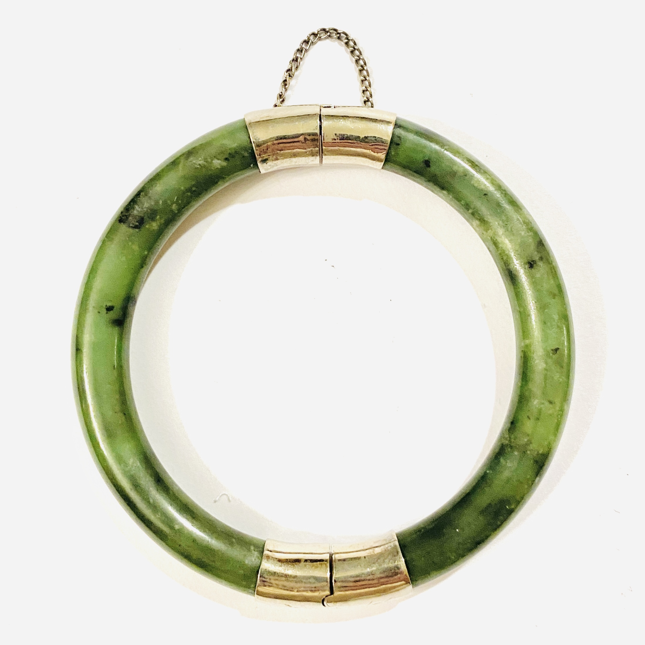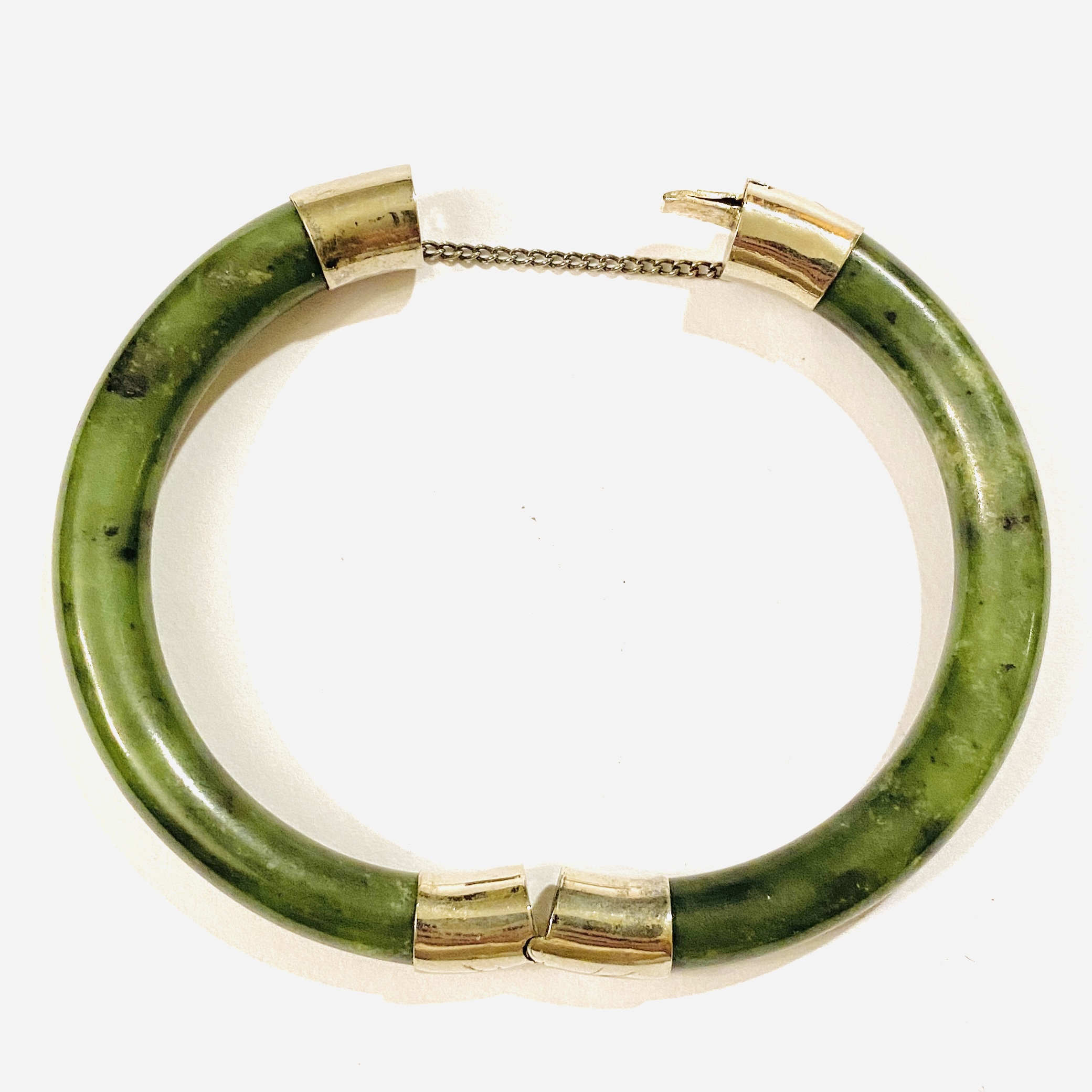 Starožitný, střídmě pojatý kruhový otevírací náramek zhotoven z přírodního sytě zeleného jadeitu, zapínání zdobeno minimalistickým rytím. Dobře kombinovatelný, na tuzemském trhu zřídka se vyskytující typ šperku, kvalitní čínská práce z 2. poloviny 20. století.