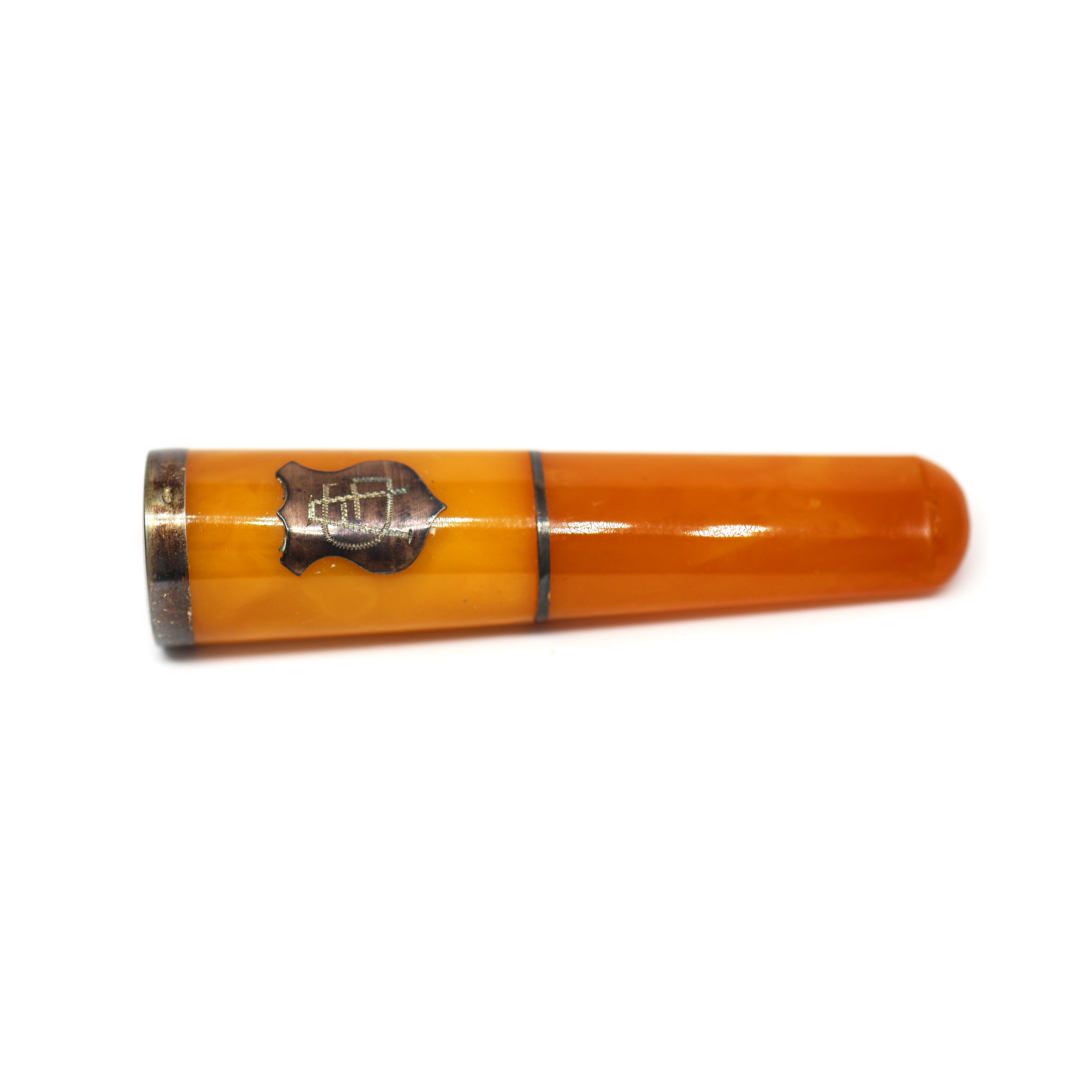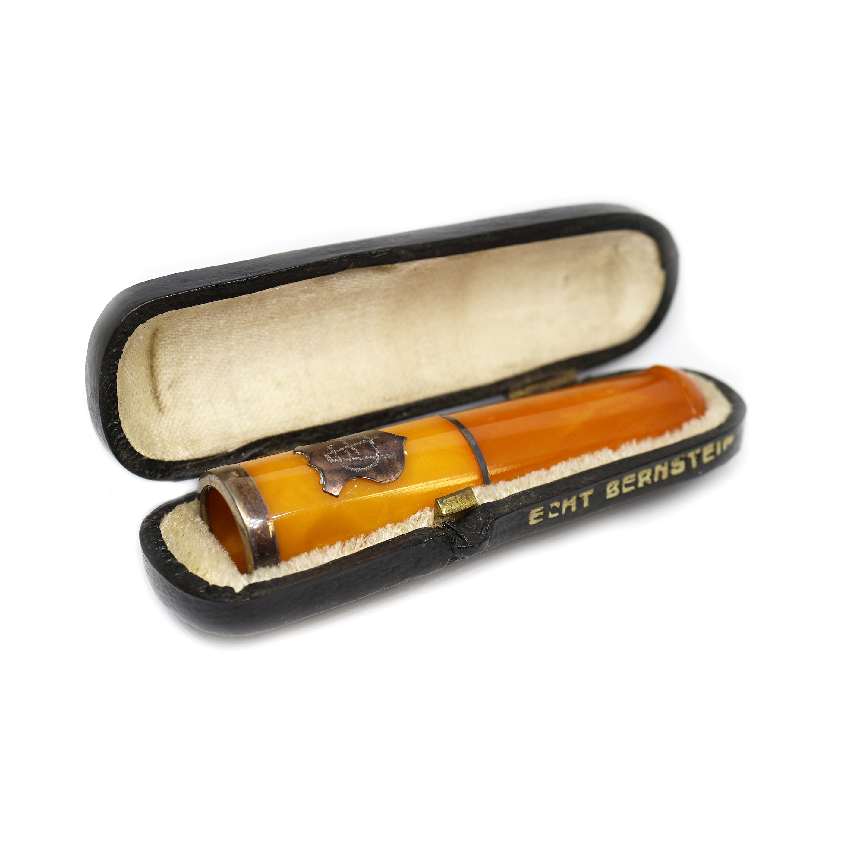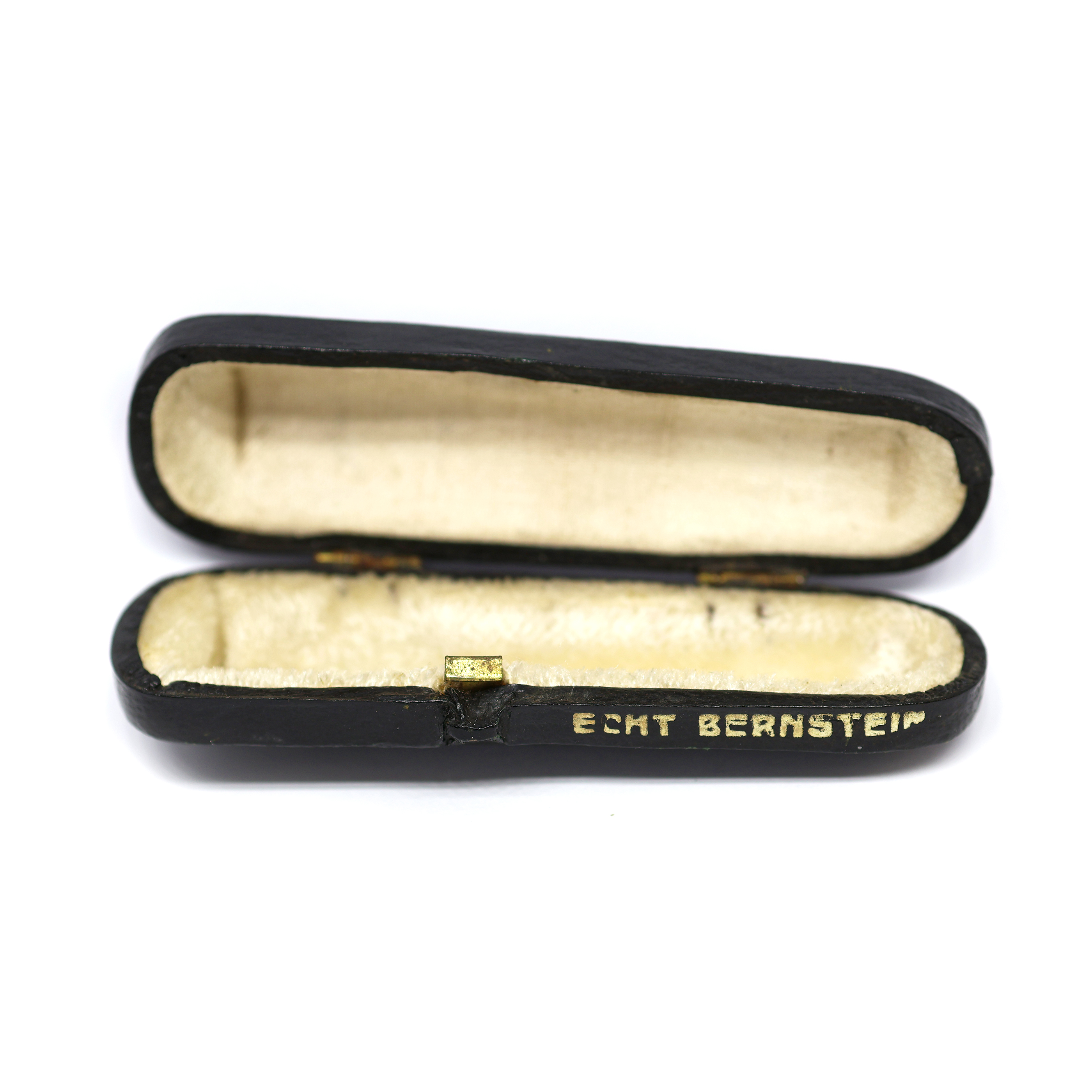 Jantarová špička s krabičkou se stříbrem V původní krabičce Rok 1930 Art deco Velmi dobrý stav Rozměry: 6,6cm délka