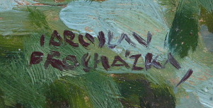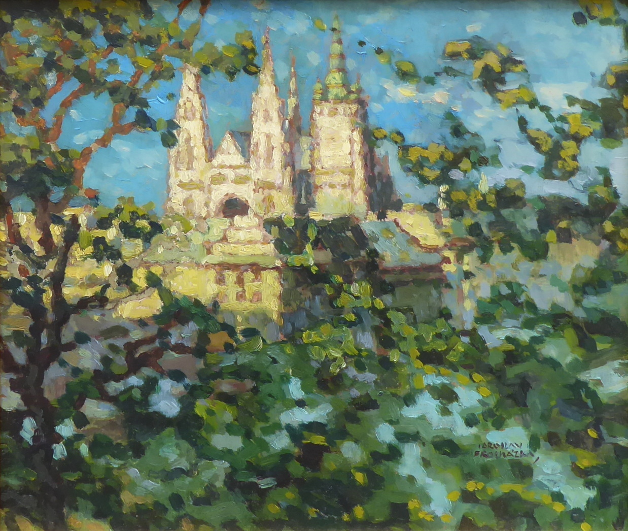 Olej na kartonu 39 cm x 45 cm. Signováno vpravo dole. Autor: Jaro (Jaroslav) Procházka (1886-1949). Sluncem ozářené průčelí Katedrály Sv. Víta a malostranských střech. Ve stylu slavného francouzského impresionisty – Claude Monet (1840-1926) – a jeho pohledů na katedrály. Černý široký rám se zlatou zdobnou vnitřní lištou. Československo, 20. léta minulého století. Celkový rozměr s rámem 53 cm x 59 cm.
