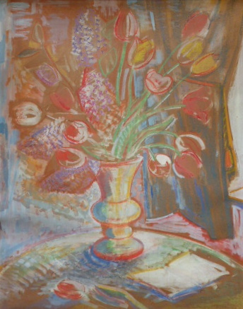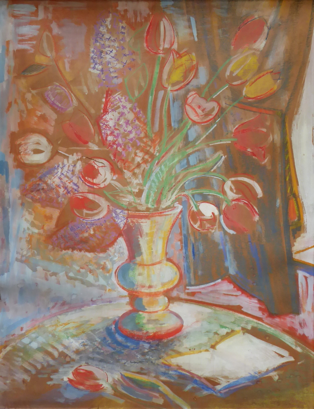 Pastel na kartonu 92 cm x 71 cm. Signováno vpravo dole. Autor: Jaroslav Grus (1891-1983). Fauvistické zátiší s tulipány a hyacinty ve váze. V popředí otevřená kniha a ležící květ. V originálním umělecky pojatém rámu s reliéfními ozdobami. Karton na levém okraji na jednom místě zvlněný. Československo, 40. léta minulého století. Celkový rozměr s rámem 114 cm x 92 cm.