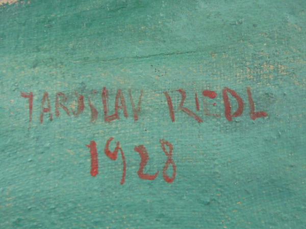 Jaroslav Riedl(2.1.1893-koncentrační tábor za 2. sv. války) malíř a grafik žák Akademie výtvarných umění v Praze u prof. Preislera 1909-1914. Za první světové války padl v Rusku do zajetí, později zařazen do čs. vojska v roce 1916. Stal se majorem čs. armády. S malířem Svobodou založil Sdružení výtvarných umělců severočeských. Maloval krajiny, podobizny, zátiší a vojáky. Olej na plátně 45 x 60 cm. Vpravo dole signatura s datací 1928. Původní rám 57 x 72 cm.