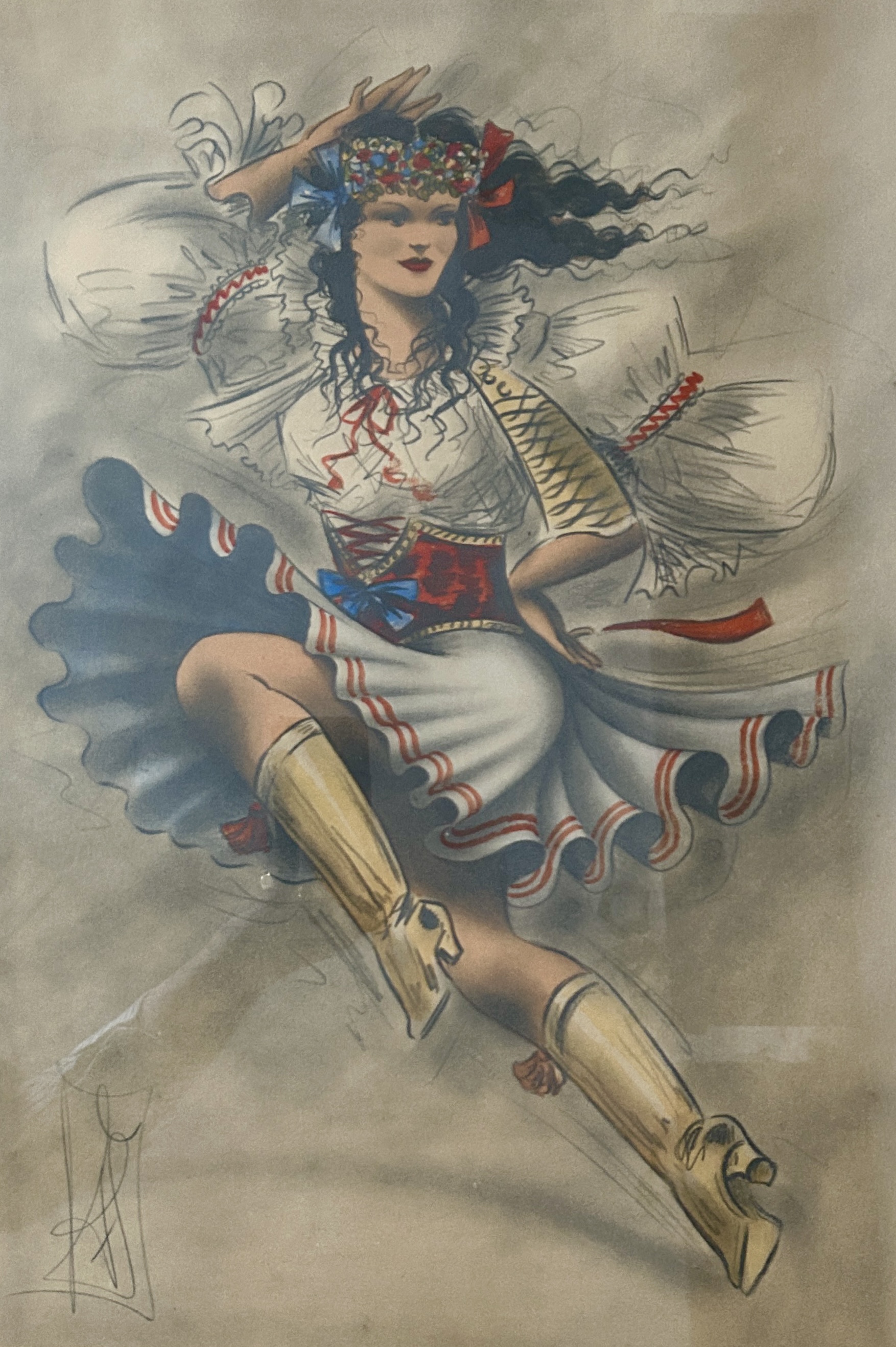 Obraz s motivem půvabné tanečnice v kroji od českého malíře a grafika Jaroslava Štiky. Živě pojatá postava mladé tančící dívky při skoku, oděna v bílém kroji s červenými detaily zdůrazňující smyslné křivky těla. Honosná květinová čelenka s rozpuštěnými černými kadeřemi rámuje neportrétní tvář ostřejších rysů, ve víru tance jsou tak zřetelné i horní partie nohou s vysokými žlutými kozačkami. Volné pozadí pouze s naznačenými liniemi dynamického pohybu nechávají vyniknou samotný námět s erotickým podtextem. Expresivnější technika s důrazem na rychle načrtnuté linie, světelná modelace precizována díky pečlivému kolorování, jež využívá elementárních barev.