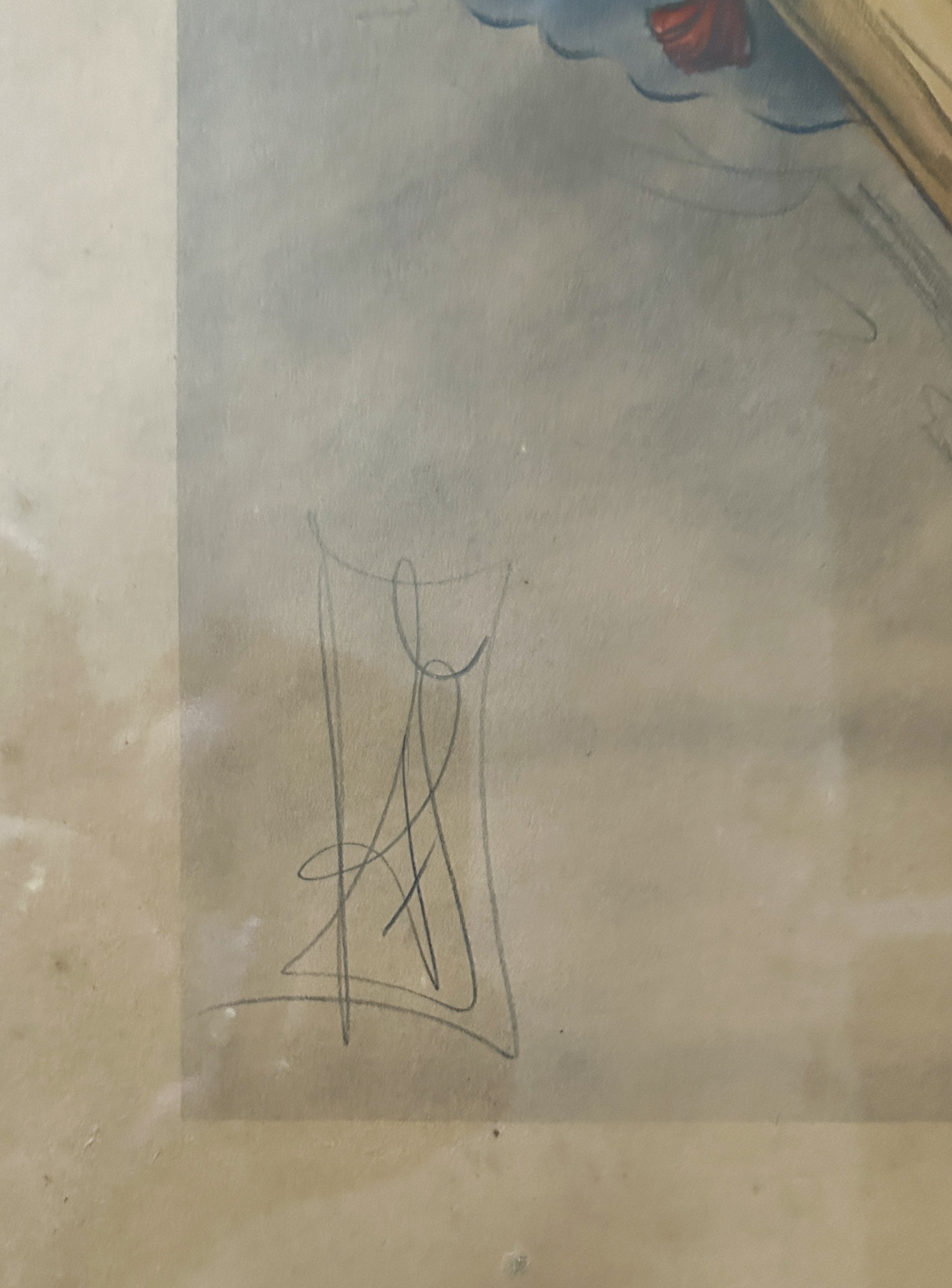Kombinovaná technika na papíře, širší volný prostor nahrazující paspartu, zaskleno, rámováno ve stříbřitém rámu s ornamentálně plastickými lištami. Signováno tužkou vlevo dole stylizovaným monogramem. Zezadu opatřeno štítkem rámaře. Výška s rámem 77 cm, šířka 56,5 cm, malba výška 50 cm, šířka 34,5 cm. Malba v původním nečištěném stavu, papír mírně zvlněný, místy zašpiněn, při pravém horním rohu skvrna; rám s drobnými defekty jinak zachovalý.