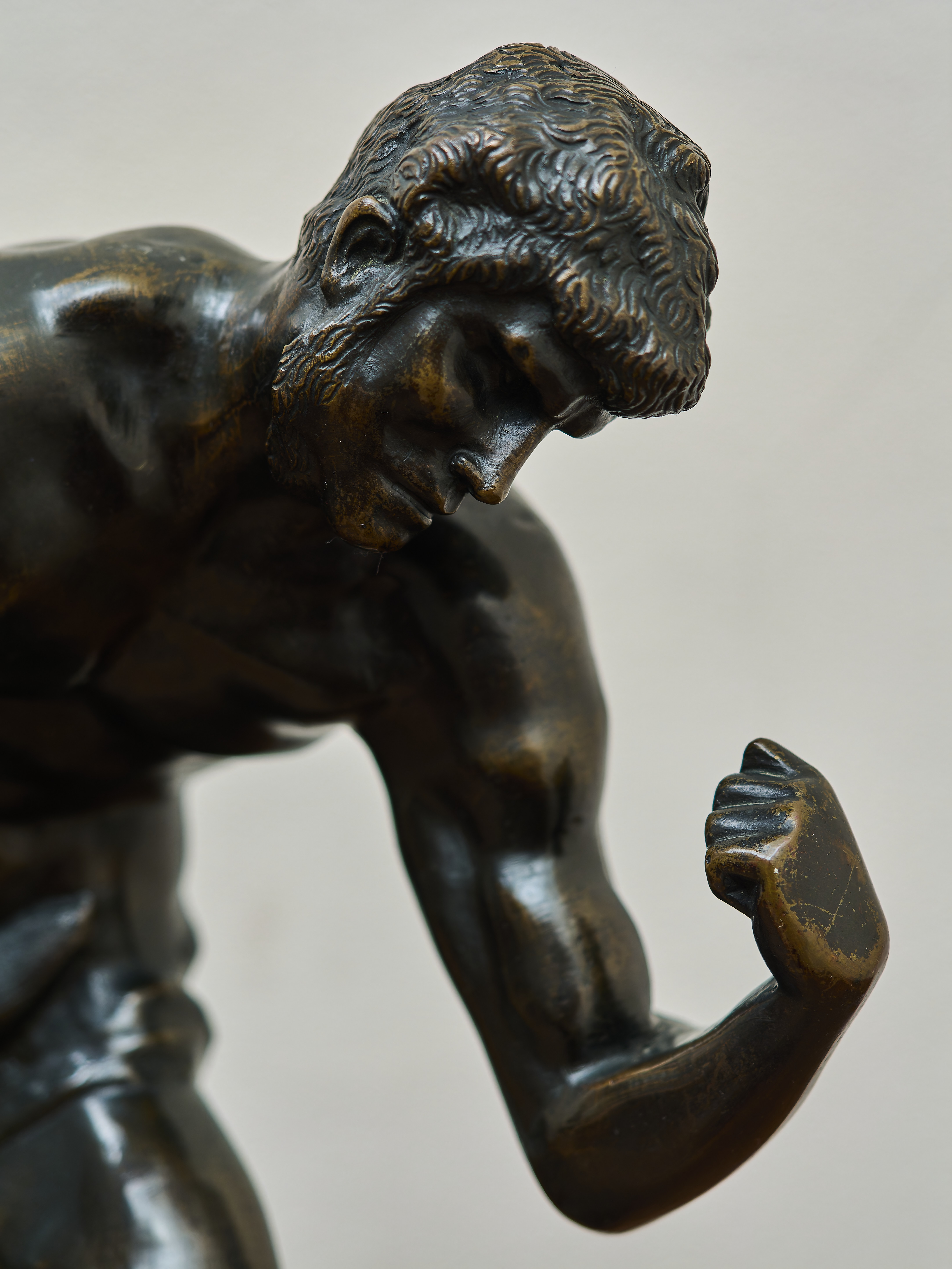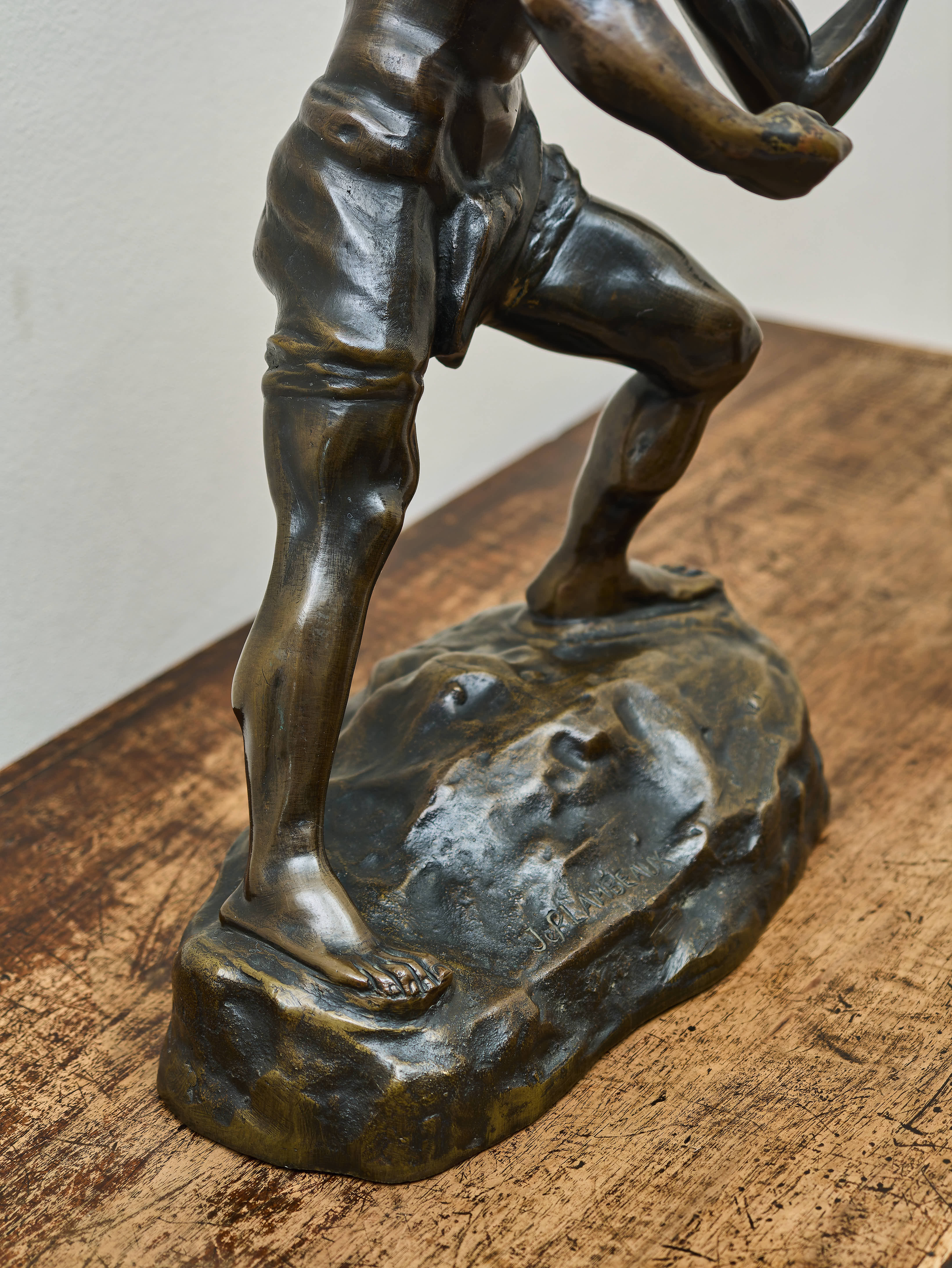 Plastika stojí na stylizovaném skalnatém podstavci, který podporuje dramatickou kompozici celé figury. Tmavá patina bronzu zdůrazňuje plastické modelování svalů a detaily anatomie. Dílo představuje působivou ukázku realistické figurální plastiky inspirované antickým ideálem lidské krásy a síly.
