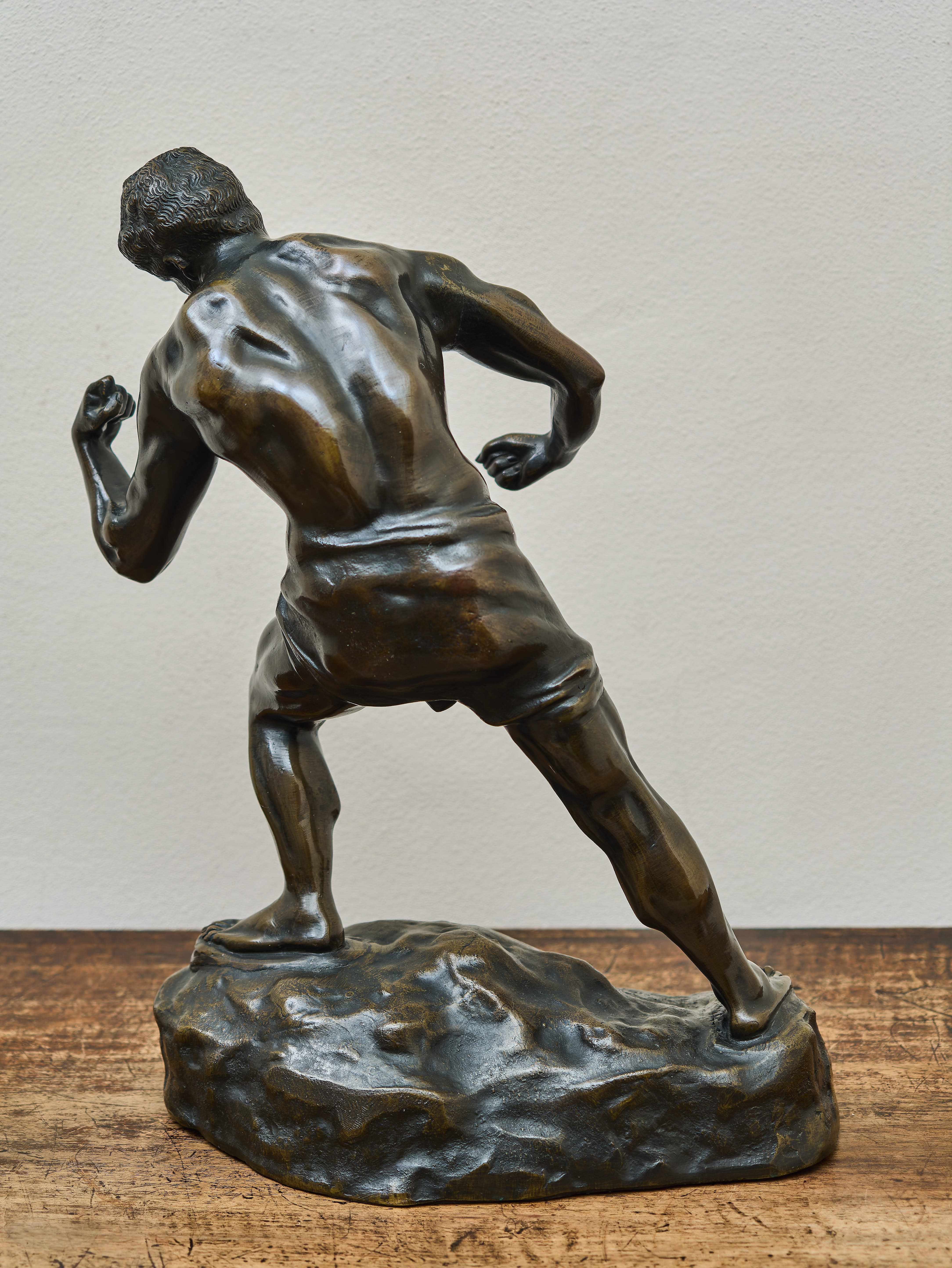 Bronzová plastika představující atletickou mužskou postavu v dynamickém postoji, inspirovanou ideály klasického antického sochařství. Figura je zachycena v okamžiku napětí a síly, s výrazně modelovaným svalstvem a energickým gestem paží, které zdůrazňuje dramatiku pohybu. Kompozice vychází z tradice realistického akademického sochařství konce 19. století, které se často inspirovalo antickými sportovci a hrdiny.