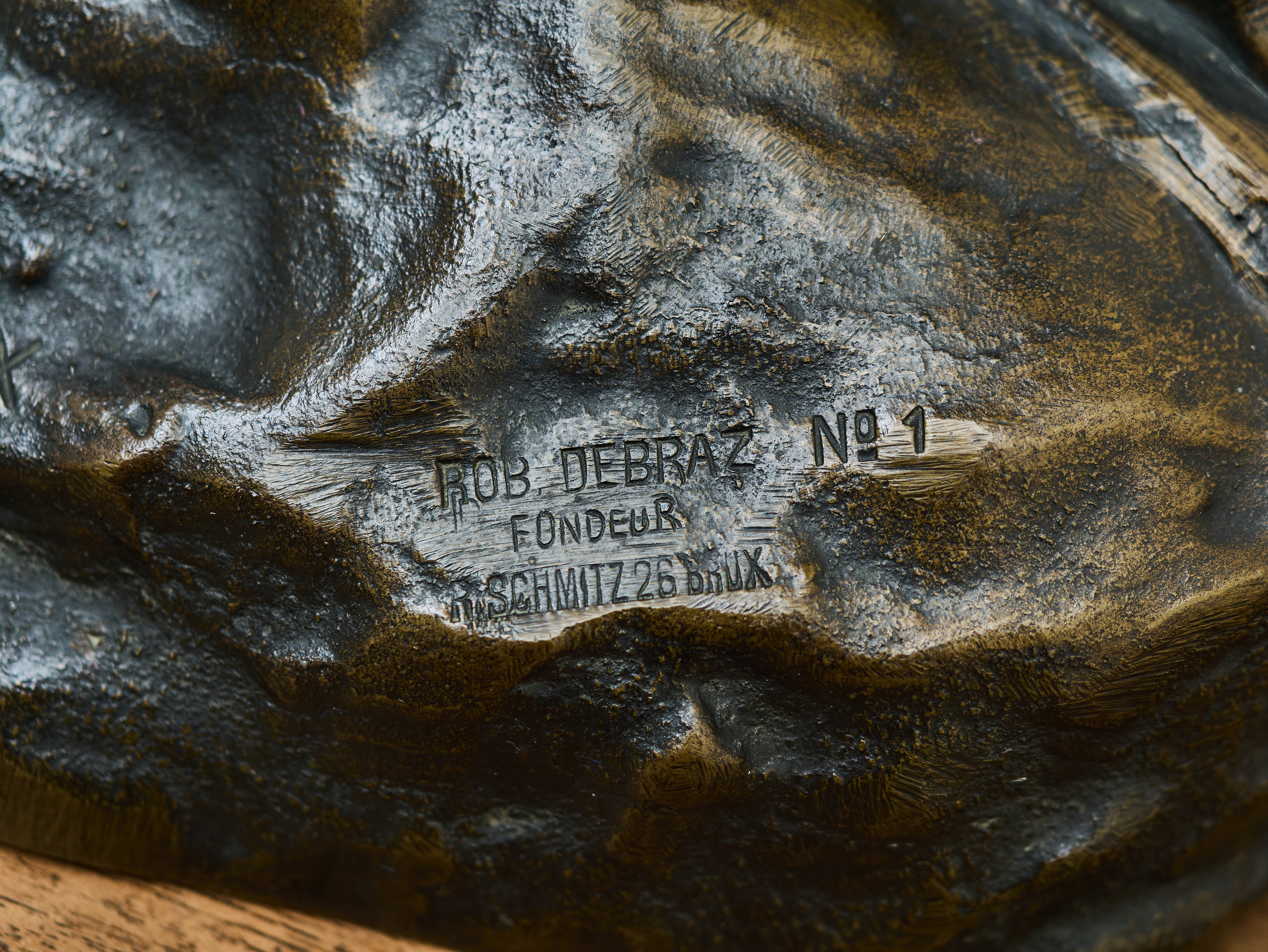 Socha byla odlita v bruselské slévárně Roberta Debraze, což potvrzuje signatura na podstavci: „ROB. DEBRAZ FONDEUR – RUE SCHMITZ 26 BRUX“. Debraz patřil mezi známé belgické slévače bronzů na přelomu 19. a 20. století a spolupracoval s řadou významných sochařů. Na podstavci je rovněž signatura autora „Jef Lambeaux“ a označení „No 1“, které pravděpodobně odkazuje na číslo odlitku nebo modelu.