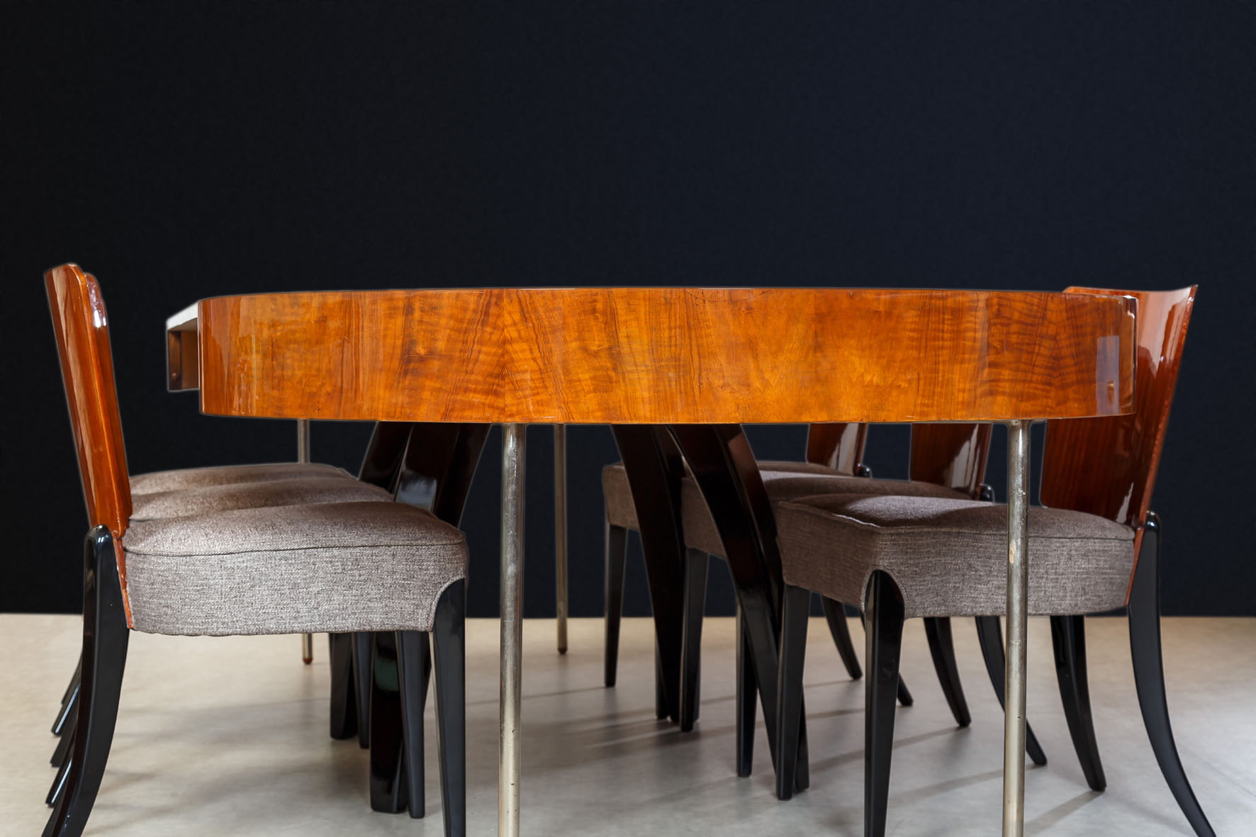 Materiál-jídelní deska opetřena nově dýhou Teaku, nohy bukový masiv, podpůrné nohy leštěná ocel