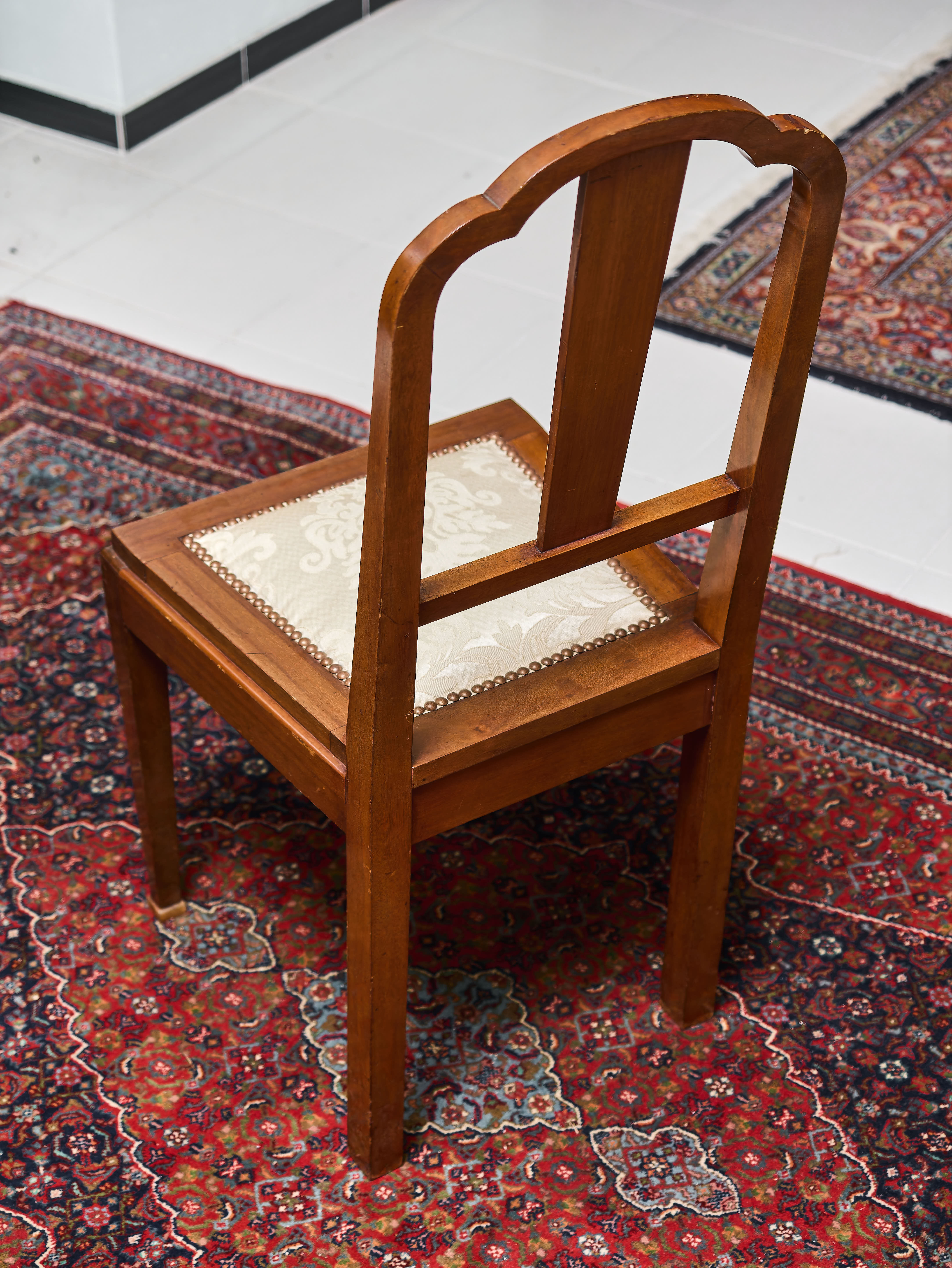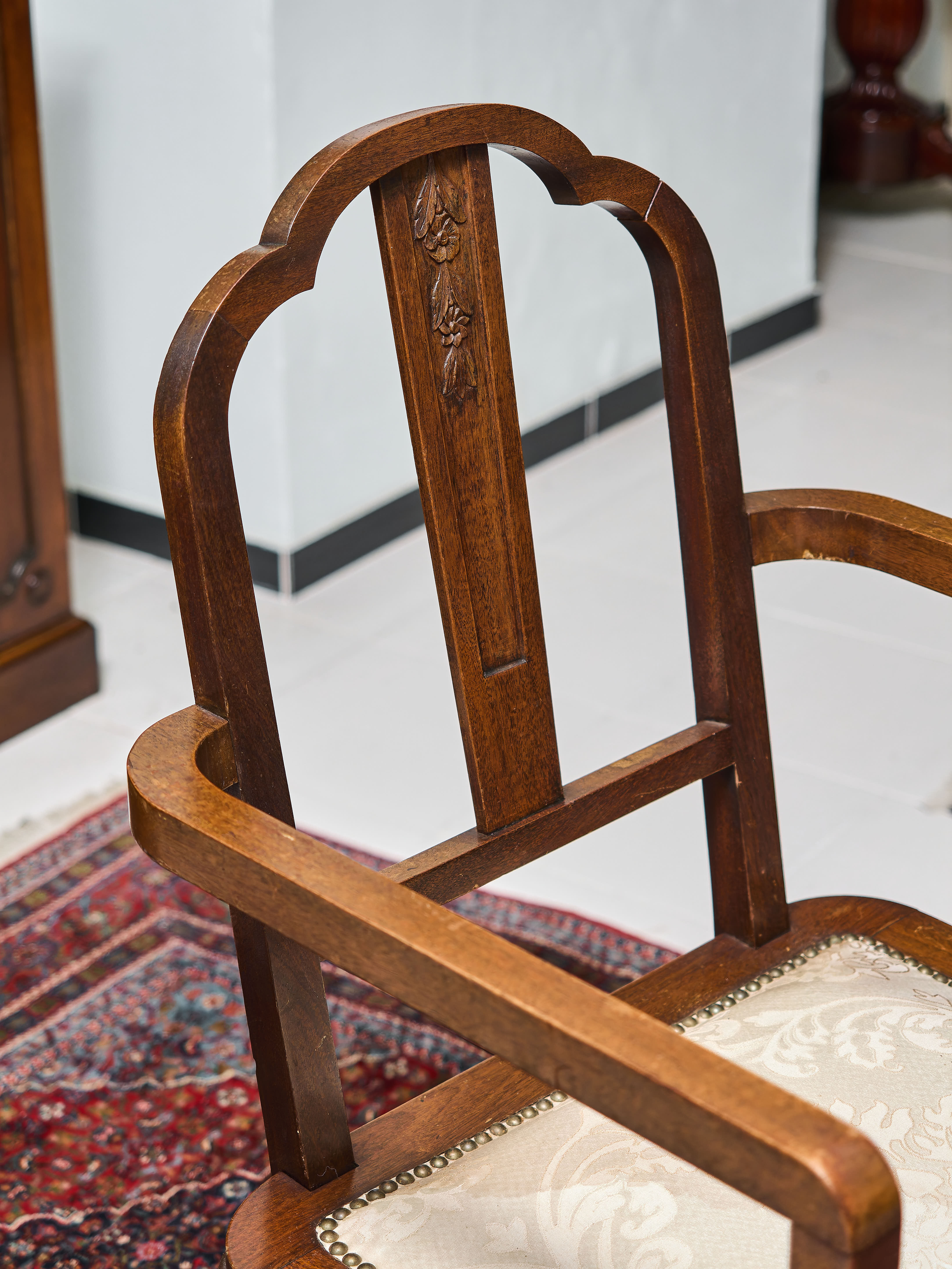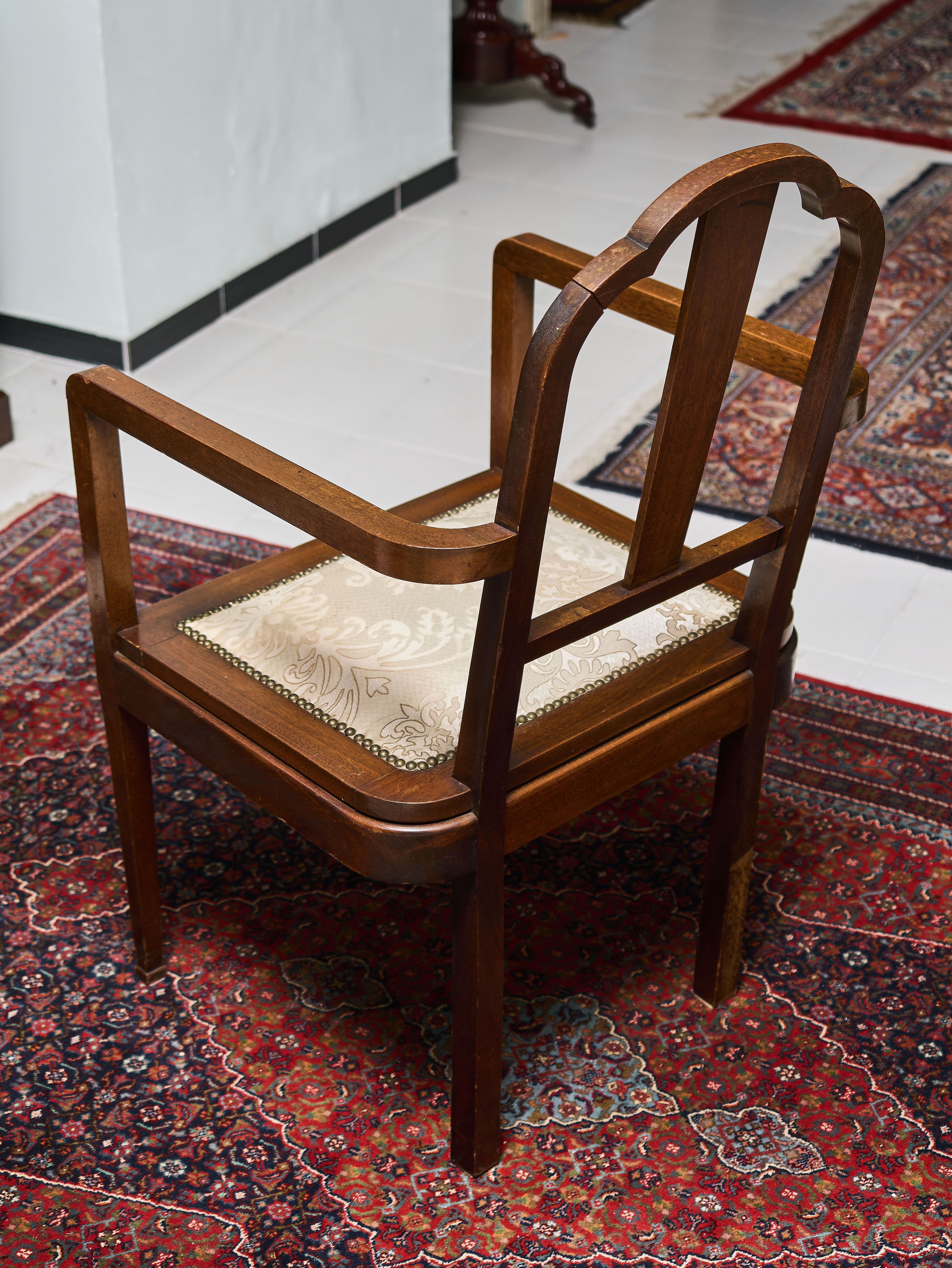 Židle i křesla s područkami jsou koncipovány v jednotném tvarosloví. Vyznačují se mírně obloukovitými opěradly s centrálním svislým polem, zdobeným jemnou řezbou s florálním motivem. Sedáky jsou čalouněné světlou textilií s decentním vzorem, upevněnou tradičními čalounickými hřebíčky. Konstrukce židlí je pevná, s důrazem na ergonomii a komfort sezení. Křesla s područkami dodávají soupravě slavnostnější a reprezentační charakter.