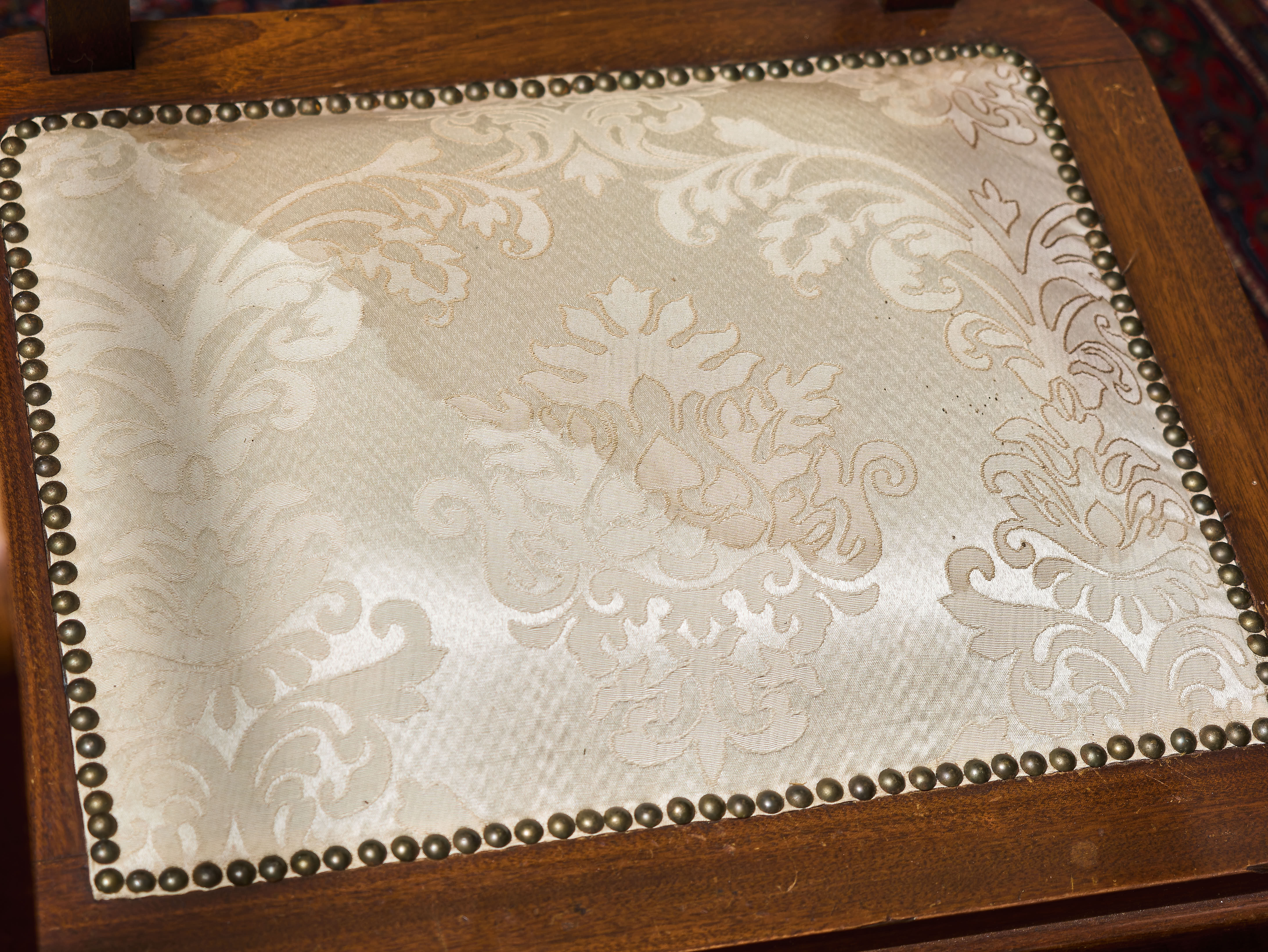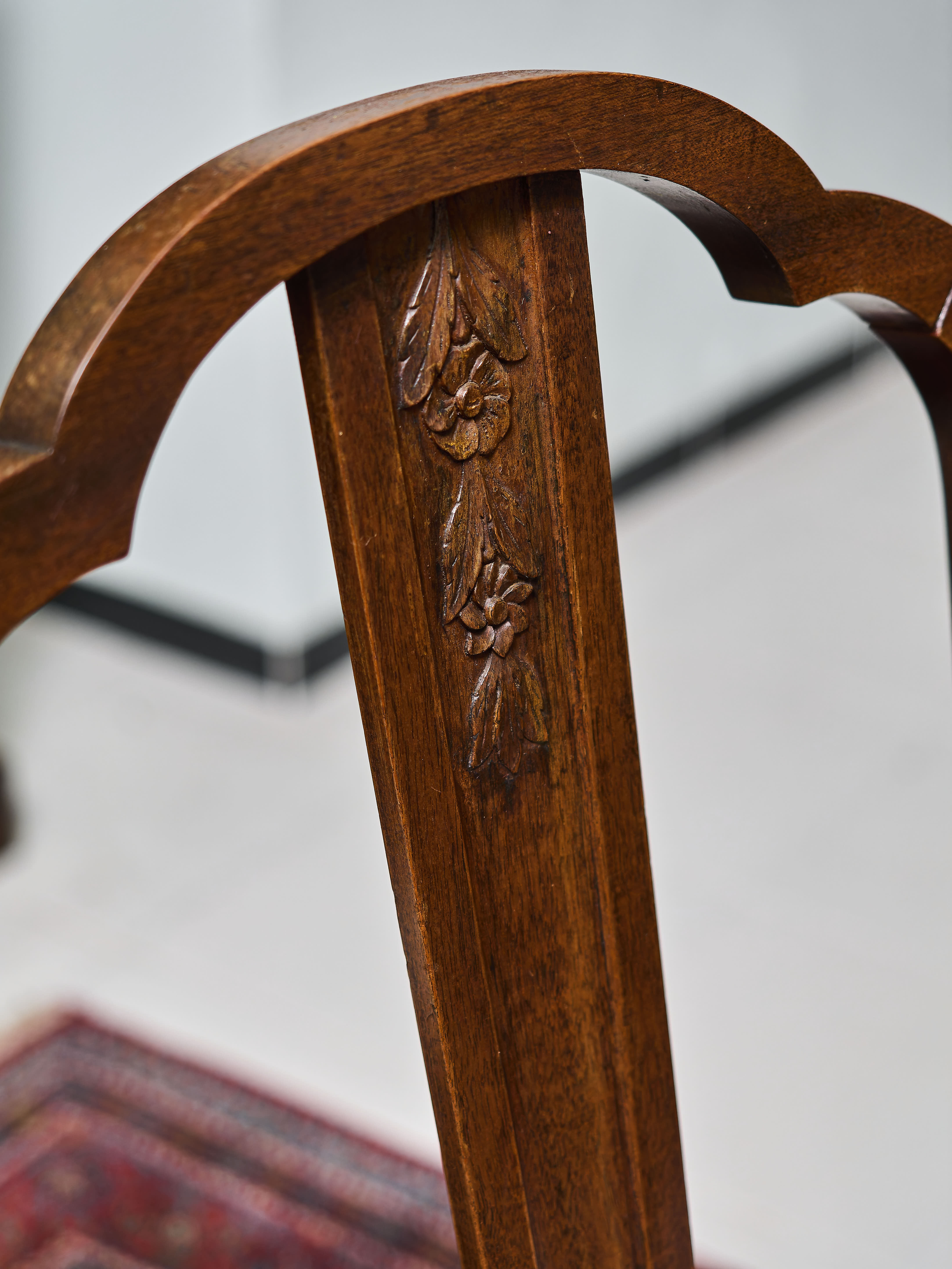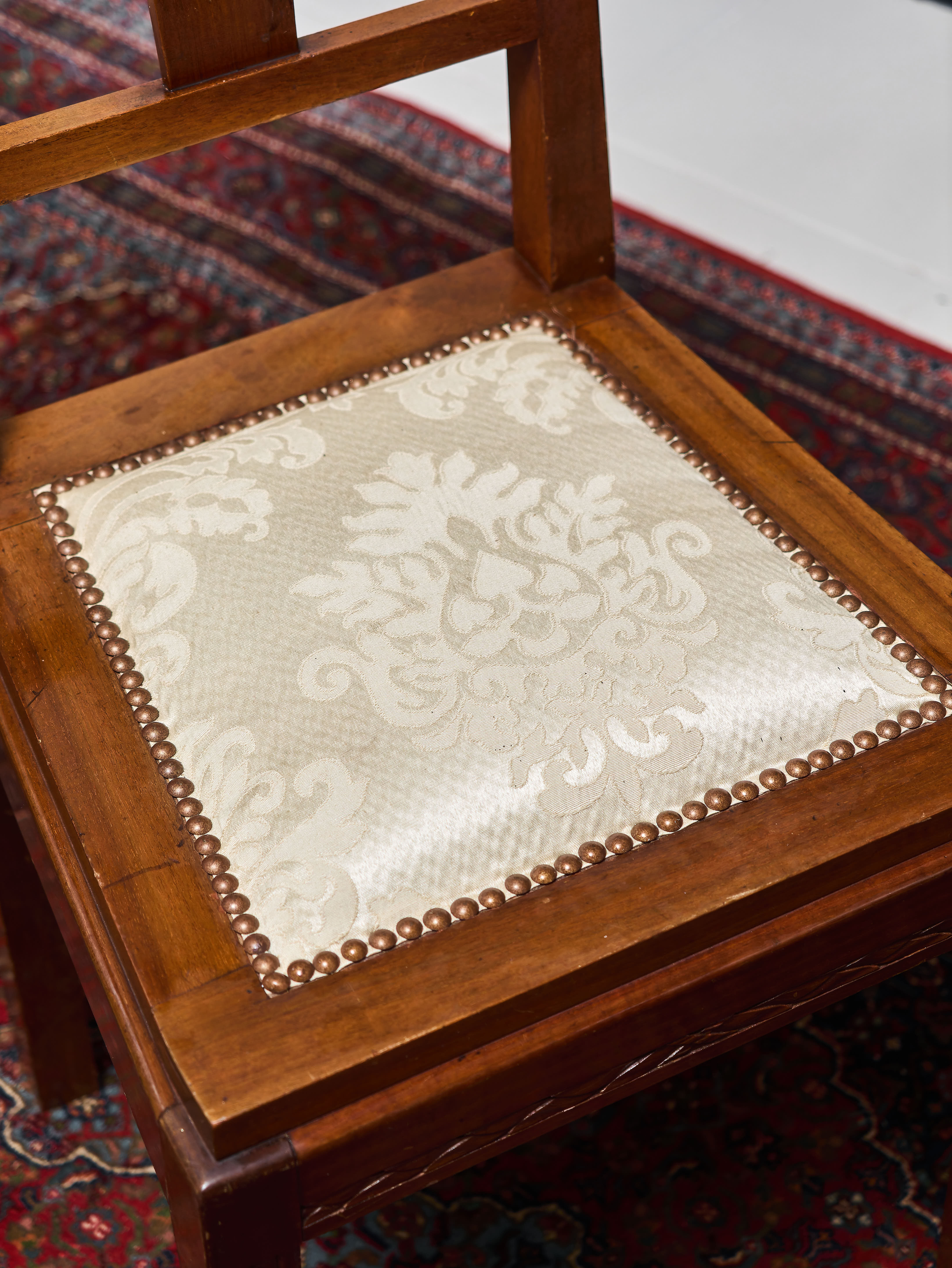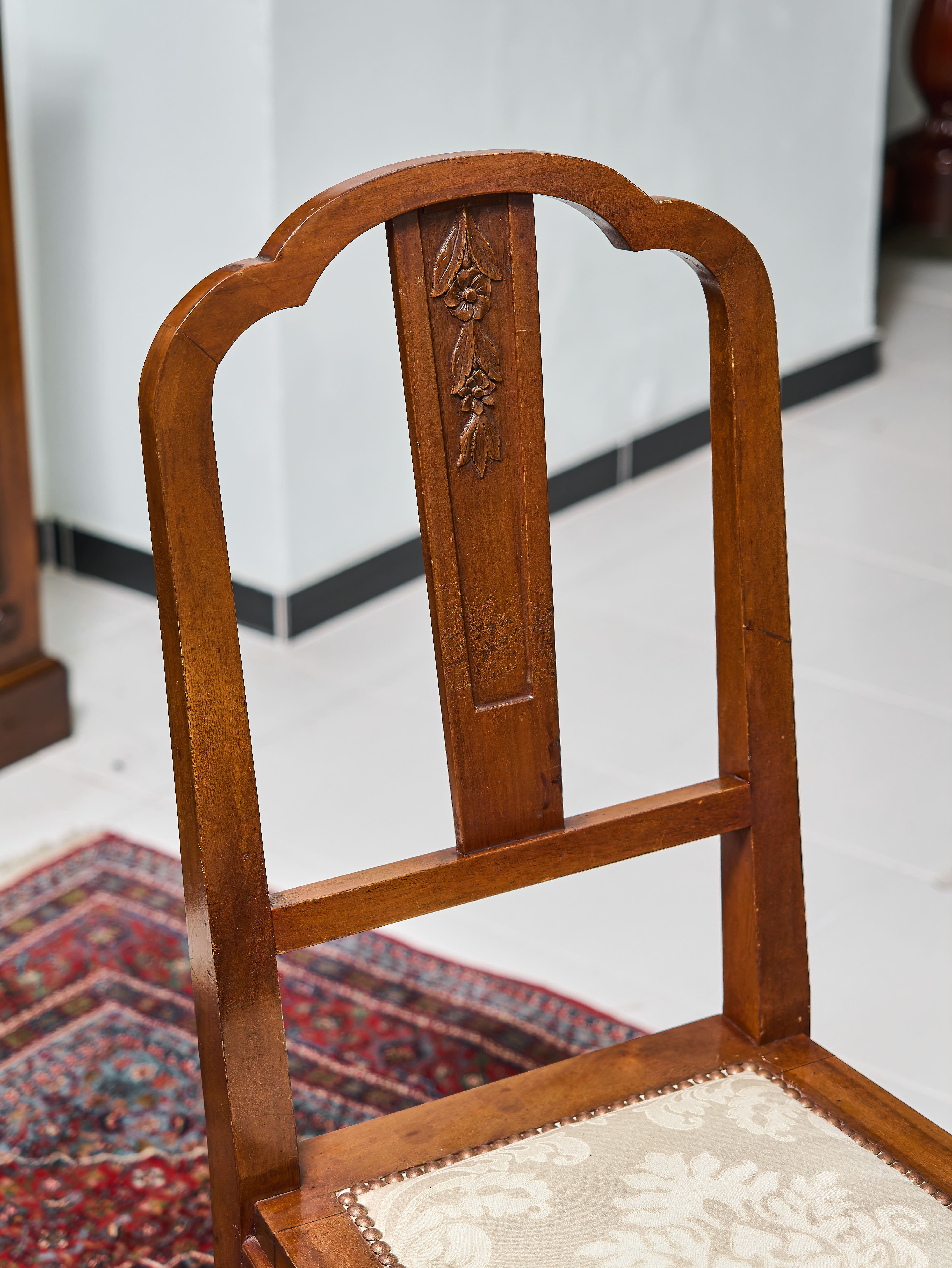 Židle i křesla s područkami jsou koncipovány v jednotném tvarosloví. Vyznačují se mírně obloukovitými opěradly s centrálním svislým polem, zdobeným jemnou řezbou s florálním motivem. Sedáky jsou čalouněné světlou textilií s decentním vzorem, upevněnou tradičními čalounickými hřebíčky. Konstrukce židlí je pevná, s důrazem na ergonomii a komfort sezení. Křesla s područkami dodávají soupravě slavnostnější a reprezentační charakter.