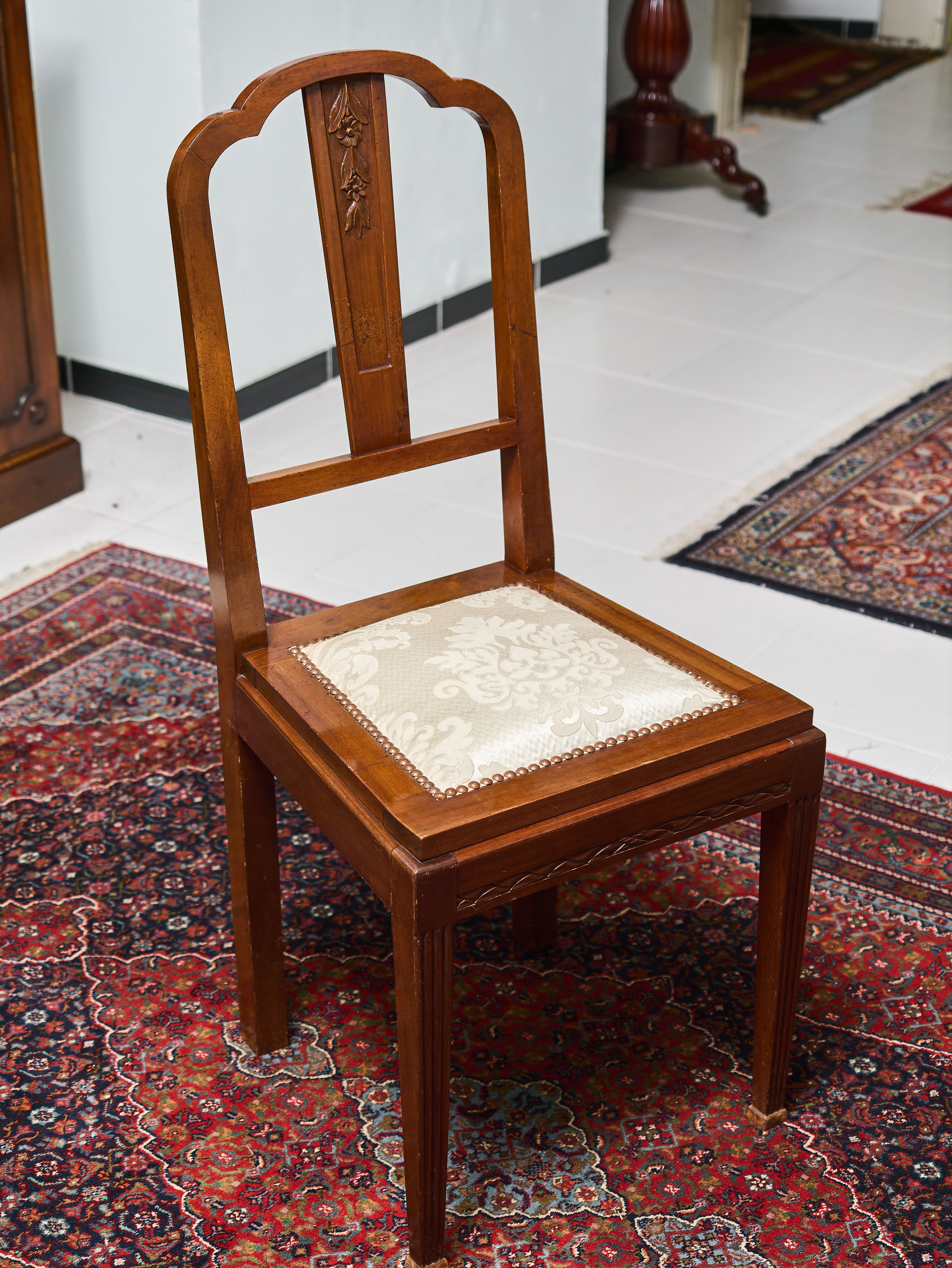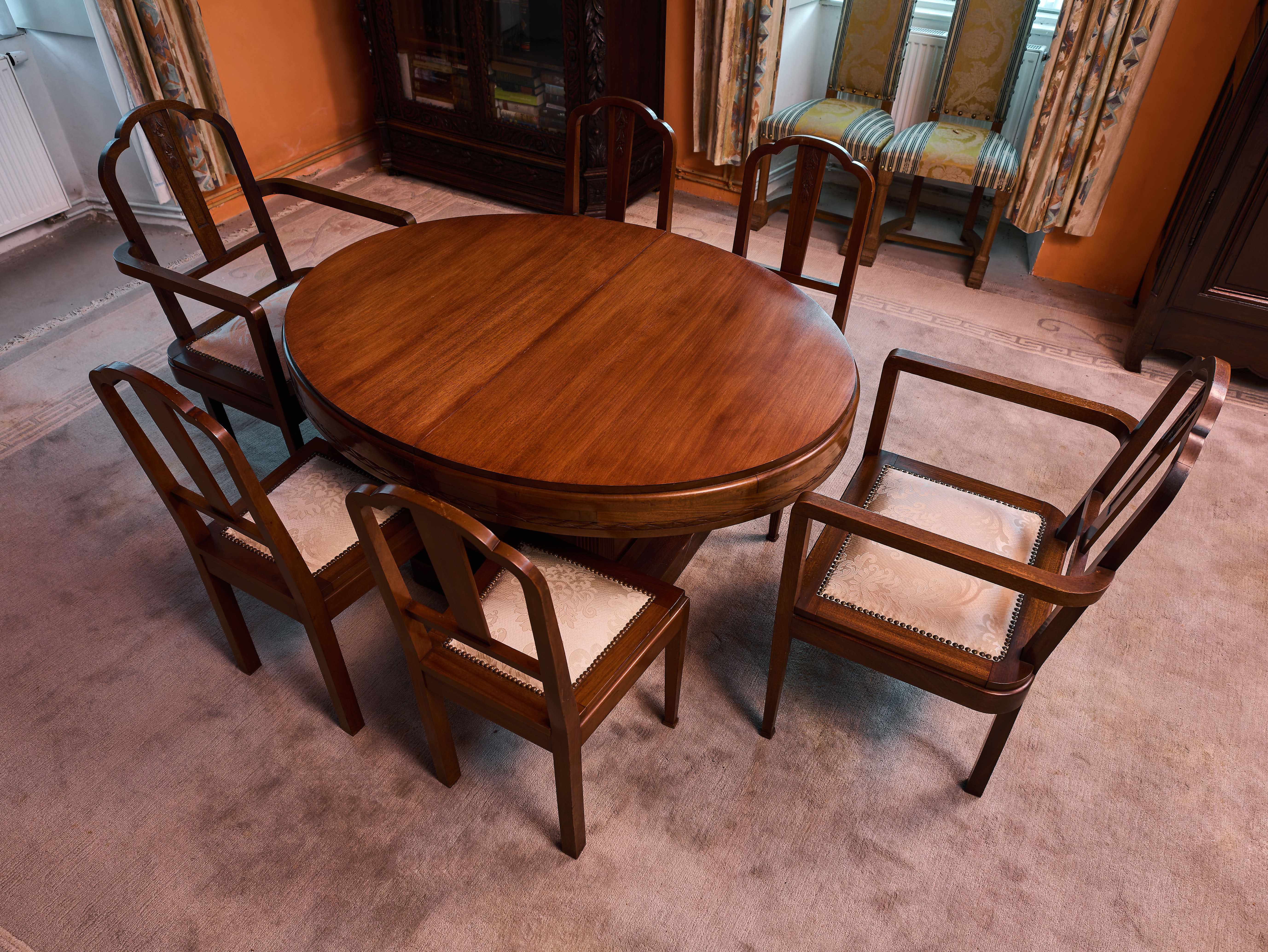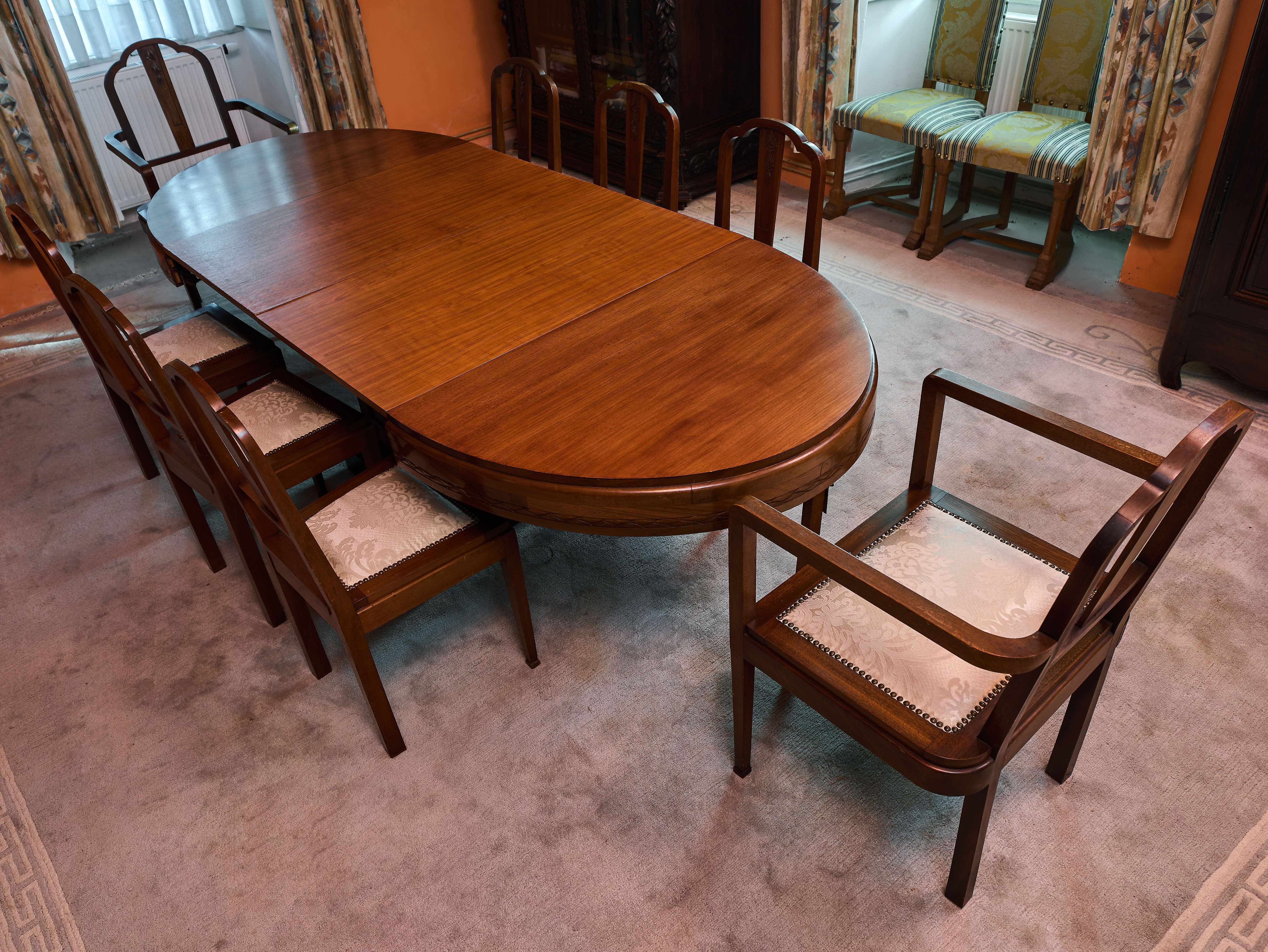 Reprezentativní jídelní souprava Art Deco, tvořená rozkládacím jídelním stolem, šesti jídelními židlemi a dvojicí křesel s područkami. Celek je zhotoven z masivního mahagonu s pečlivě vybranou kresbou dřeva a kvalitní povrchovou úpravou, odpovídající vysokým nárokům na nábytkovou produkci meziválečného období.