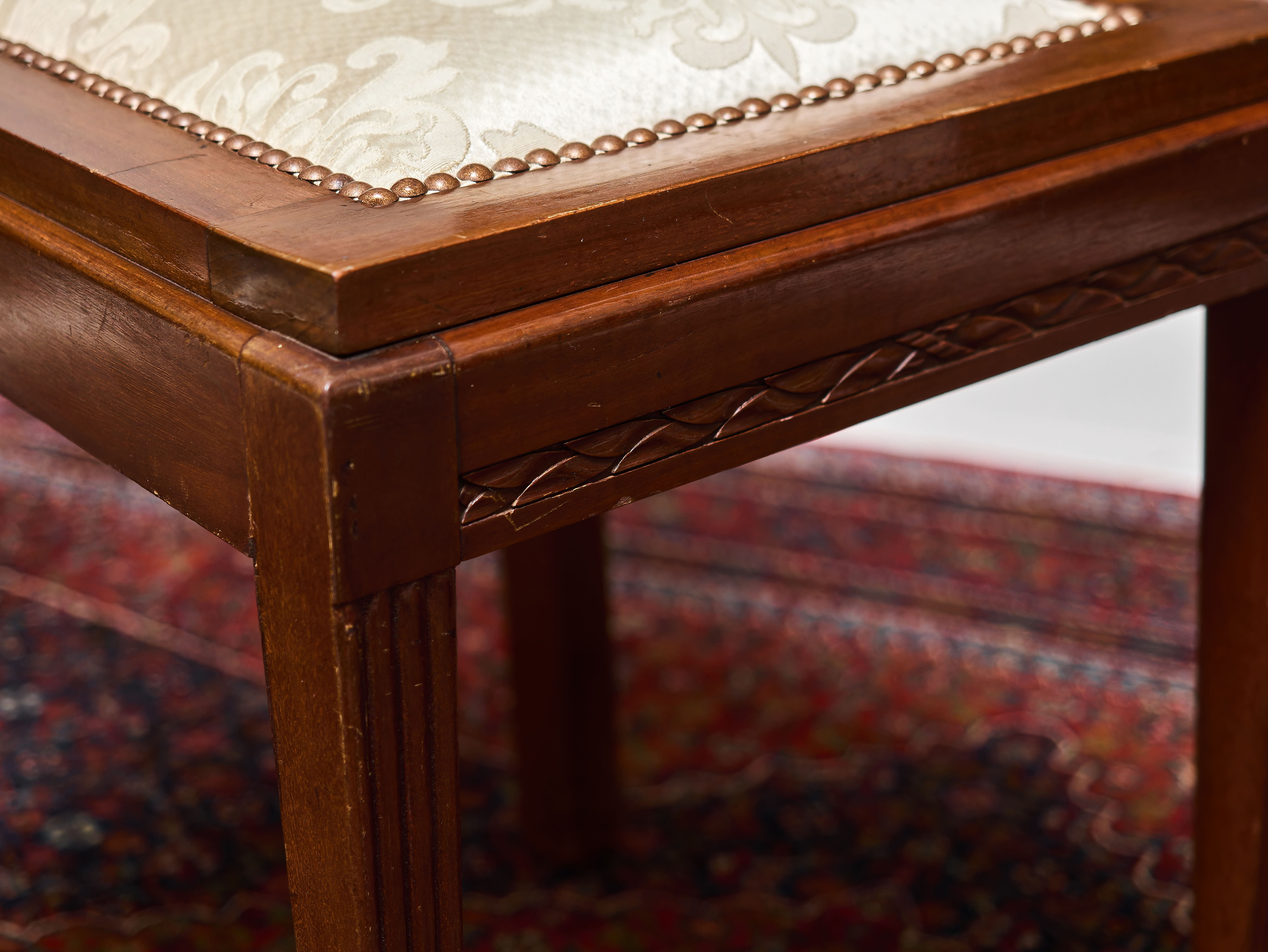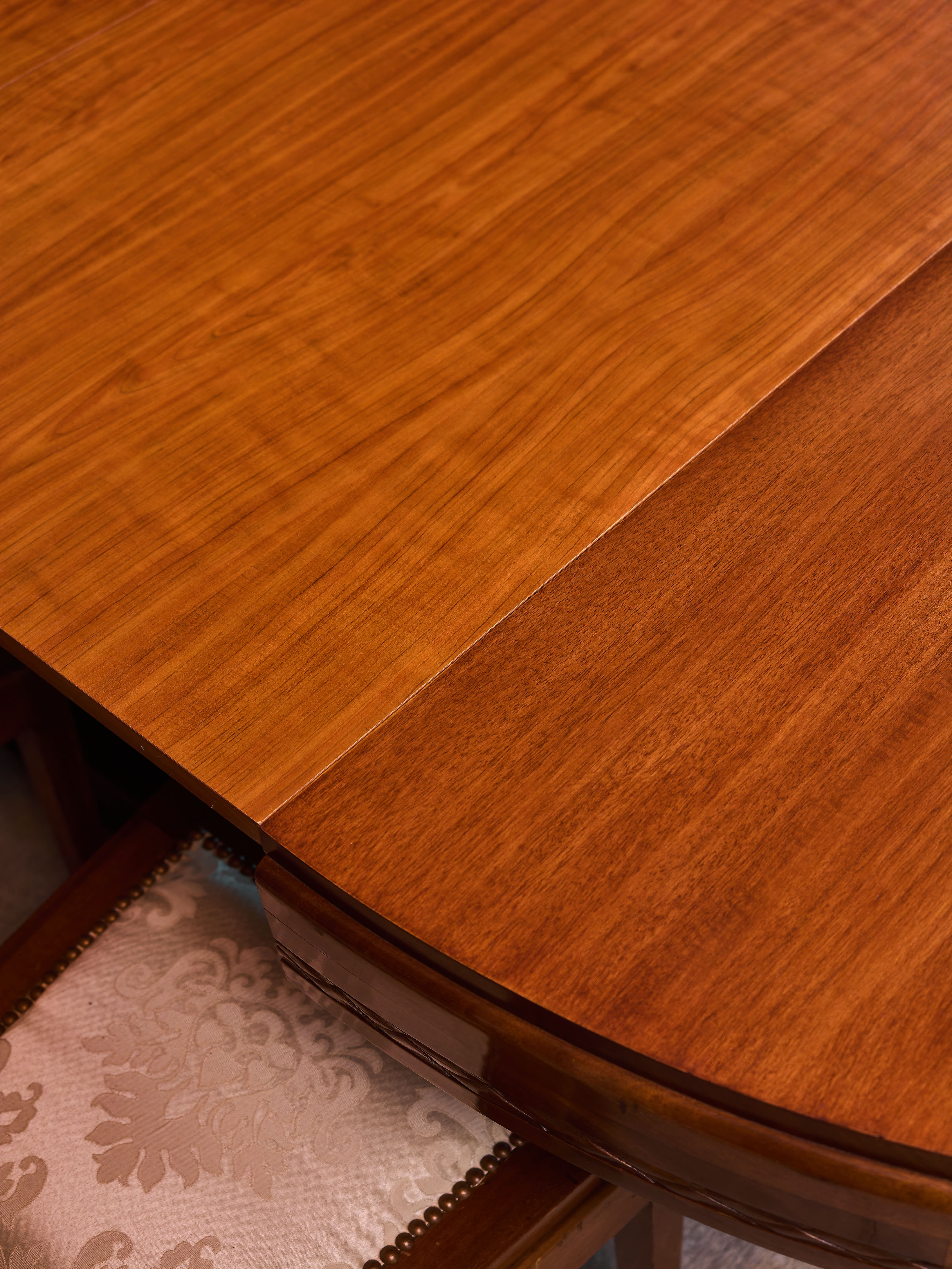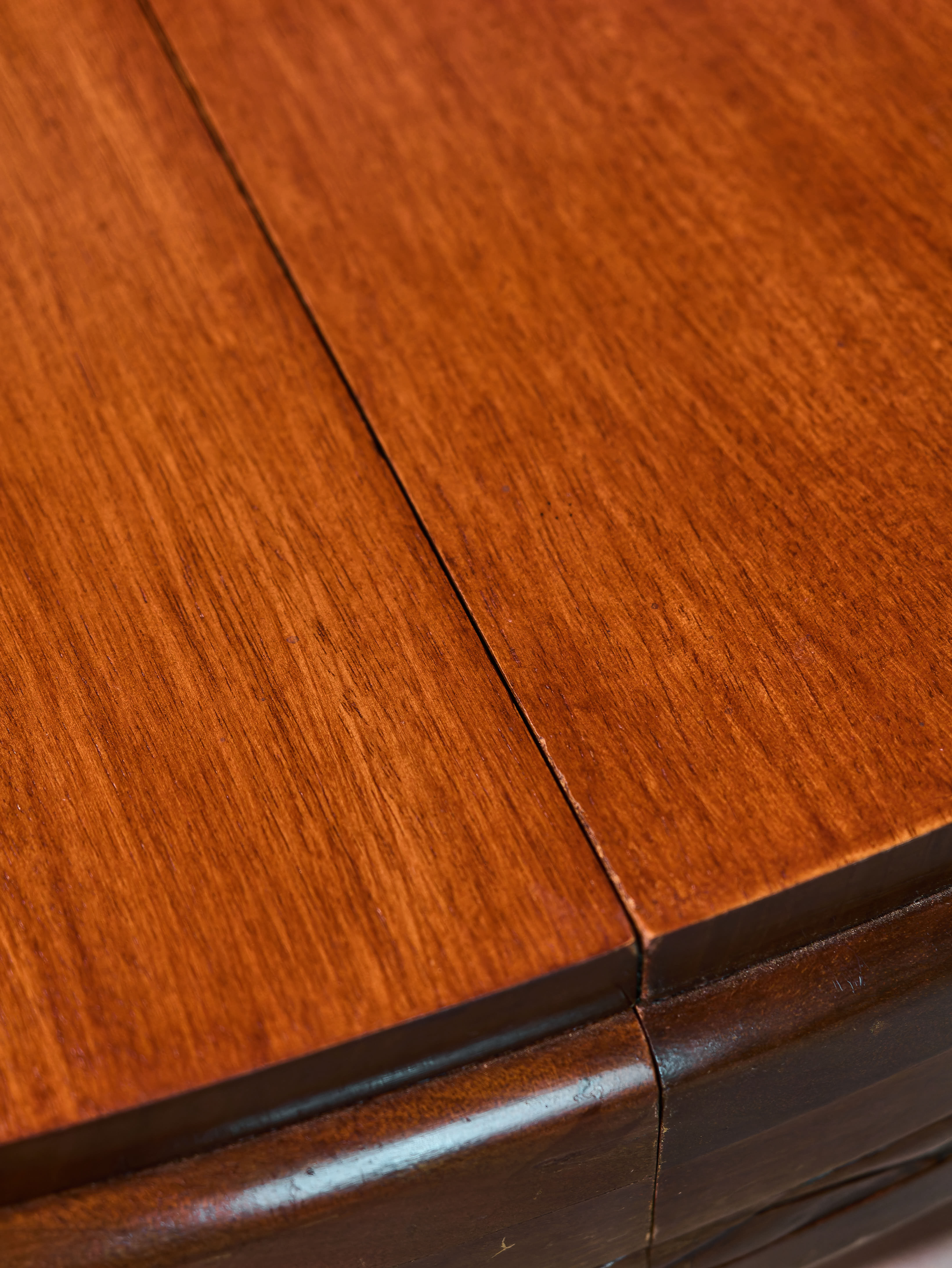 Reprezentativní jídelní souprava Art Deco, tvořená rozkládacím jídelním stolem, šesti jídelními židlemi a dvojicí křesel s područkami. Celek je zhotoven z masivního mahagonu s pečlivě vybranou kresbou dřeva a kvalitní povrchovou úpravou, odpovídající vysokým nárokům na nábytkovou produkci meziválečného období.