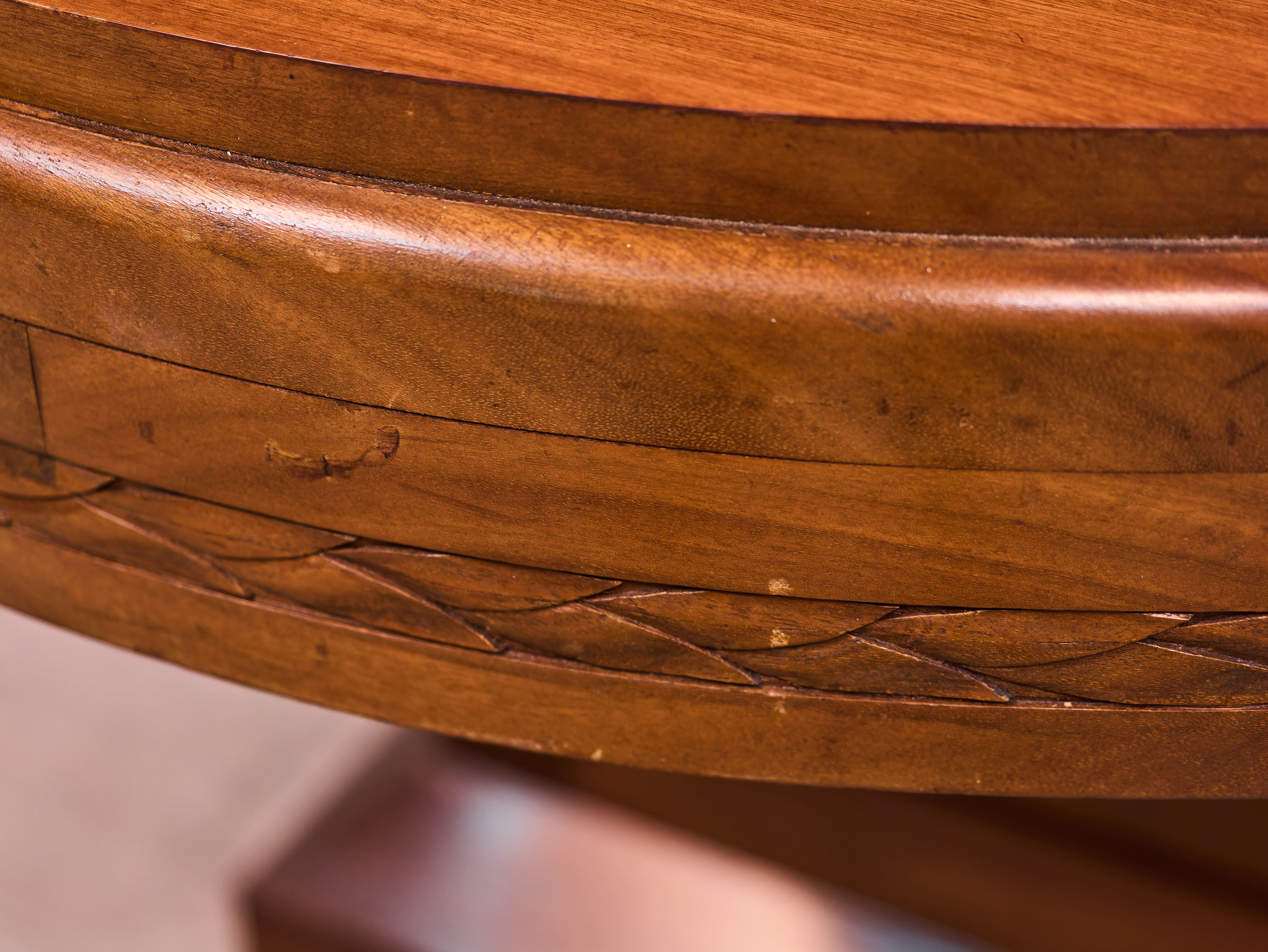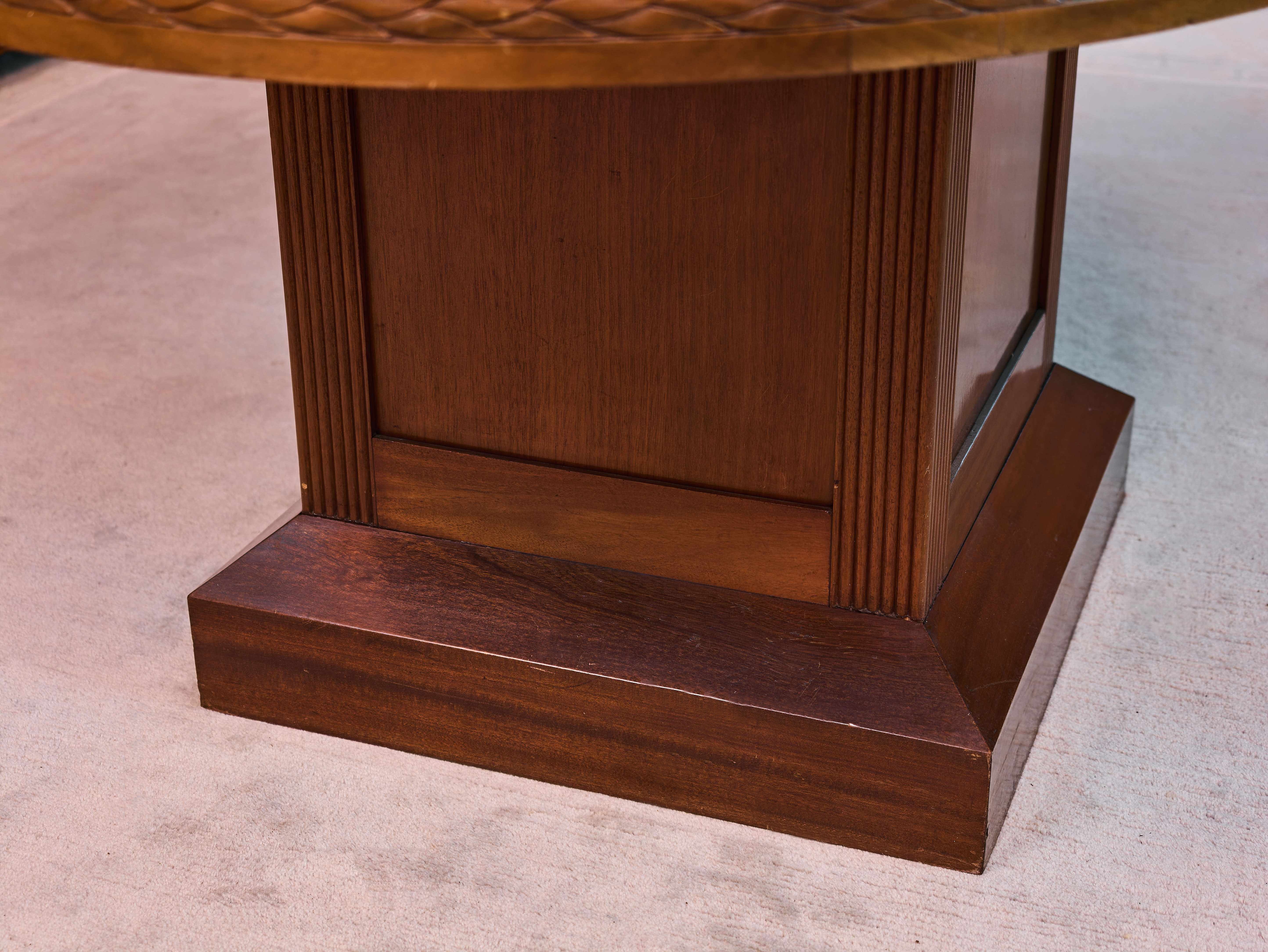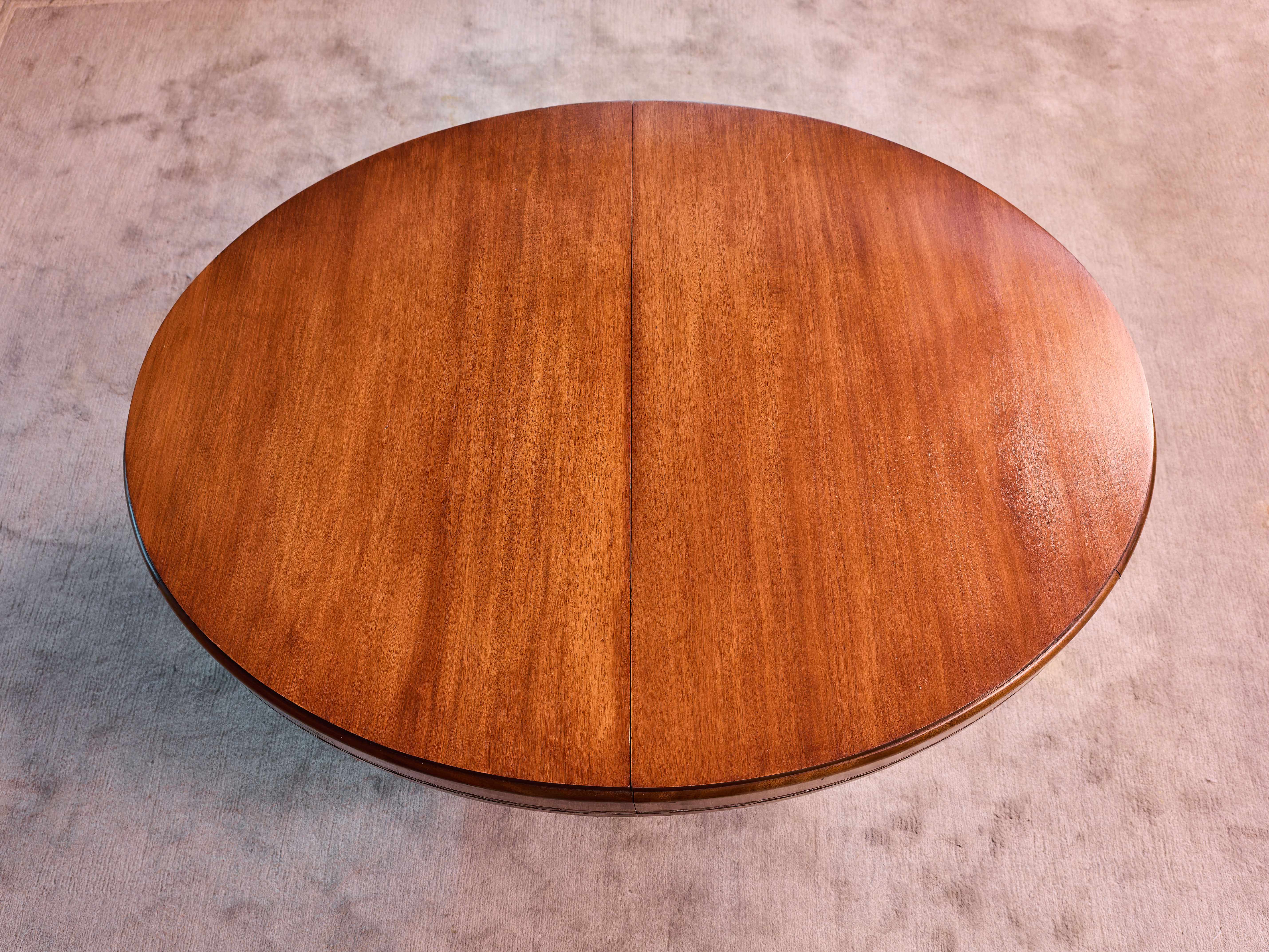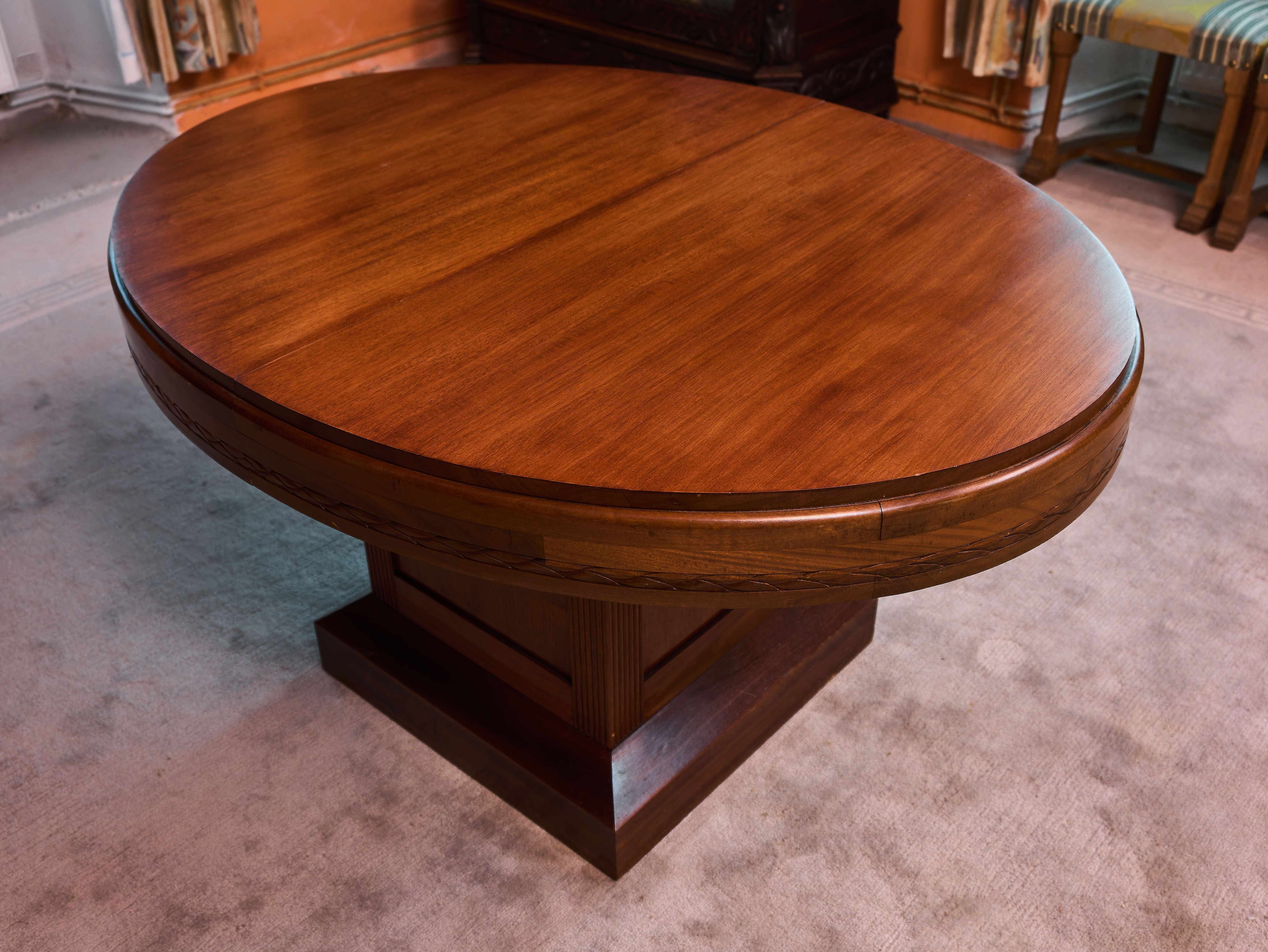 Rozkládací stůl má oválnou desku s jemně profilovaným okrajem a pásovým řezaným dekorem po obvodu lubu. Spočívá na masivní centrální podnoži s čtvercovým soklem, která zajišťuje výbornou stabilitu. Konstrukce je robustní, proporčně vyvážená a typická pro kvalitní Art Deco produkci konce první čtvrtiny 20. století. Rozkládací mechanismus je funkční a umožňuje výrazné zvětšení užitné plochy stolu až na 256,5cm.