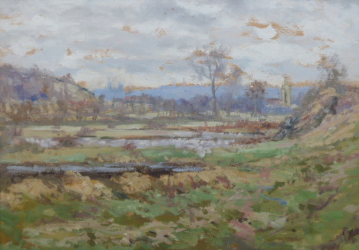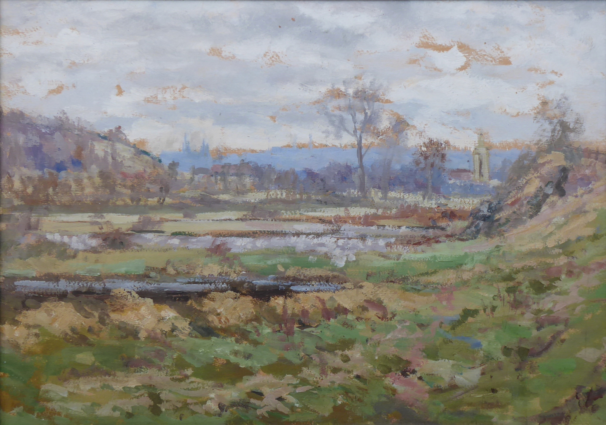 Olej na kartonu 29 cm x 42 cm. Vzadu originální štítek se jménem autora a názvem obrazu. A štítek rámařství, které obraz nově zarámovalo. Autor: Jindřich Stehlík (1905-1991). Motiv ticha uprostřed zeleně přírody za Prahou. Na horizontu věže připomínající blízkost rušného velkoměsta. Nově zarámováno v úzkém rámu s patinou měděné barevnosti. Československo 1950 – 1970. Celkový rozměr s rámem 33,5 cm x 46,5 cm.