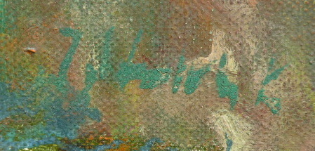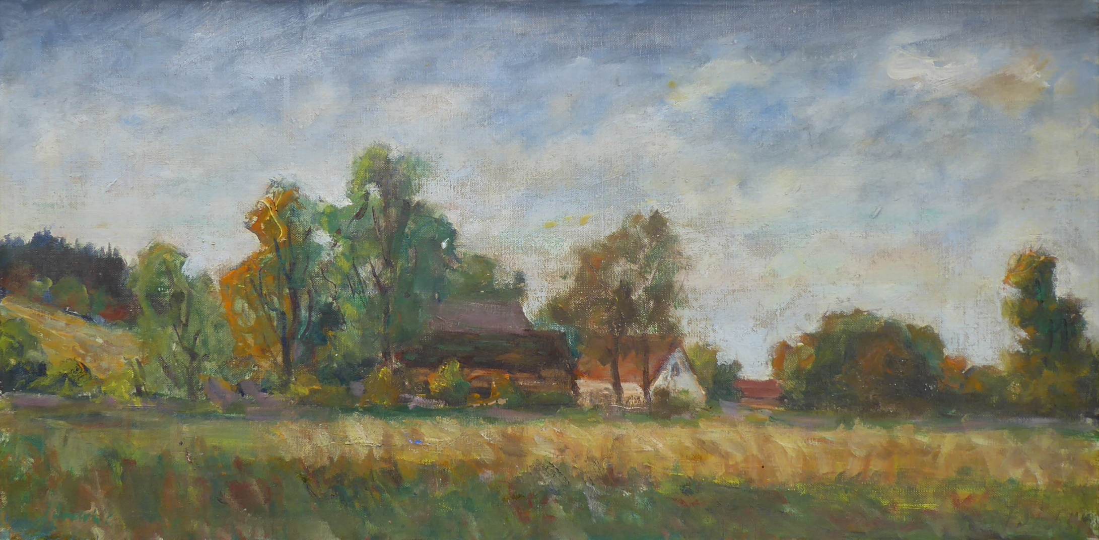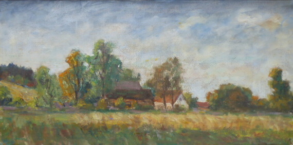 Olej na plátně 40 x 80 cm. Signováno vpravo i vlevo dole. Pohled přes louku na stavení se stromy a strání v levé části obrazu. Světlý dobový rám. Československo 1950 – 1970. Celkový rozměr s rámem 52 x 91 cm.