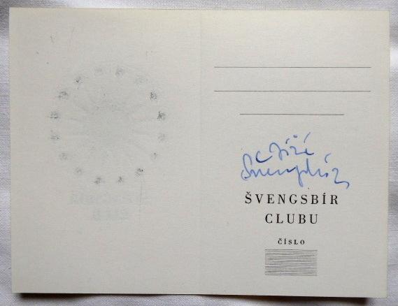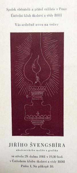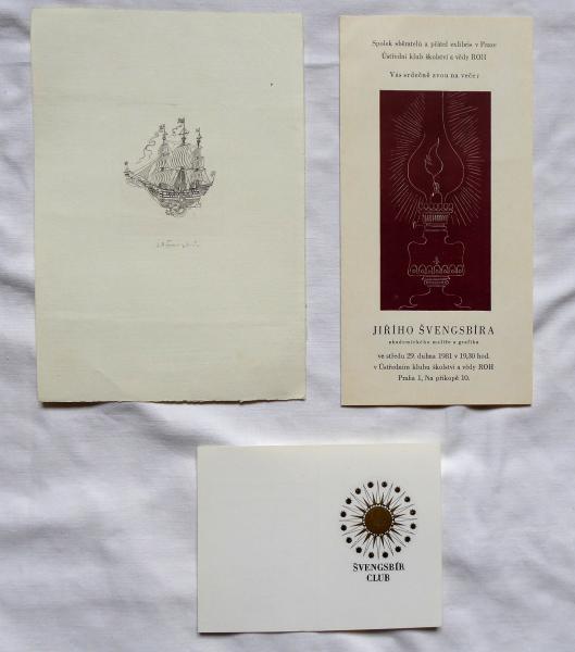 1. Galeona – ocelorytina na papíře 7,5 x 5,5 cm. Signováno tužkou uprostřed dole. Nerámováno. 2. Švengsbír Club – barevná ocelorytina na papíře 13 x 10 cm ( celkový rozměr listu ). Signováno inkoustovým perem. Nerámováno. 3. Pozvánka – Večer Jiřího Švengsbíra, Spolek sběratelů a přátel ex libris v Praze. Barevná ocelorytina na papíře 12 x 6 cm. Jiří Antonín Švengsbír ( 19. 4. 1921 Praha – 3. 3. 1983 Praha ) studium: rytec a medailér u firmy Bäcker na Smíchově, Vysoká škola uměleckoprůmyslová škola v Praze prof. Antonín Strnadel. člen: Sdružení českých umělců grafiků Hollar, Umělecká Beseda, Svaz československých výtvarných umělců, Skupina Grafis.