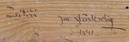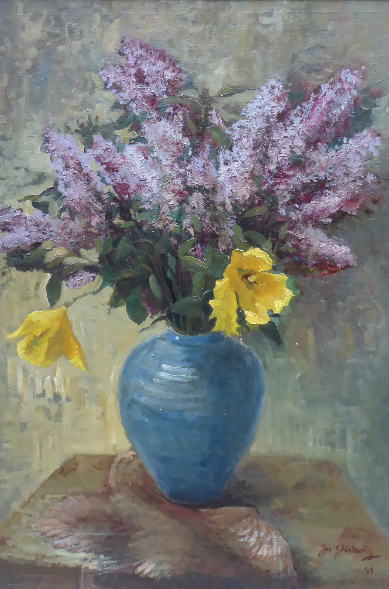 Olej na plátně 91 cm x 61 cm. Signováno vpravo dole s datací 1941. Autor: Josef Glückselig (1908-1986). Velké zátiší s fialovými šeříky v modré váze doplněnými o dva jasně žluté květy se střapatými okvětními lístky, jež malbu prozáří. V rámu s lehce zlatavou patinou dekorovaném ručně řezanými florálními motivy a stylizovanou volutou. Čechy, rok 1941. Celkový rozměr s rámem 110 cm x 80 cm.