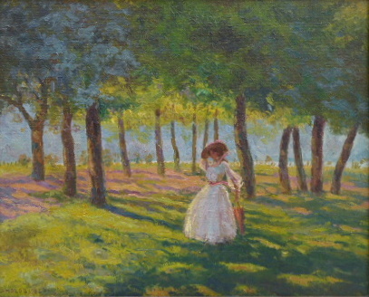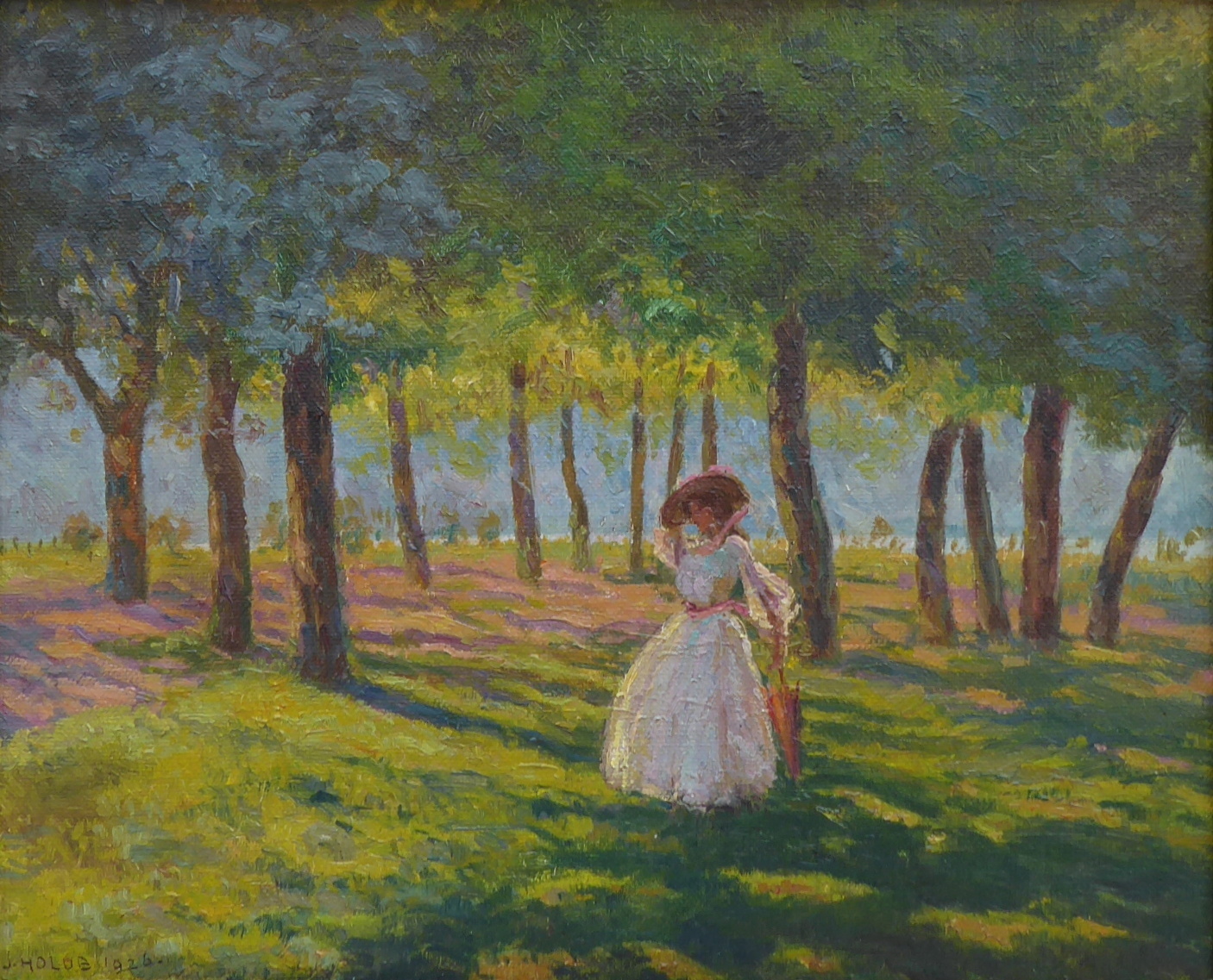 Olej na plátně fixovaném na kartonu 25,5 cm x 31,5 cm. Signováno vlevo dole s datací 1926. Autor obrazu: Josef Holub (1870-1957). Impresionistická nálada jednoho slunečného dne s dívkou v bílých šatech, v klobouku s širokou krempou a stuhou, držící v levé ruce slunečník při procházce parkem pod stínem stromoví. Ve zlaceném profilovaném rámu. Československo, rok 1926. Celkový rozměr s rámem 35 cm x 40 cm.