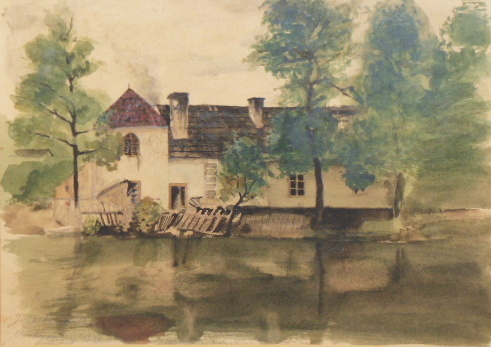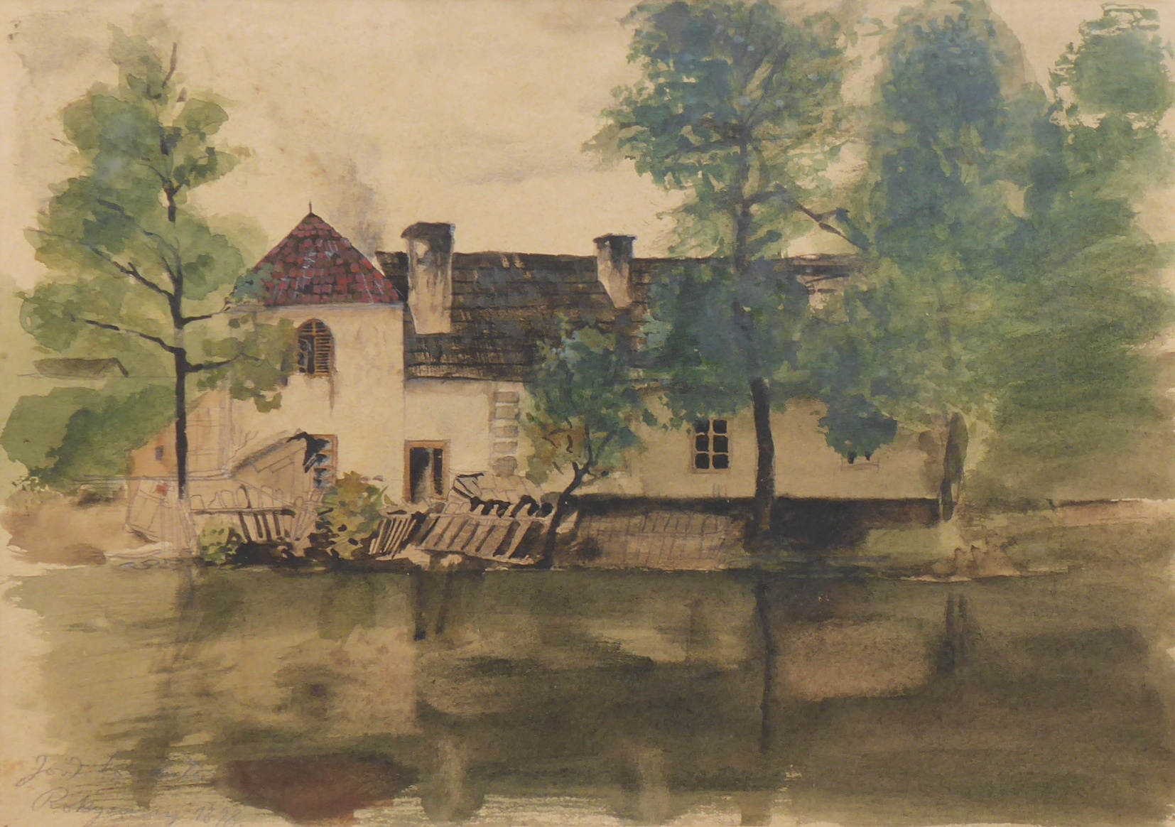 Akvarel, tuš a tužka na papíru 17,5 cm x 25 cm. Signováno vlevo dole s určením místa Rokycany s datací 1898. Autor: Josef Jindřich Loukota (1889-1963). Zajímavá ukázka z nejranějšího období malíře, z doby jeho dětských let. Idylický pohled na zajímavou usedlost na břehu řeky. Rám s paspartou a sklem. Z umělcovy rodinné pozůstalosti. Čechy, rok 1898. Celkový rozměr s rámem 38 cm x 45 cm.