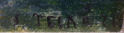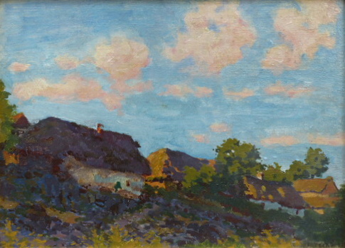 Olej na kartonu 25 cm x 34 cm. Signováno vpravo dole s datací 1921. Autor: Josef Tesař (1898-1953). Impresionistická olejomalba malých stavení rozložených ve stráni za polojasného letního dne. V širokém reliéfním zlatém rámu. Československo, rok 1921. Celkový rozměr 41 cm x 50 cm.