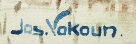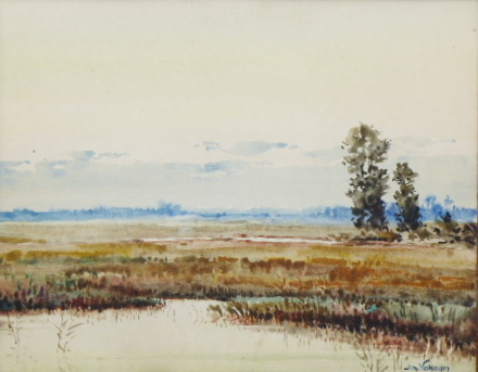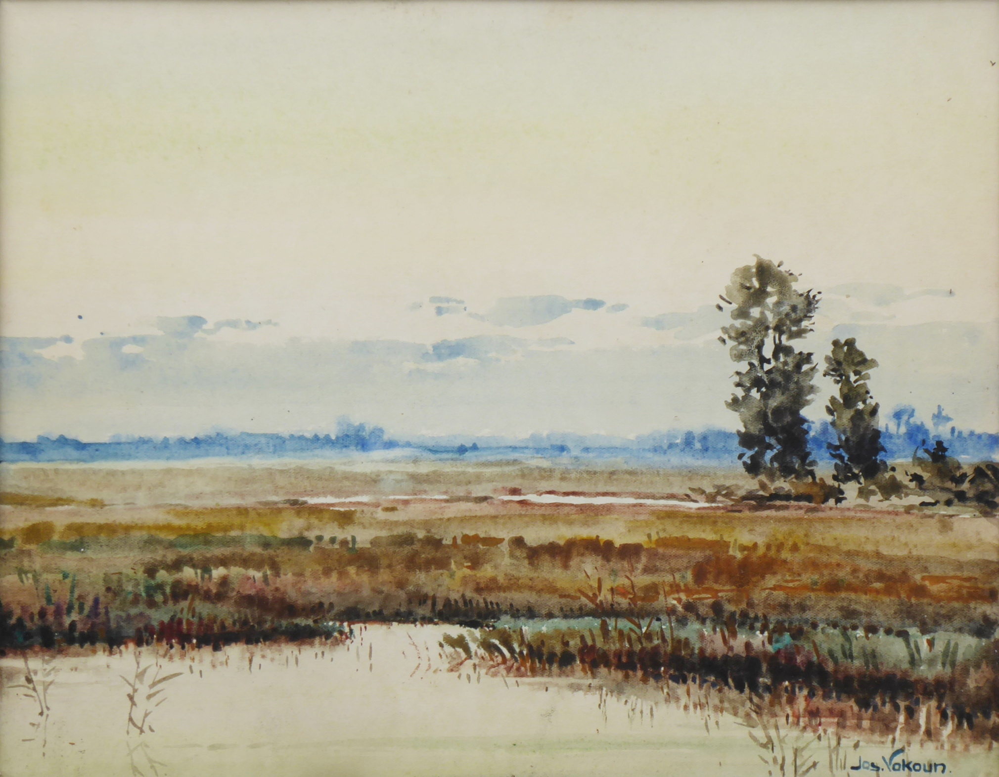 Akvarel na papíru 24 cm x 30,5 cm. Signováno vpravo dole. Autor: Ing. Arch. Josef Vokoun (1893-1972). Melancholická krajina v Polabí. Originální rám s tmavou patinou a sklem. Československo 1930 – 1950. Celkový rozměr s rámem 33 cm x 39,5 cm.