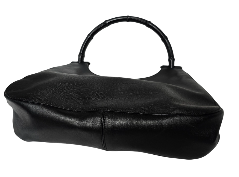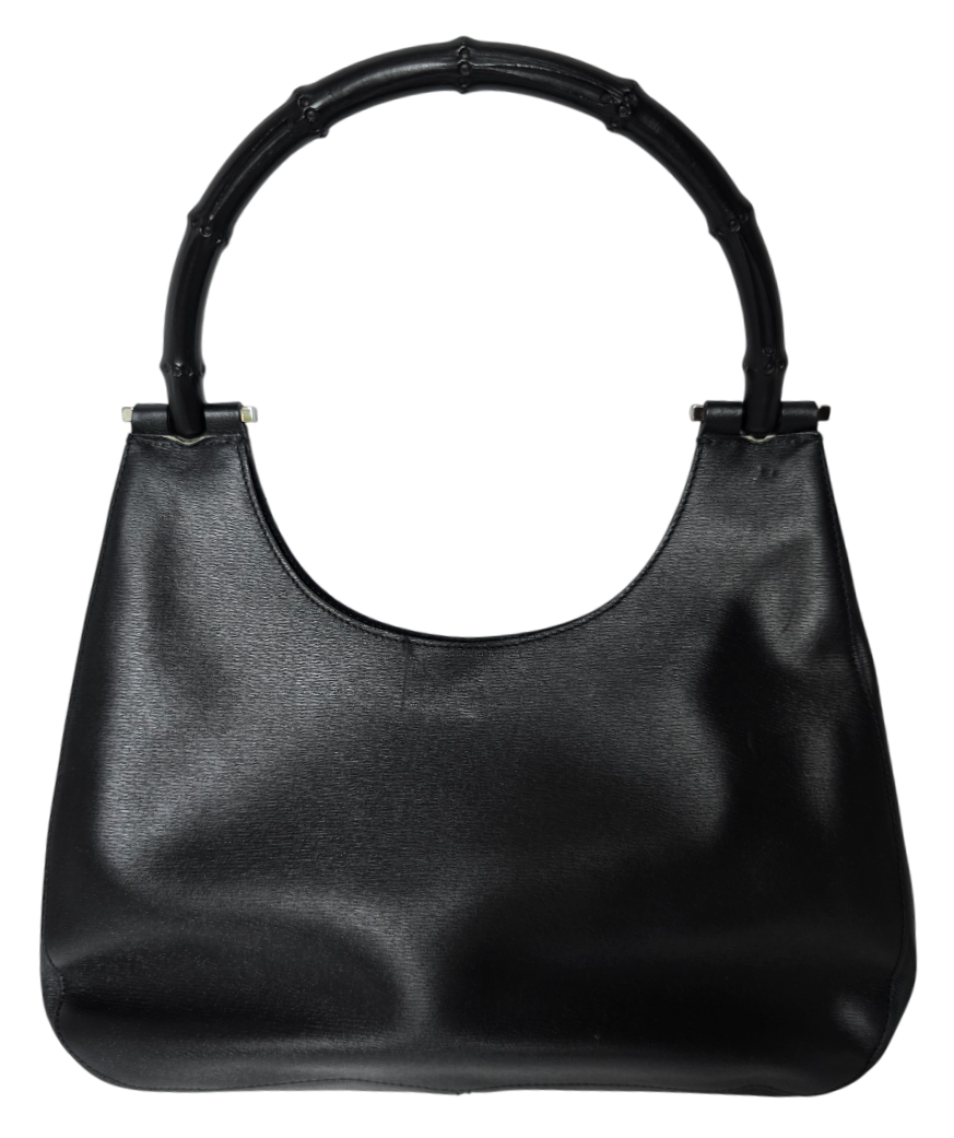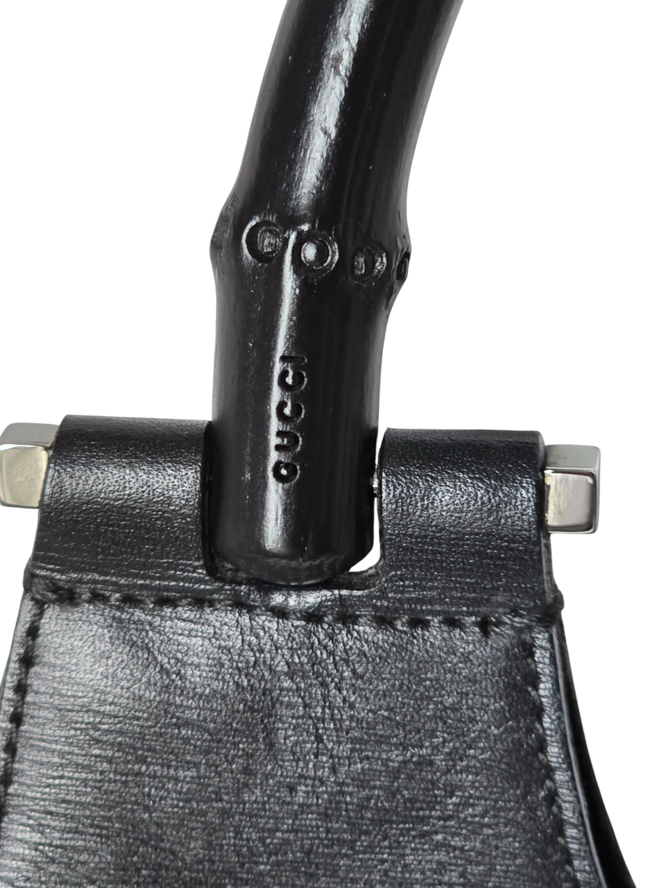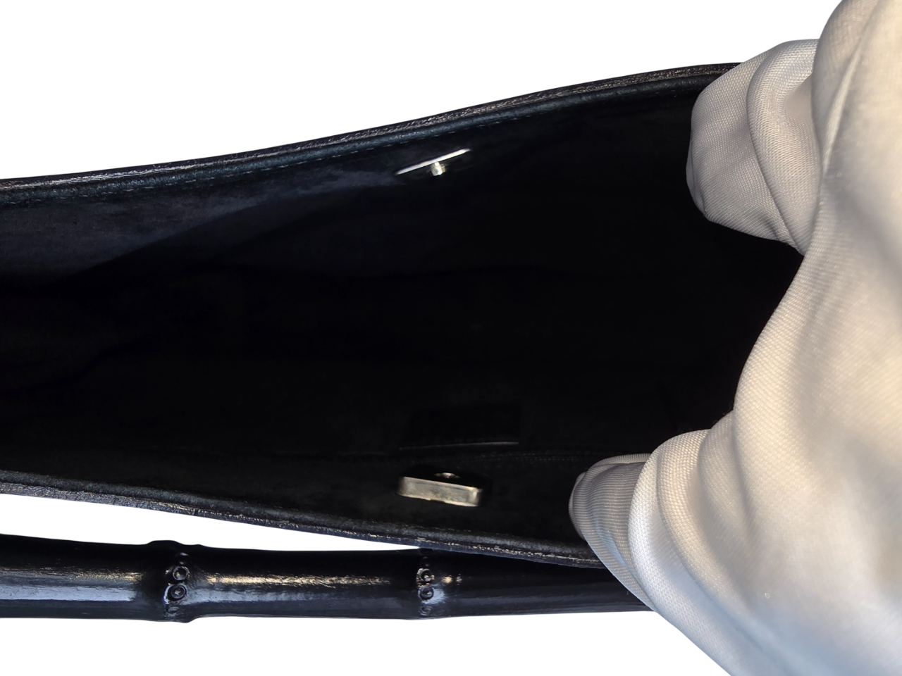 Popis: Luxusní kabelka značky Gucci z kolekce Toma Forda zvané \“Bamboo Handle\“, který proměnil image značky Gucci na sexy moderní styl. Kabelka má ikonický tvar, kterému dodává luxusní vzhled rukojeť z černého bambusu, a kovové doplňky stříbrné barvy. Na eleganci a luxusu dodávají drobné prvky, jako je vyražená značka do kůže na přední straně a označení Gucci na bambusové rukojeti. Zapínání stříbrné barvy je na magnet – plně funkční. Podšívka z drsněné kůže. Obsahuje jednu menší vnitřní kapsu na zip. Na kapse je originální kožený štítek Gucci, na jehož spodní straně je vyraženo sériové číslo výrobce. Nošení v ruce / přes ruku / na rameni. V původním originálním Gucci protiprachovém obalu.