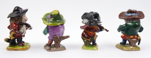 Bílý, barevně ručně malovaný a mírně zlacený porcelán. Porcelánka Rudolstadt. Čtveřice porcelánových ručně barevně malovaných potulných malých muzikantů v originálně zdobených kloboucích hrajících na strunné nástroje a píšťalku. Na nízkých čtvercových reliéfně členěných podstavcích evokujících palouk i kamenitou cestu. Značeno zespodu: značka výrobce. Německo, Rudolstadt, minulé století. Výšky jednotlivých hudebníků: 9,5 cm, 9 cm, 8 cm a 8 cm.