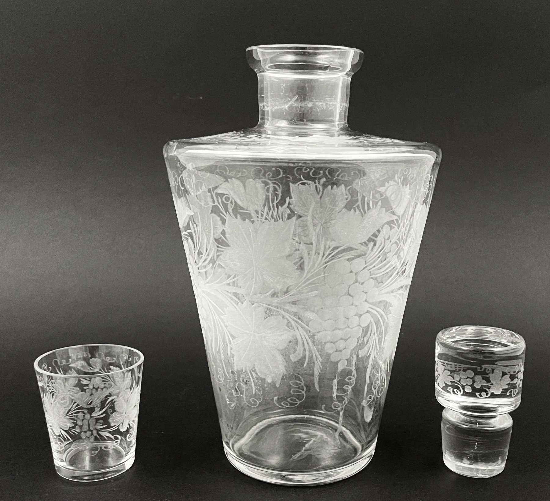 Čiré ručně broušené sklo. Vyšší karafa z čirého skla s jednou malou skleničkou. Dekorováno ručně broušenými stylizovanými ornamenty vinné révy s hrozny, listy a úponky. Československo, polovina minulého století. Výška karafy 24 cm, výška skleničky 6 cm.