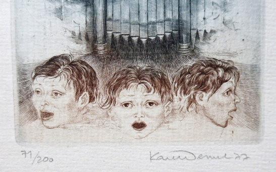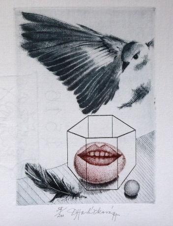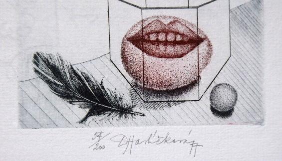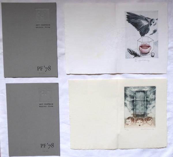 1. Daniela Havlíčková – Ptáček a Rty: barevný lept ( kombinovaná technika ) na ručním papíře ( Velké Losiny ) 13,5 x 9,8 cm. Signováno tužkou uprostřed dole, datováno 77, číslo listu 54 / 200. Nerámováno.