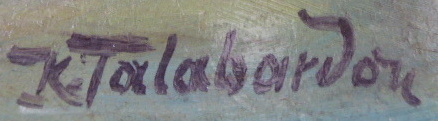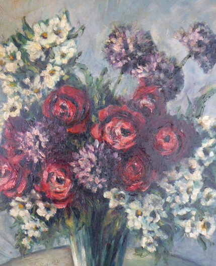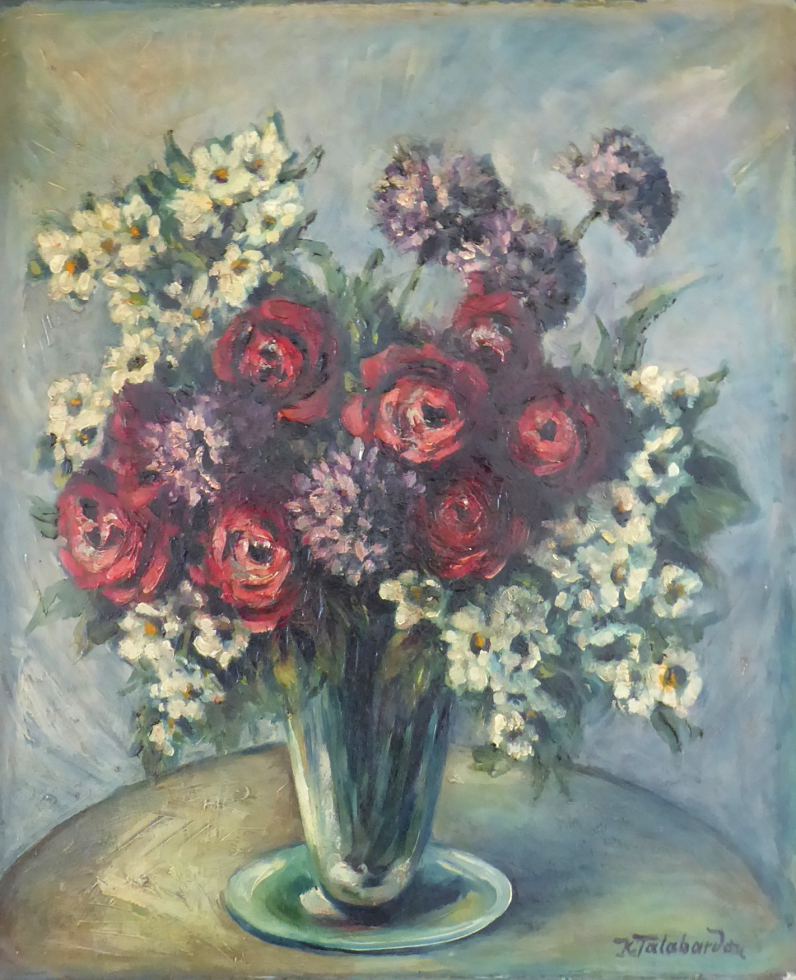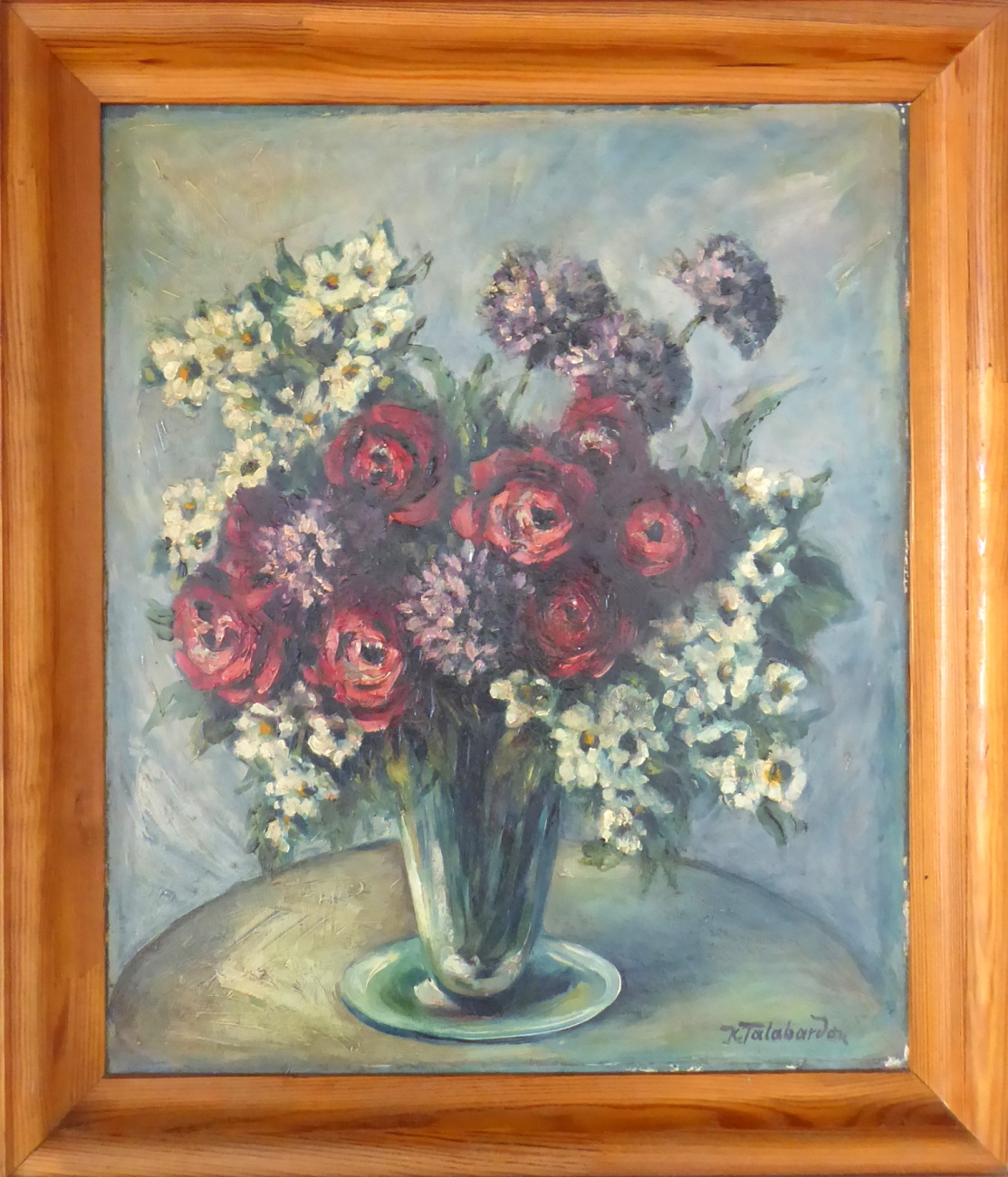 Olej na sololitu 51 x 42,5 cm. Signováno vpravo dole. Pátá manželka význačného českého malíře Václava Hejny Karla Jelínková, rozená Korejsová, tvořící pod pseudonymem Charlotte či Karla Talabardon. Ústřední námět květů růží a lučních květin ve skleněné váze stojící na kulatém stolku. Jednoduchý světlý dřevěný rám. Československo 1950 -1960. Celkový rozměr s rámem 59 x 50 cm.