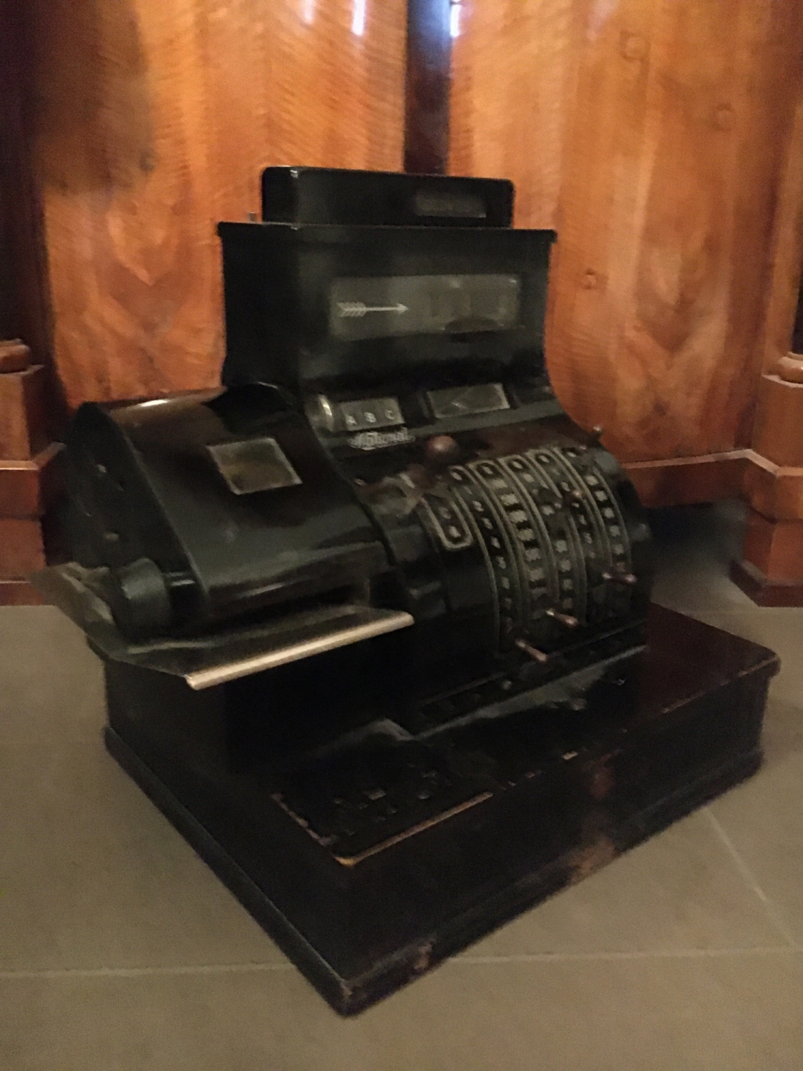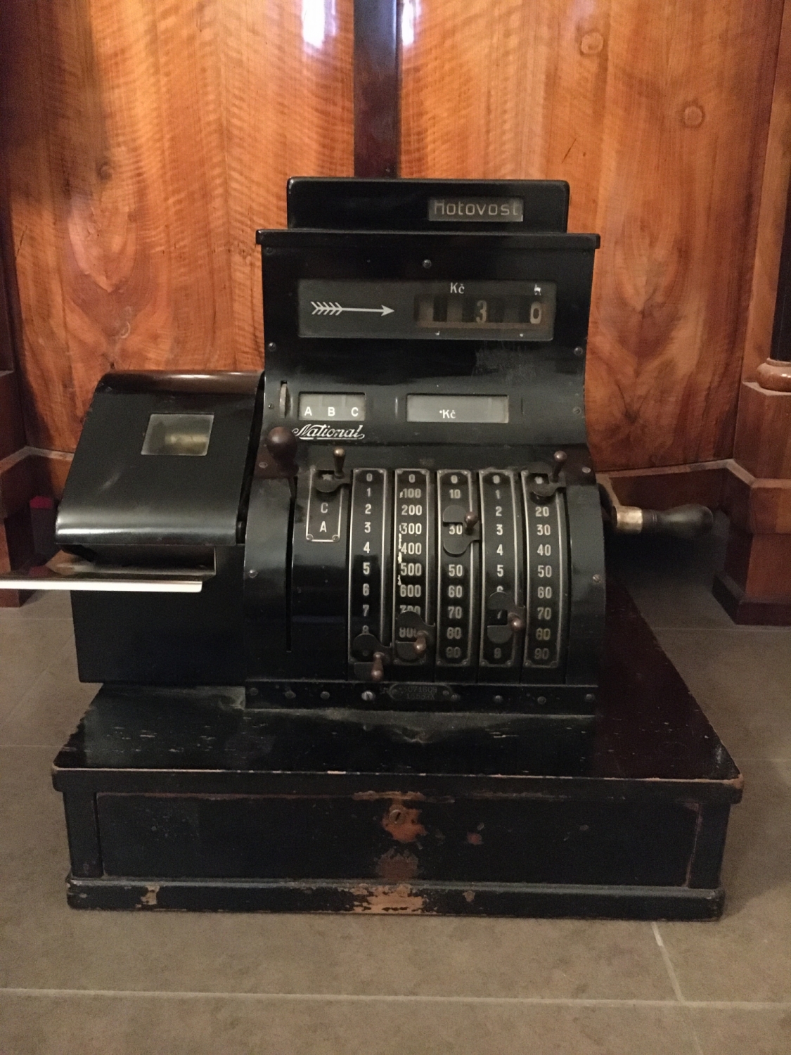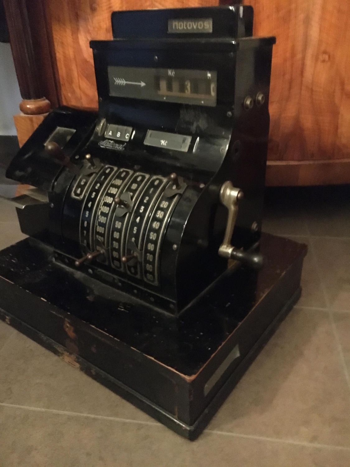Stará kasa z první republiky v elegantním černém provedení v kombinaci s niklovanými částmi. Kasa je funkční, počítá a otvírá schránku