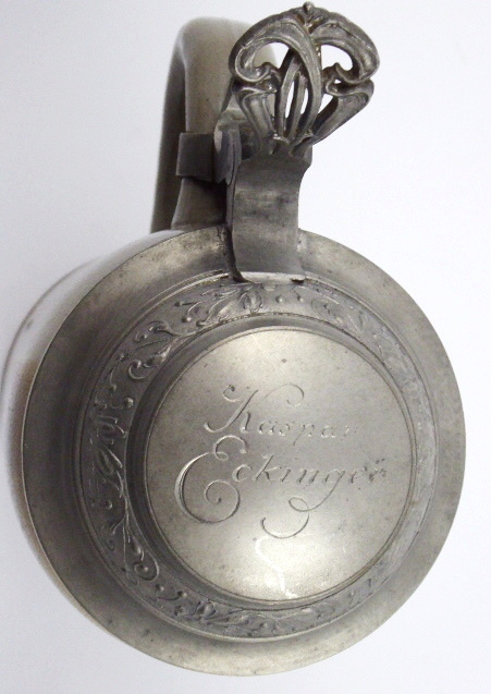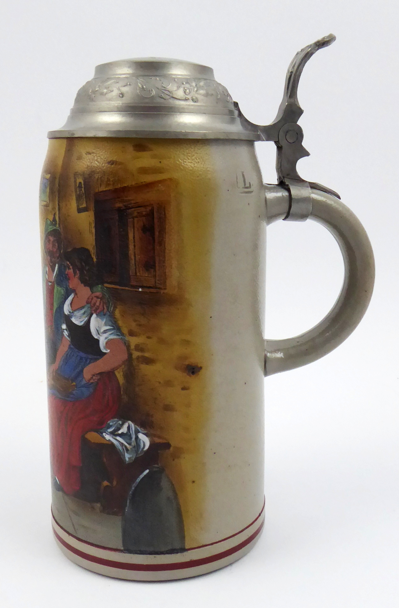 Tvrdá kamenina se solnou glazurou, ruční malba, cín. Originální pivní korbel s ruční malbou zachycující muzikanty v dobovém oděvu. Secesní cínové víko se jménem majitele tohoto korbelu Kaspar Eckinger. Ve výborném stavu. Německo 1900 – 1930. Výška 23 cm.