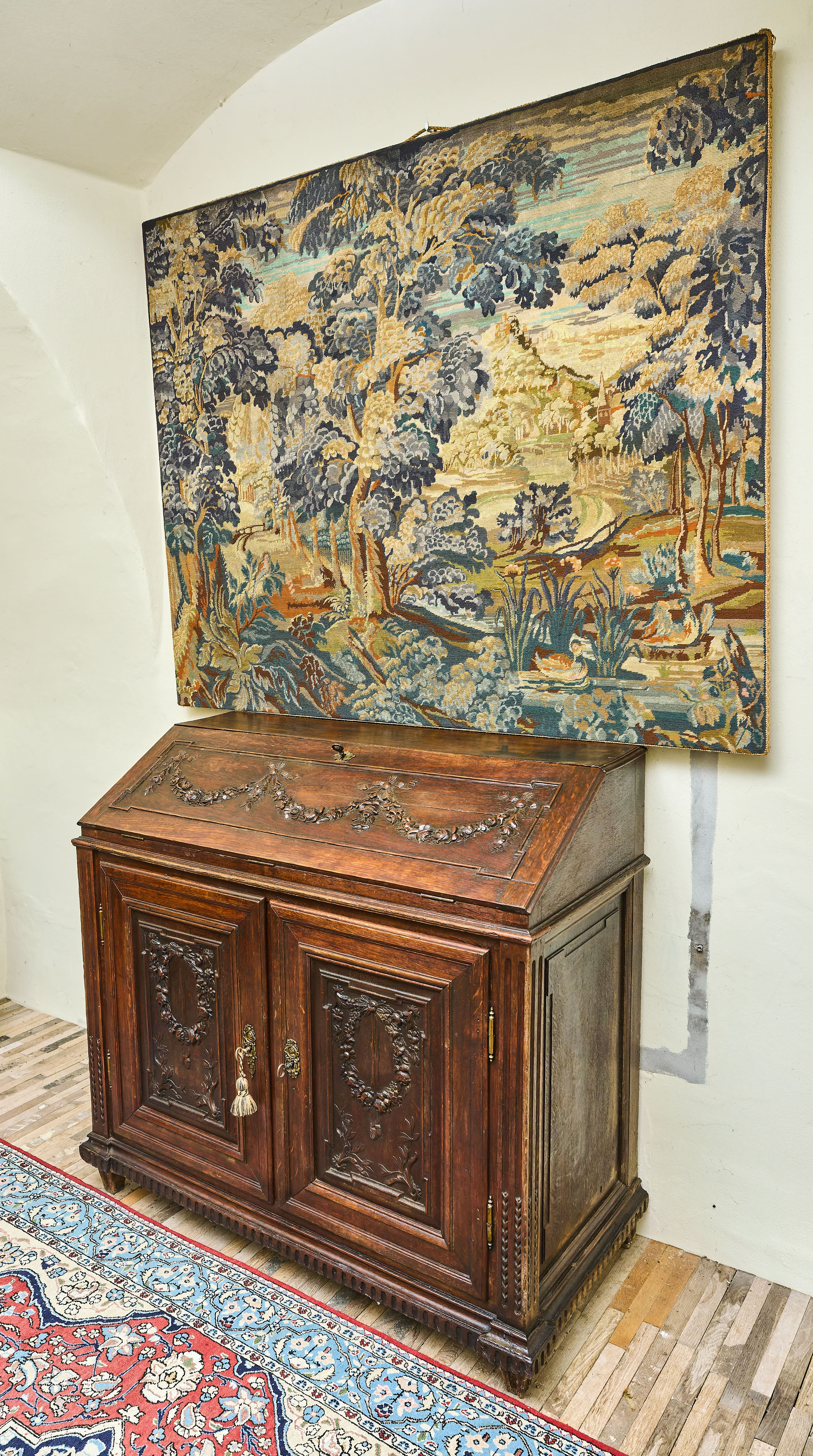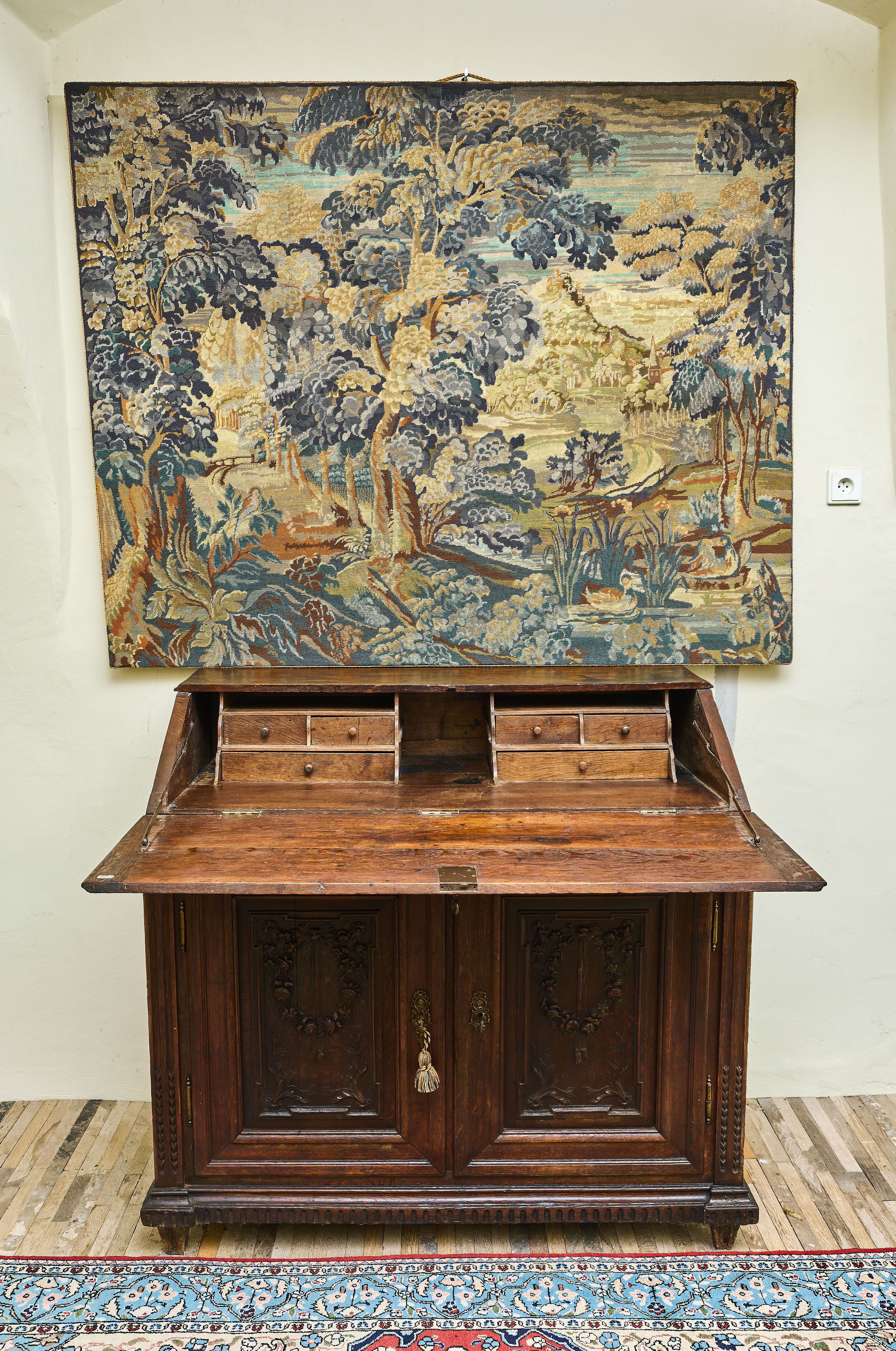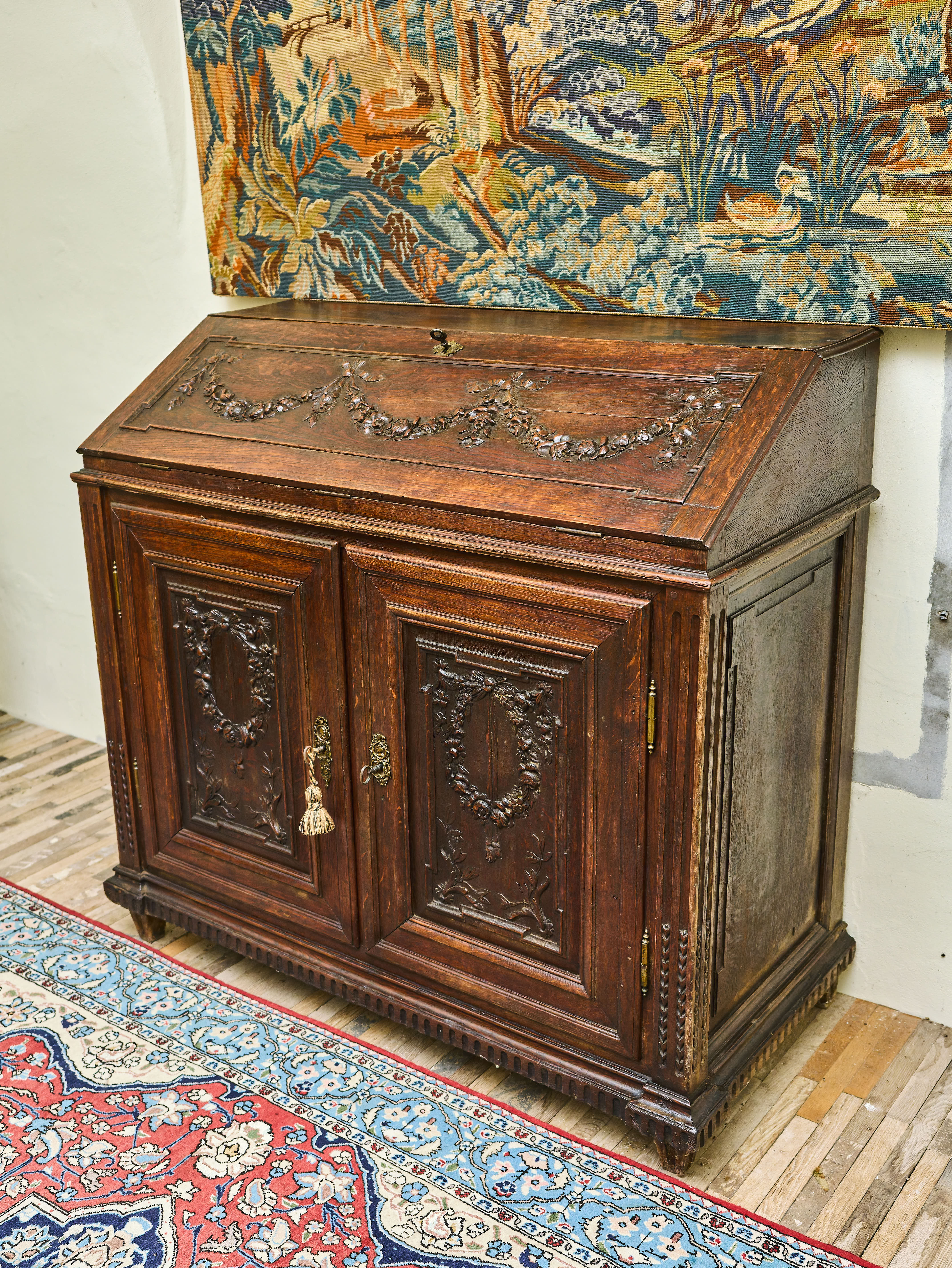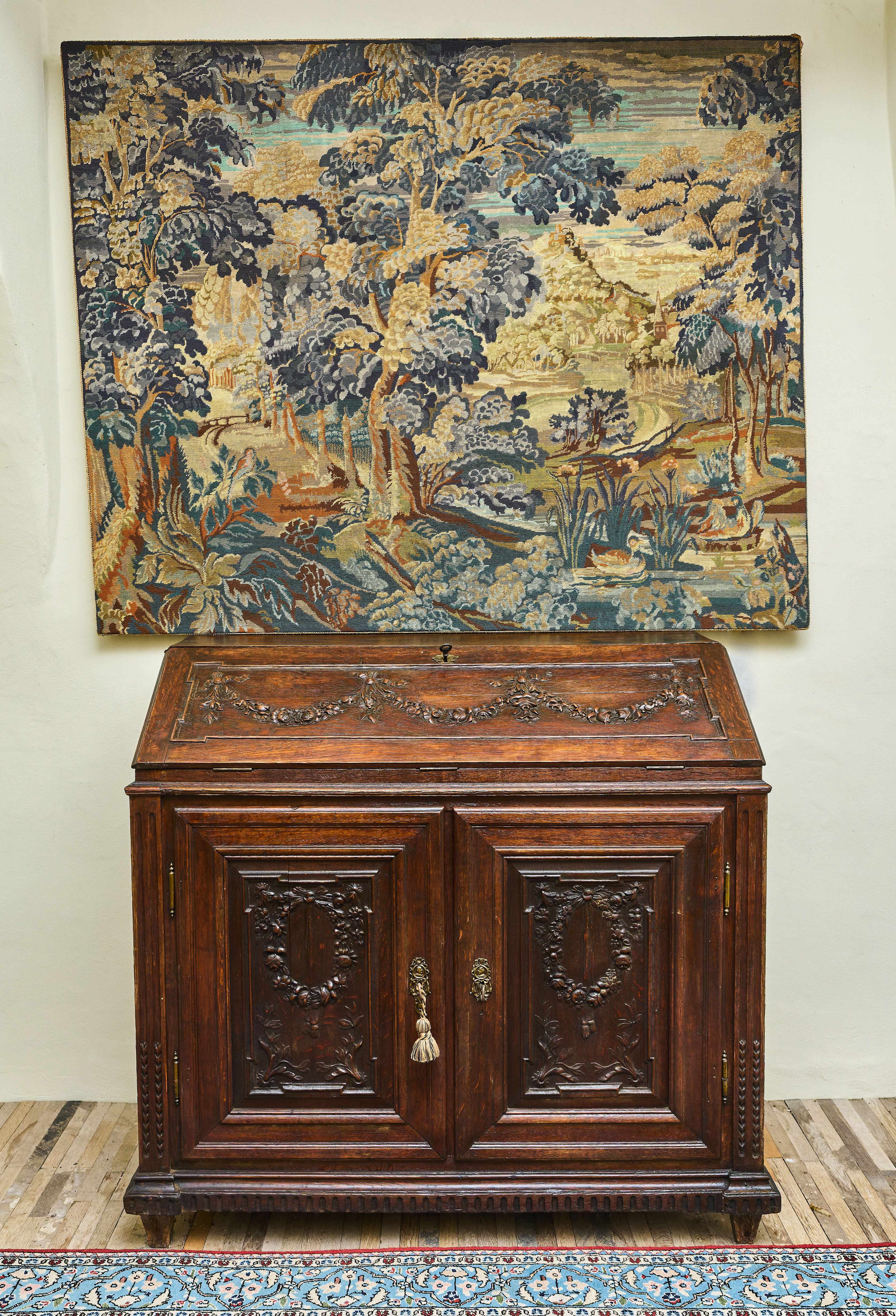 Elegantní klasicistní komoda se sekretářem z druhé poloviny 18. století, vyrobená z masivního dubového dřeva. Horní výklopná deska odkrývá původní pracovní plochu se soustavou drobných zásuvek a přihrádek, typických pro tehdejší psací nábytek. Bohatá řezbářská výzdoba s motivy vavřínových věnců, rostlinných ornamentů a plastických girland doplněná původním mosazným kováním s profilovými hlavami dodává kusu jedinečný charakter.