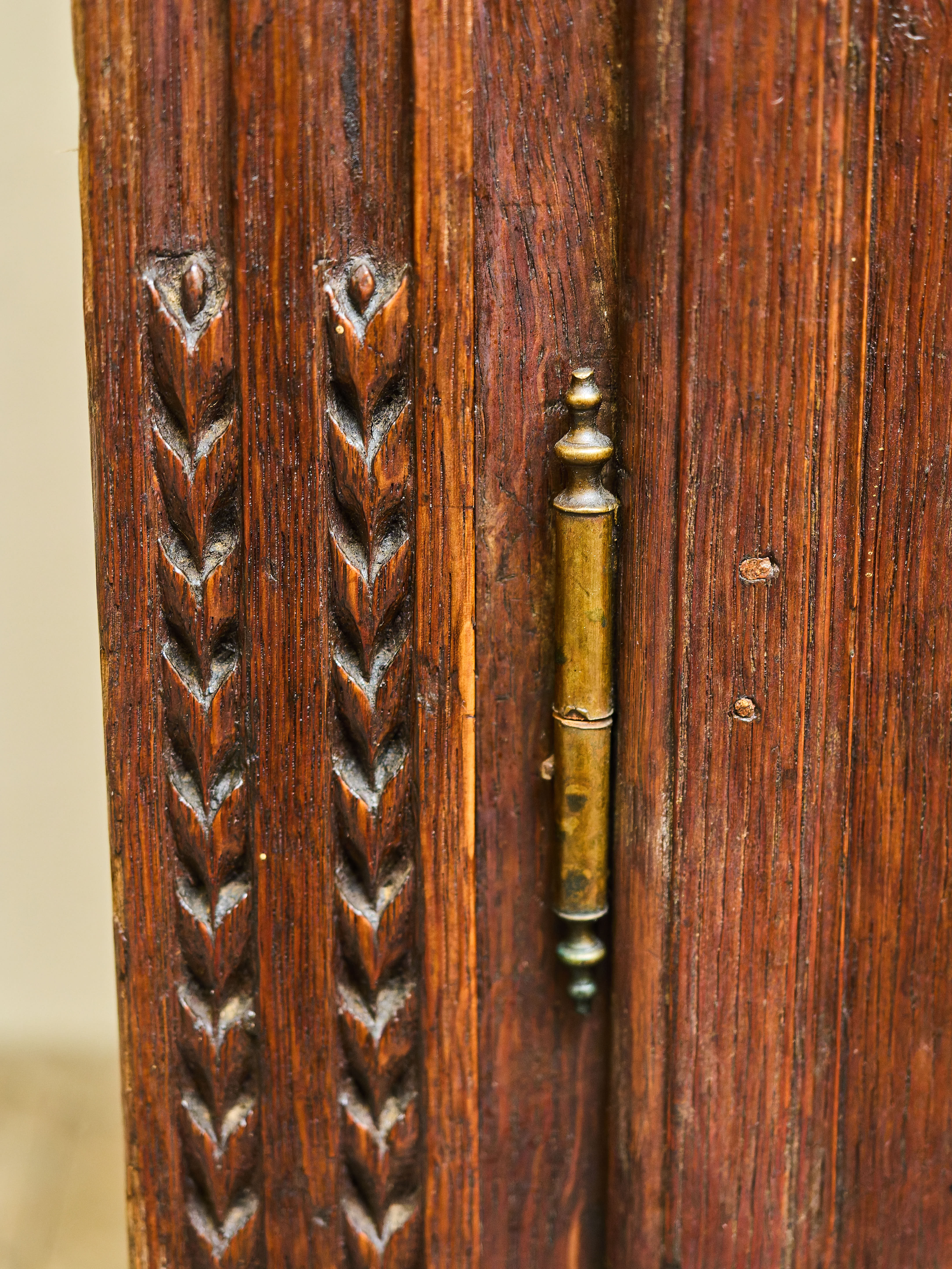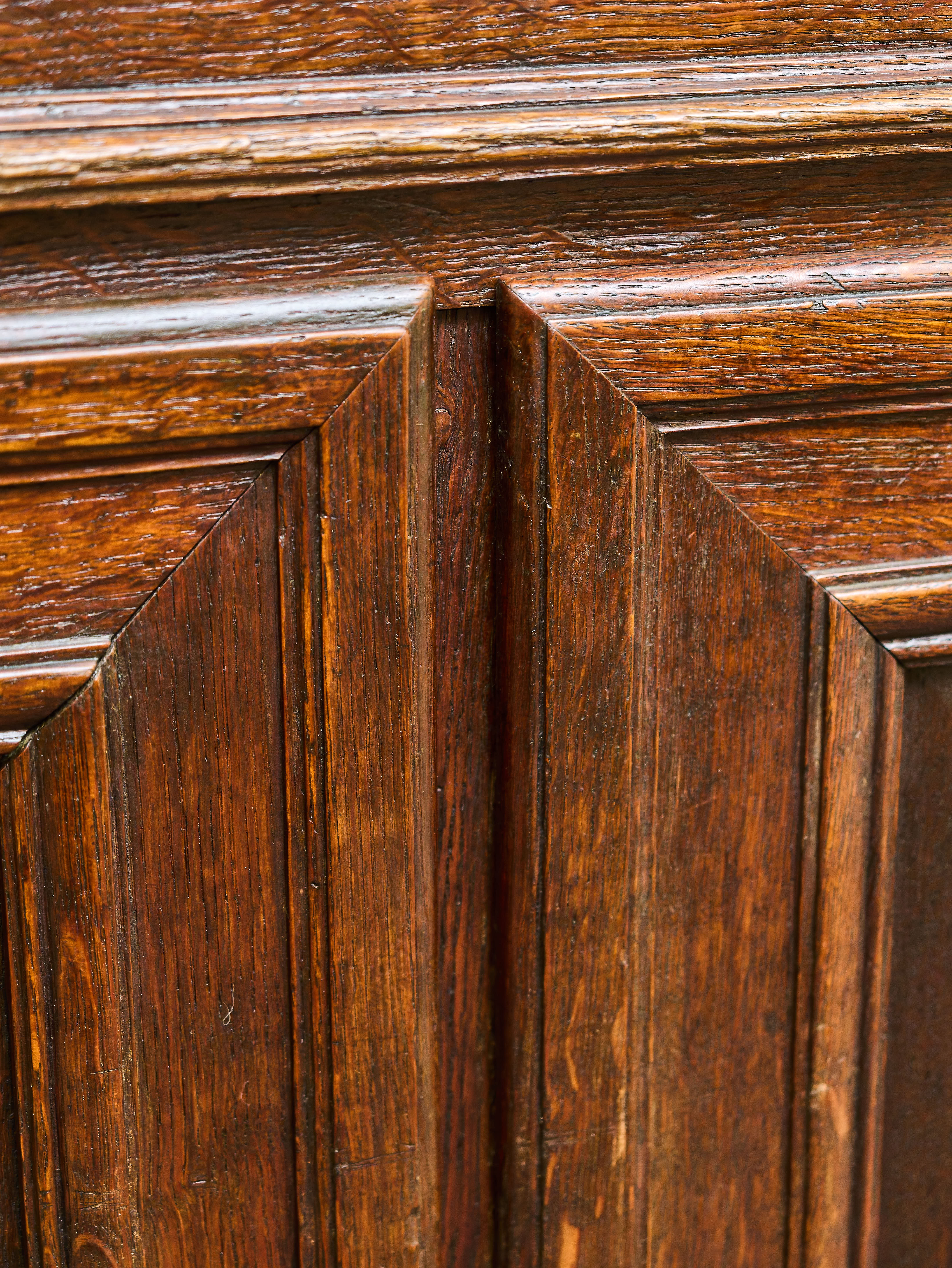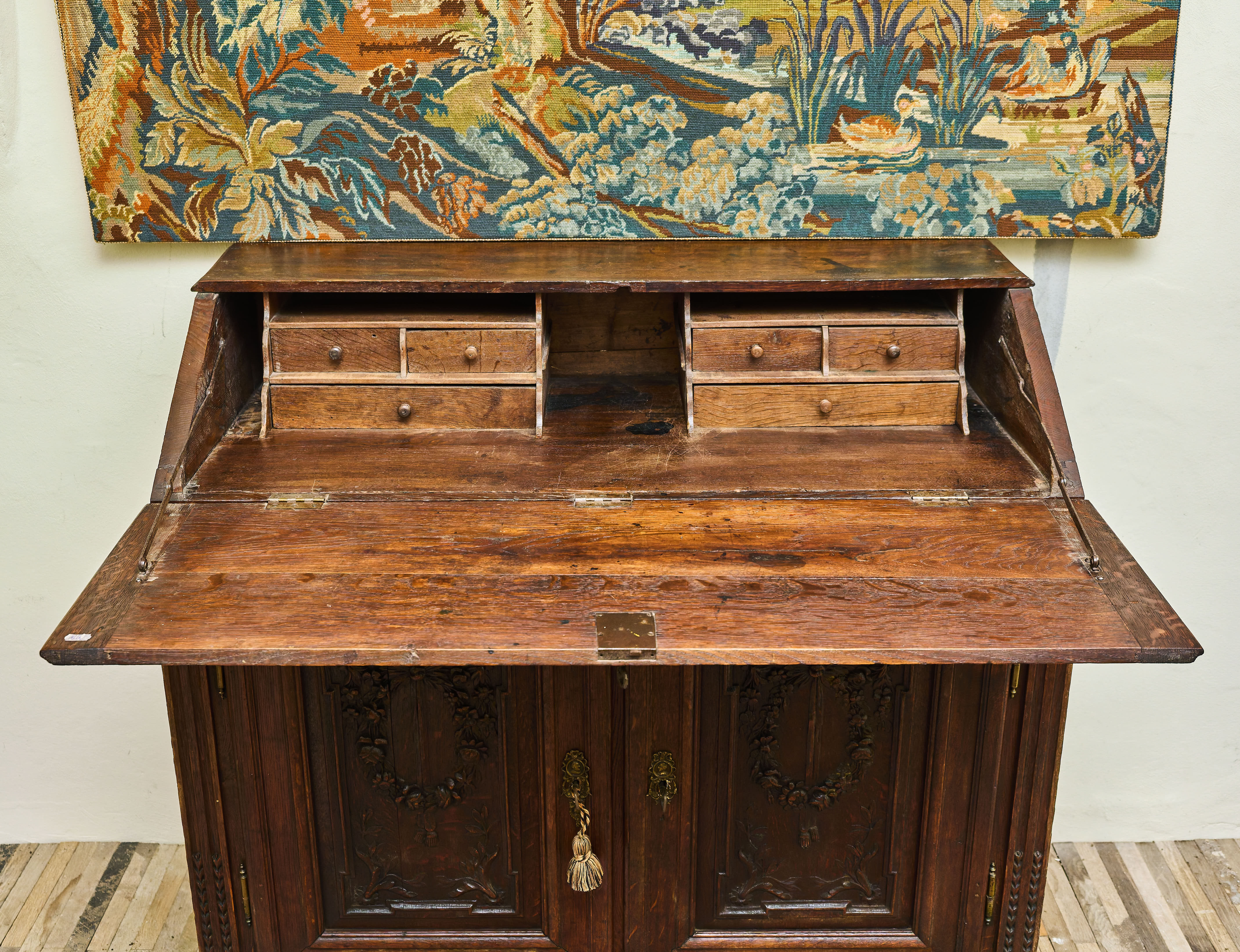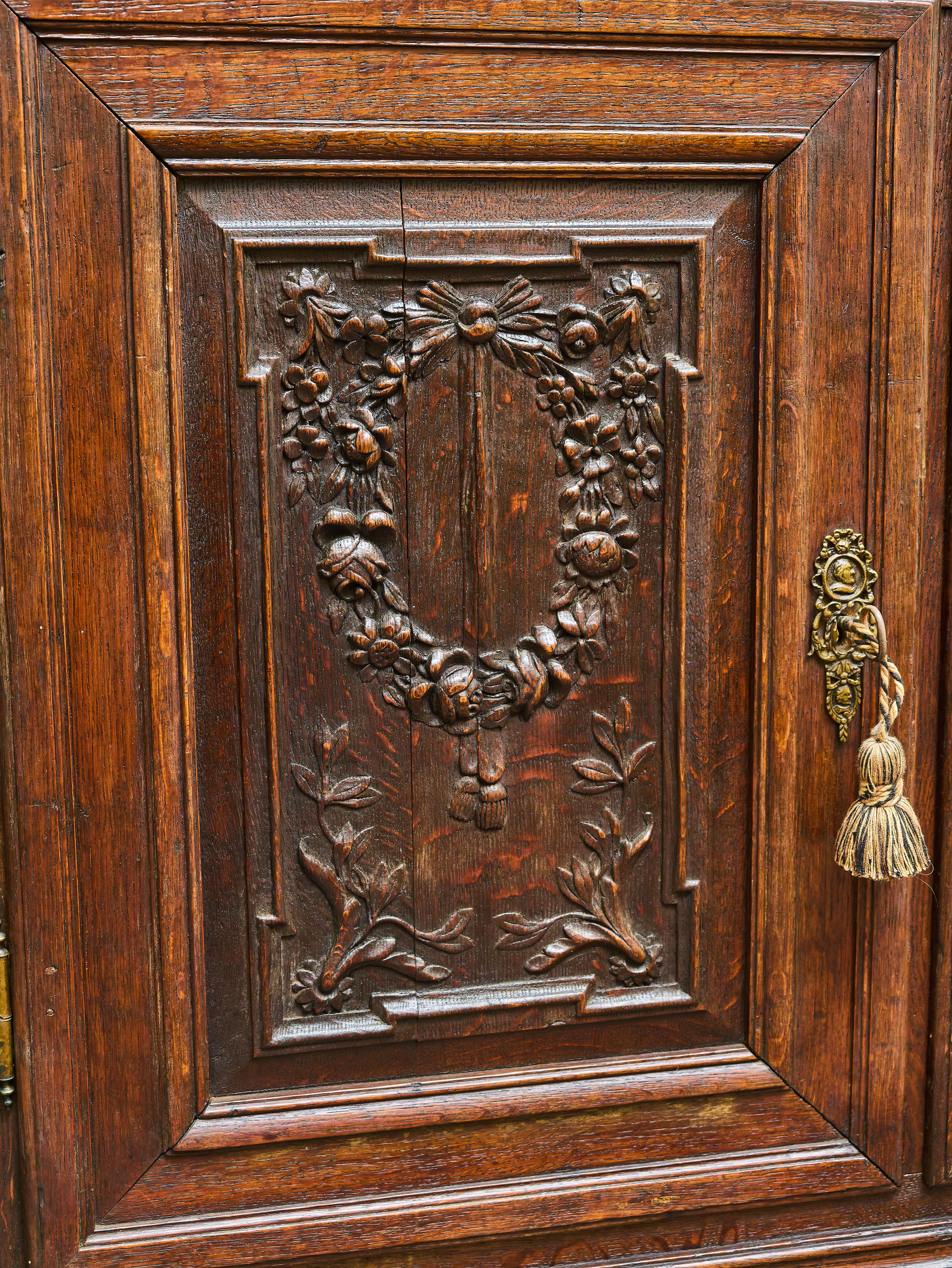 Elegantní klasicistní komoda se sekretářem z druhé poloviny 18. století, vyrobená z masivního dubového dřeva. Horní výklopná deska odkrývá původní pracovní plochu se soustavou drobných zásuvek a přihrádek, typických pro tehdejší psací nábytek. Bohatá řezbářská výzdoba s motivy vavřínových věnců, rostlinných ornamentů a plastických girland doplněná původním mosazným kováním s profilovými hlavami dodává kusu jedinečný charakter.