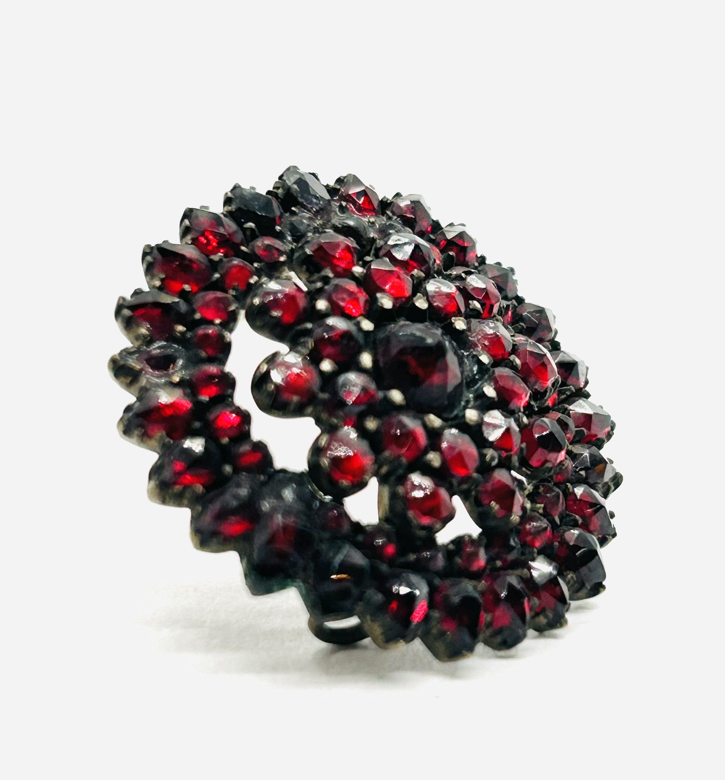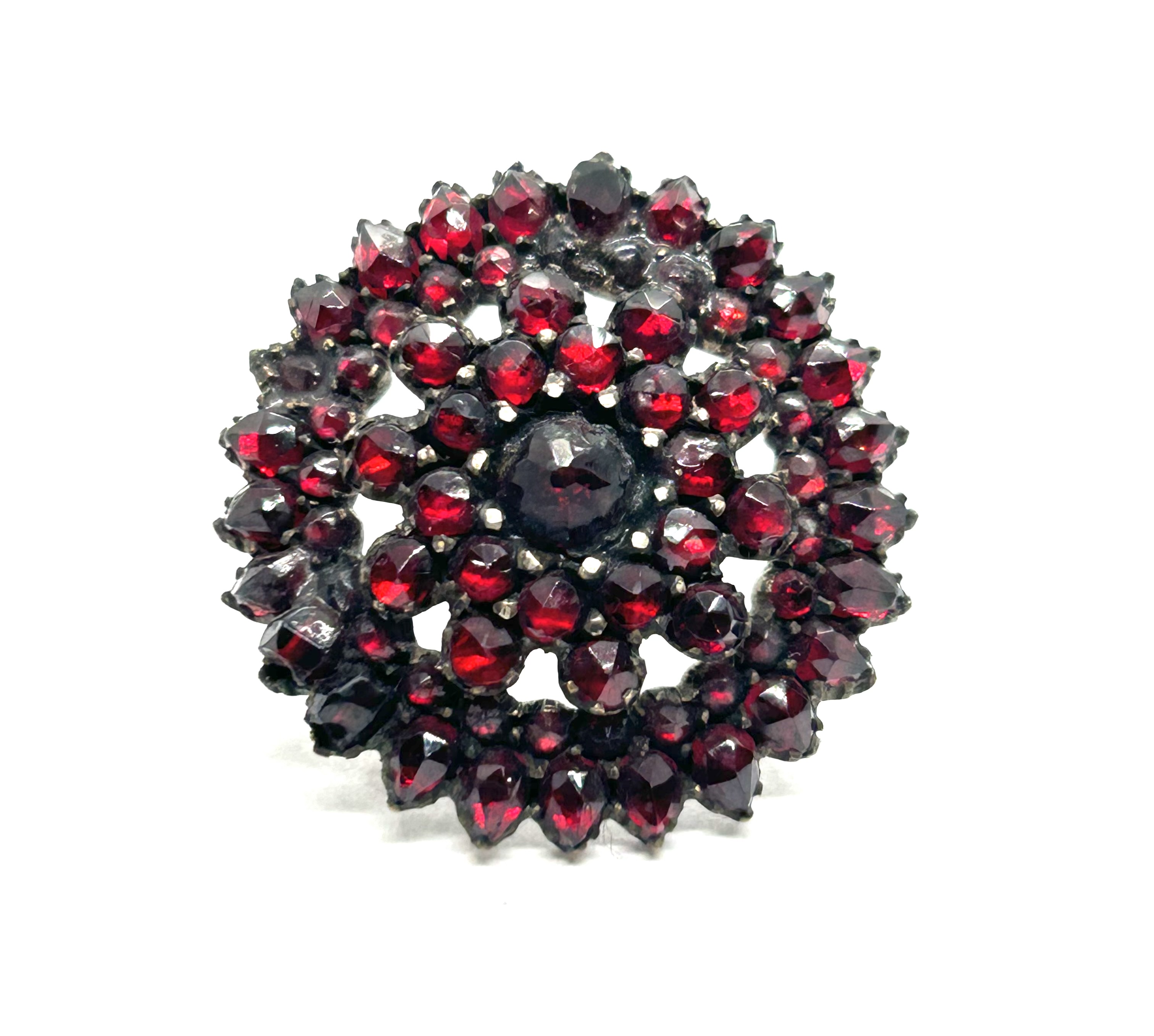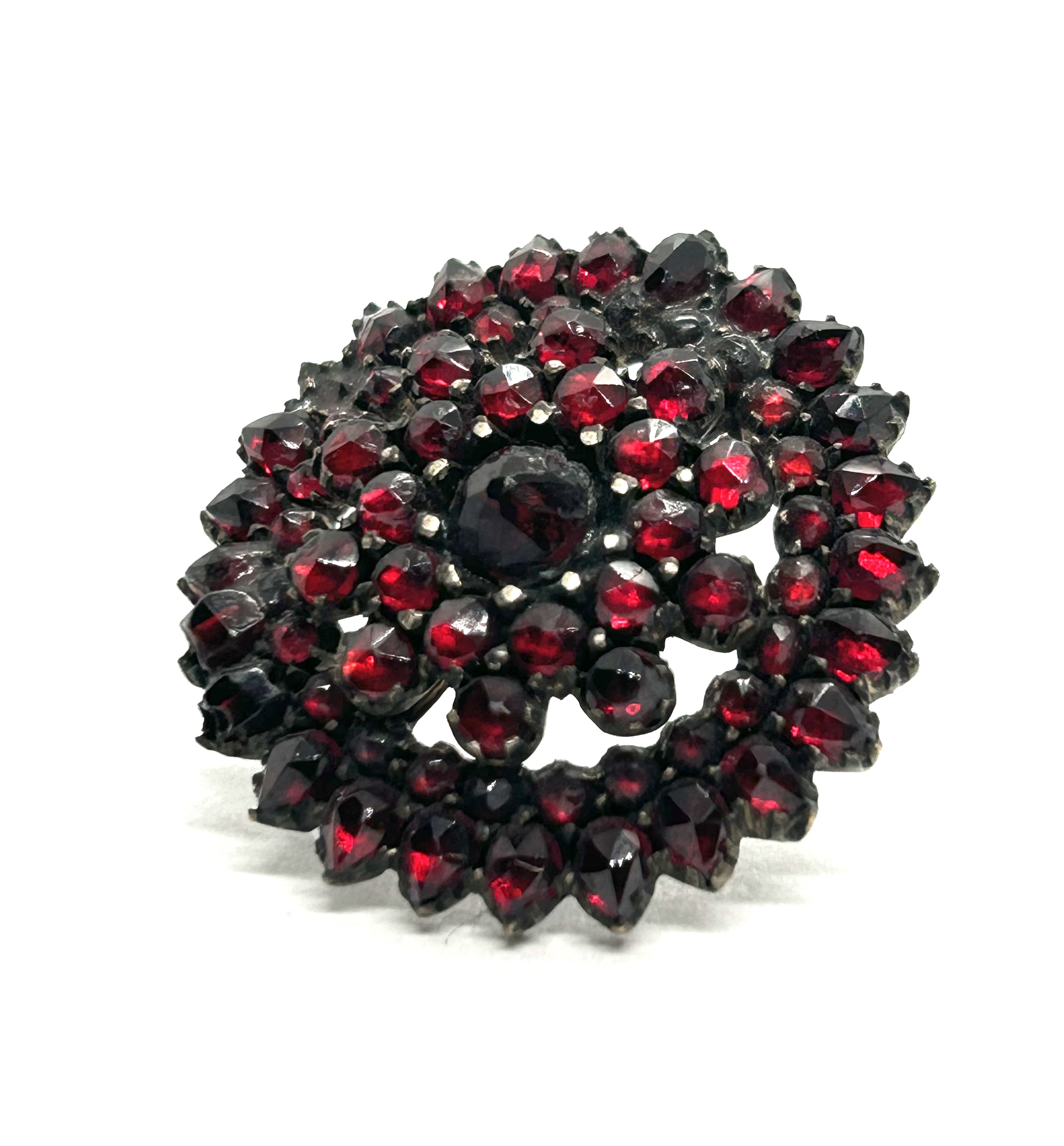 Klasická brož z českých granátů zasazených v tombaku připomínající ozdoby našich předků přichází opět do módy, cca rok 1900, Rakousko-Uhersko, Čechy; btto 6,0 g, průměr 3 cm. Brož je i přes své stáří v dobrém stavu.